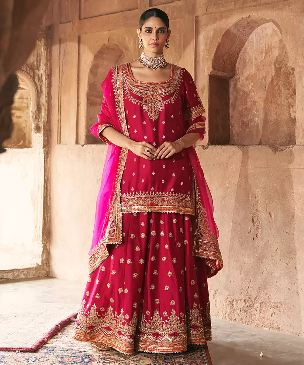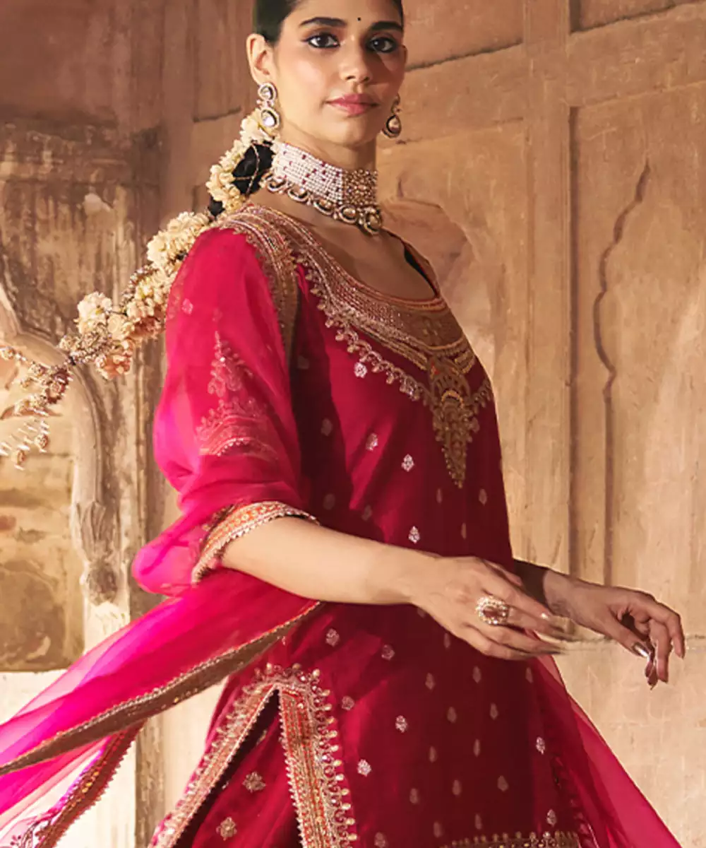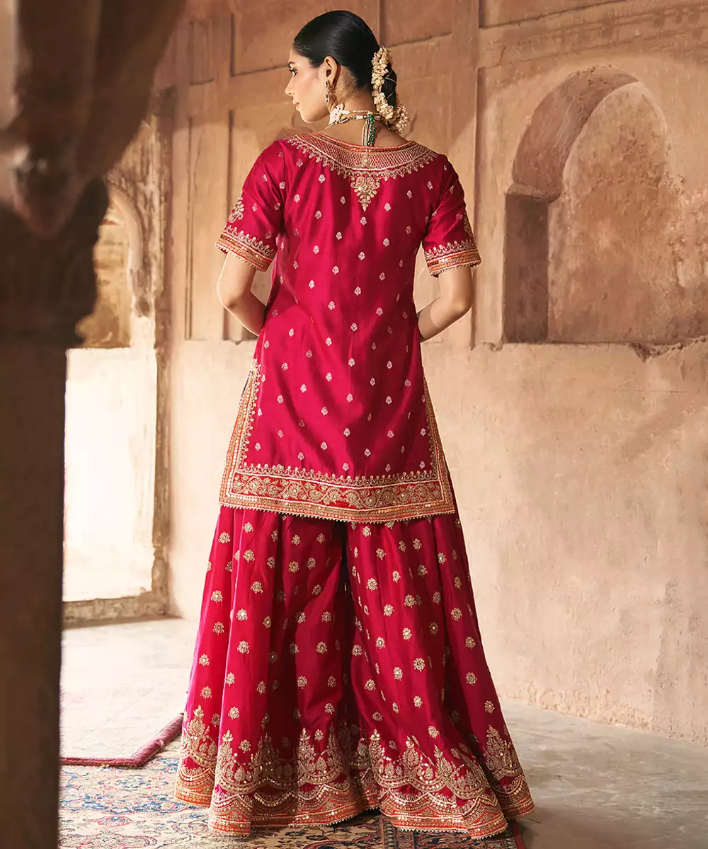 This Graceful Ensemble Features A Pure Banarasi Short Kurta With A Broad Deep Scoop Neckline, Zero Back, And Elbow Sleeves. Paired With A Sharara Adorned With A Broad Border And Embroidered Bootis, And A Silk Organza Dupatta, The Set Is Embellished With Kashmiri Tilla And Gota Patti Embroidery, Highlighted With Pearls And Sequins. Finished With Delicate Gota Detailing, This Outfit Exudes Timeless Elegance.