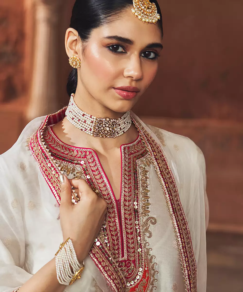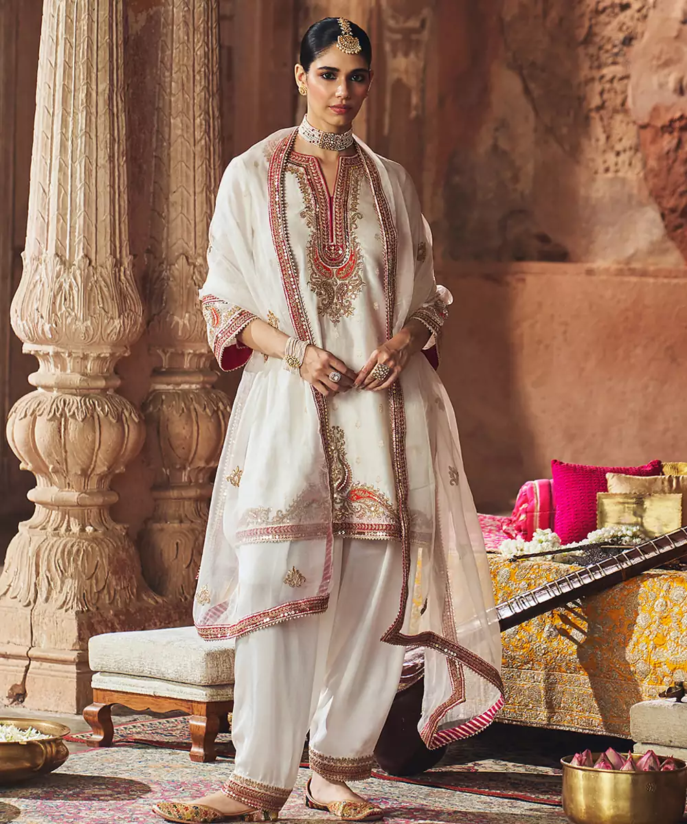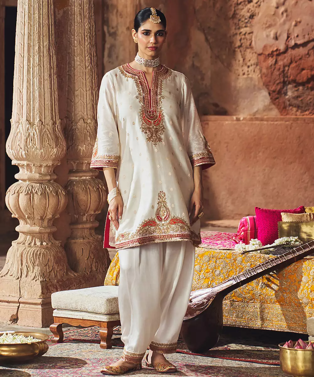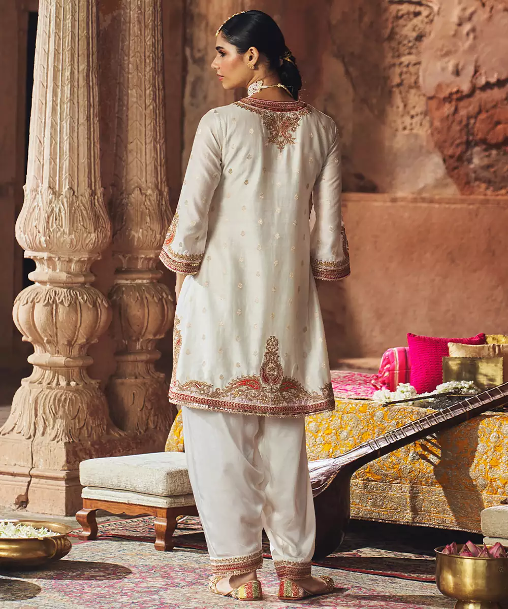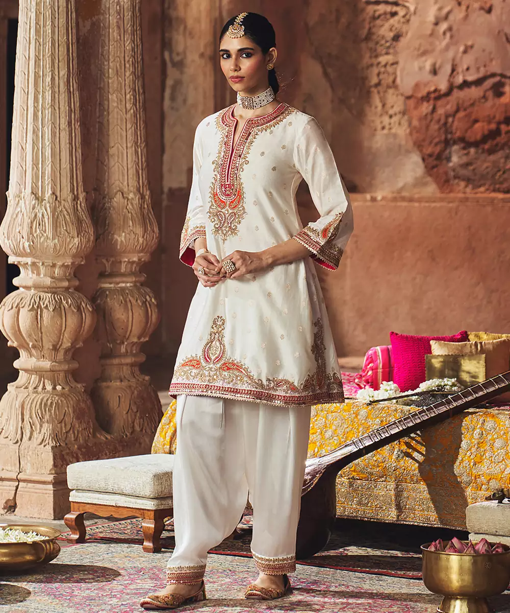 This Elegant Short A Line Kurta Crafted In Pure Silk Banarasi, Paired With A Traditional Dogri Salwar And A Silk Organza Dupatta. The Kurta Features A Zero Neckline With Slit And Elegant Bell Sleeves. The Ensemble Is Adorned With Intricate Kashmiri Tilla And Gota Patti Embroidery, Highlighted With Pearls And Sequins, And Finished With Delicate Gota Detailing.