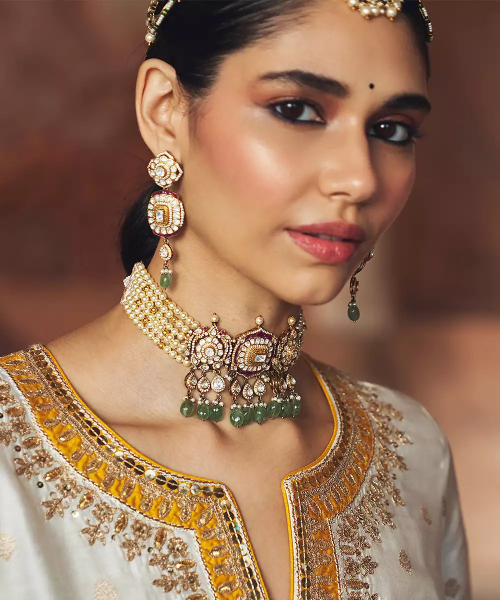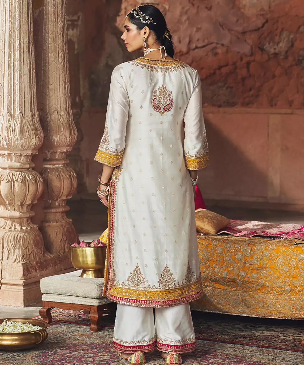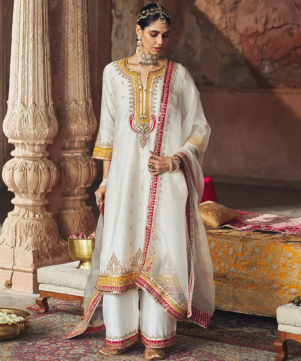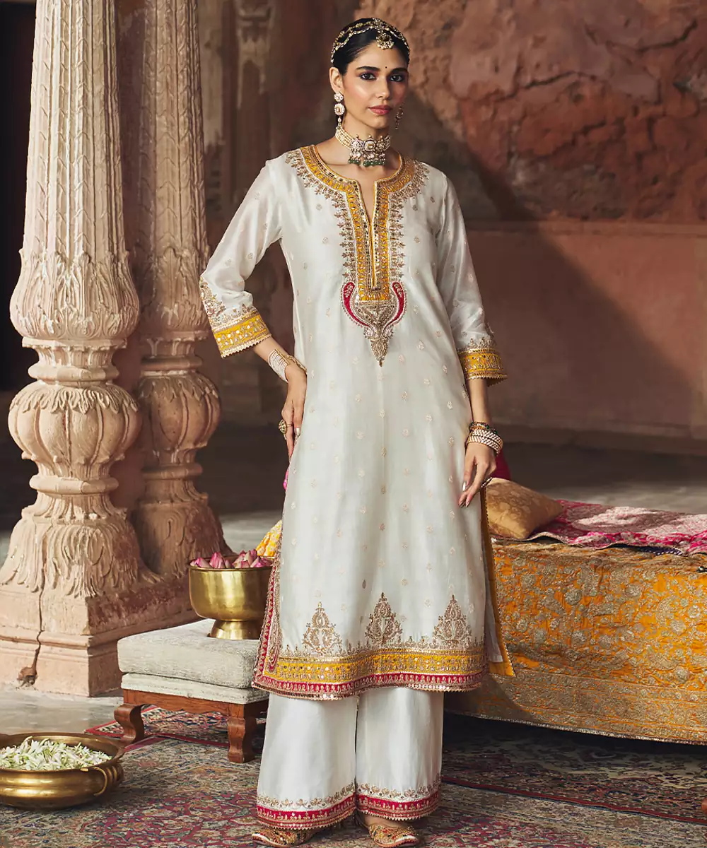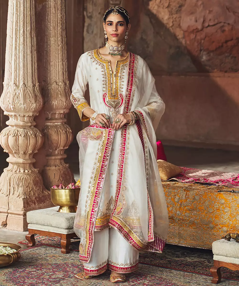 A Graceful Long A Line Kurta Paired With Palazzos And A Silk Organza Dupatta. The Kurta Features A Zero Neckline With Placket And Three Quarter Sleeves. Adorned With Intricate Kashmiri Tilla And Gota Patti Embroidery, Highlighted With Pearls And Sequins, The Ensemble Is Beautifully Finished With Delicate Gota Detailing.