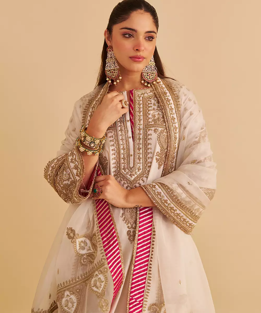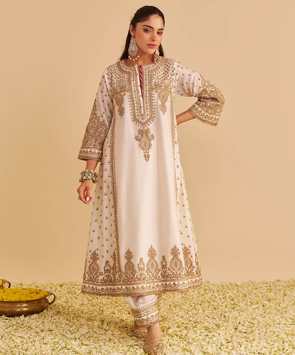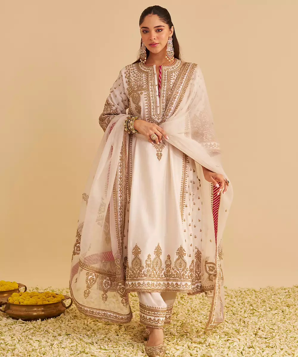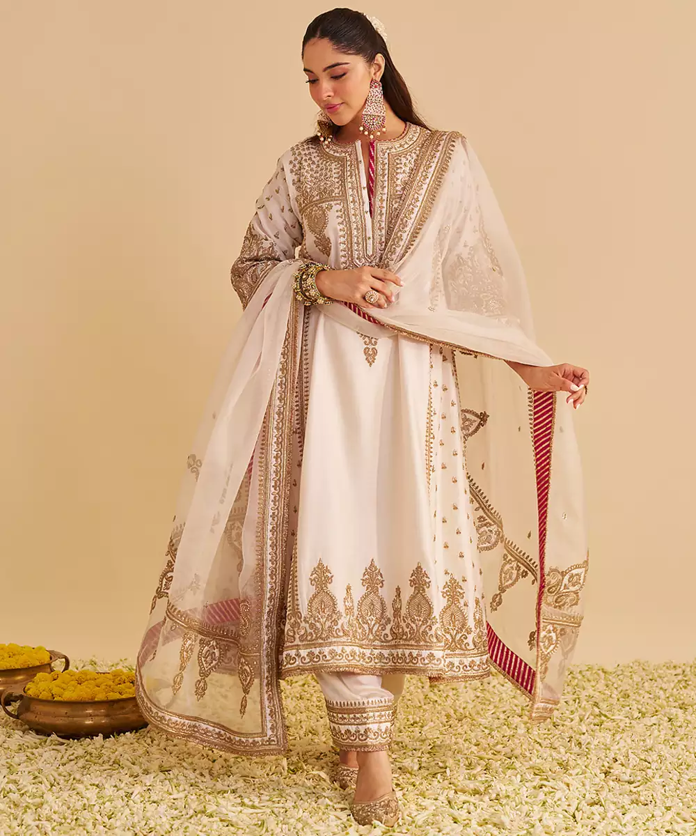 This Ivory Embroidered Silk Kurta Set With Dupatta Exudes Elegance And Festive Sophistication. Crafted From Luxurious Silk, It Features Intricate Embroidery That Enhances Its Refined Appeal. The Gracefully Tailored Kurta Paired With Coordinated Bottoms And A Matching Dupatta Creates A Regal Silhouette, Perfect For Weddings, Celebrations, Or Special Occasions.