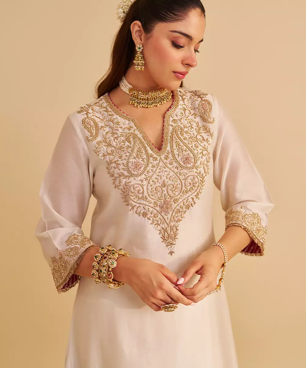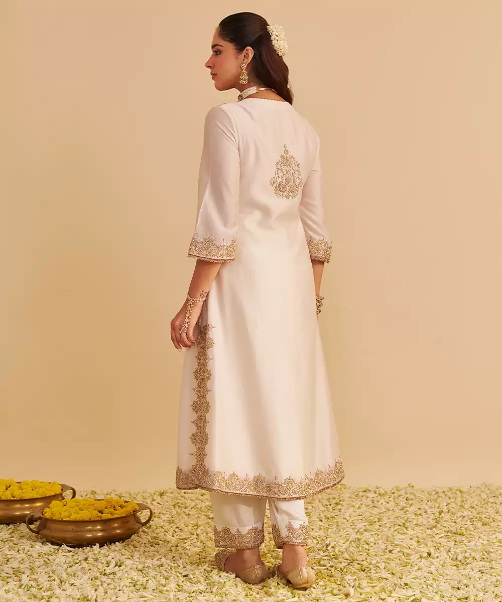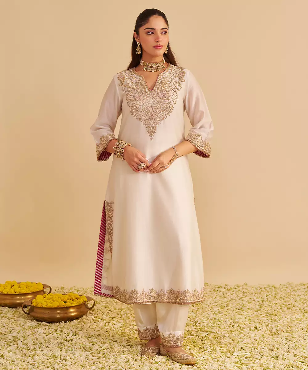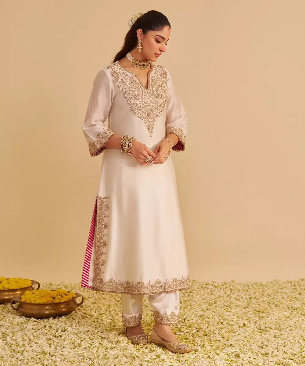 This Ivory Embroidered Silk Kurta Set Exudes Elegance And Festive Charm. Crafted From Luxurious Silk, It Features Intricate Embroidery That Enhances Its Refined Appeal. The Gracefully Tailored Kurta Paired With Coordinated Bottoms Creates A Polished Silhouette, Making It Perfect For Weddings, Celebrations, Or Special Occasions With Timeless Sophistication.