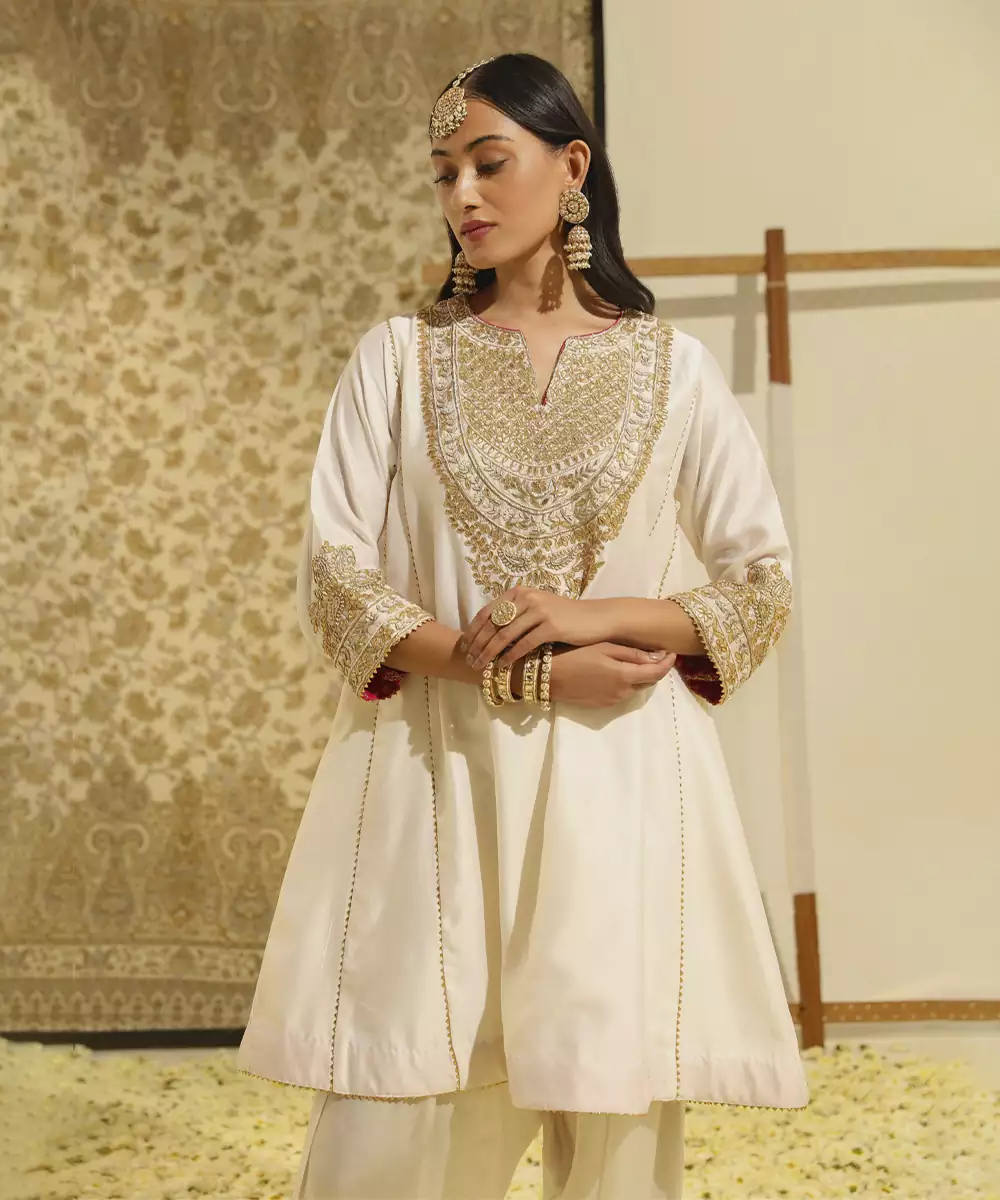 The Fayaaz Ensemble Showcases Intricate Hand Work On Pure Silk Chanderi Fabric. This Luxurious And Comfortable Fabric Is Embellished With Gota Patti And Dabka Zardozi Embroidery. It Includes A Zero Neck With A Slit And Three Quarter Sleeves. The Ensemble Is Accented With Pearls And Finished With A Chanderi Silk Banarsi Fabric.