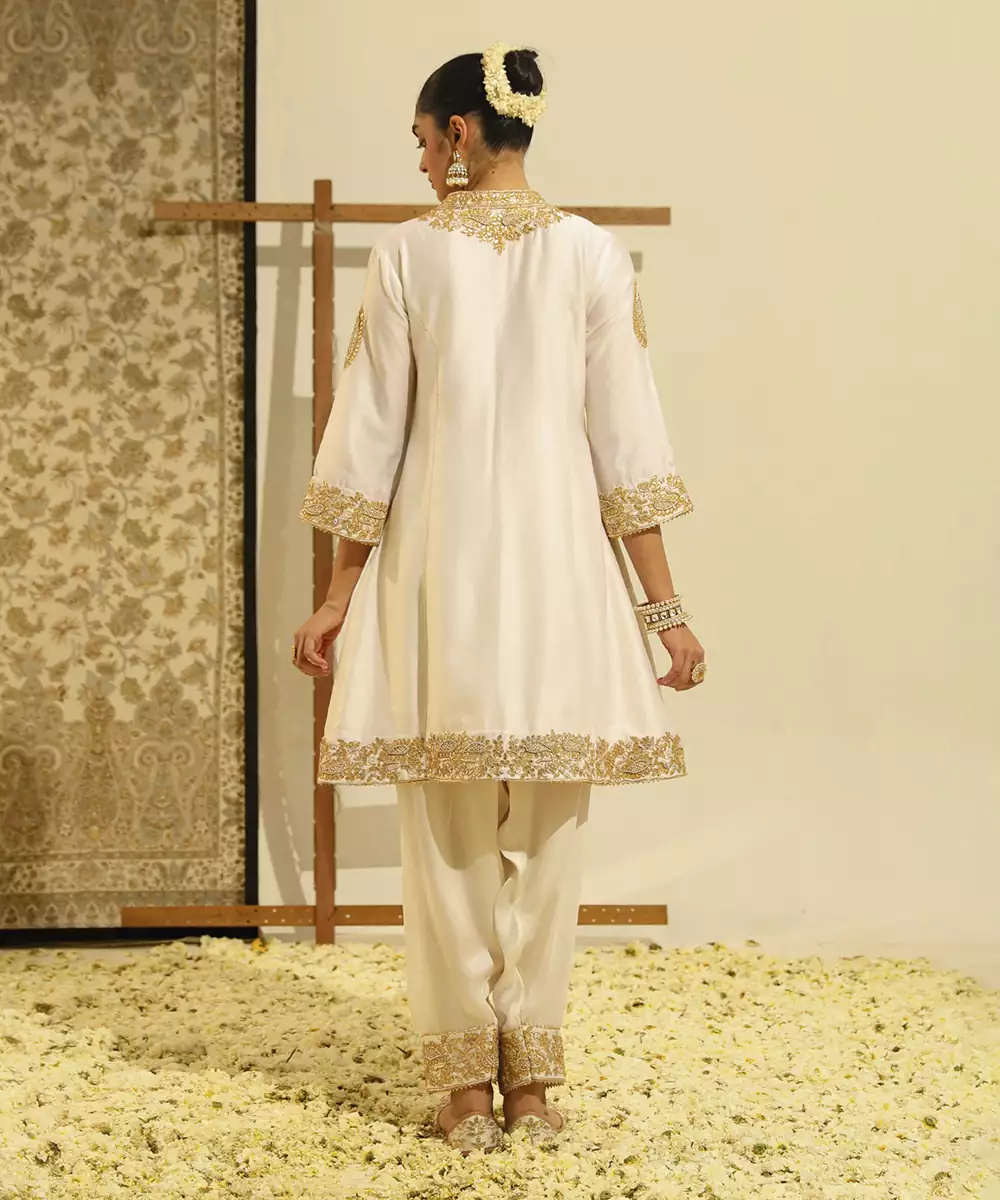 The Rajak Ensemble Showcases Intricate Hand Work On A Princess Cut Silhouette. This Luxurious And Comfortable Fabric Is Embellished With Heritage Gota Patti And Dabka Zardozi Embroidery. It Features A Mandarin Collar With A Placket And Three Quarter Sleeves. The Look Comes Together With A Salwar & A Silk Organza Tissue Dupatta. The Ensemble Is Accented With Gota And Finished With An Exclusive Chanderi Silk Banarsi Fabric.