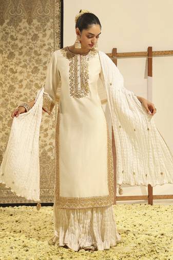 The Shahnawaz Ensemble Showcases Intricate Hand Work On A Long Straight Kurta On Pure Silk Chanderi Fabric. This Luxurious And Comfortable Fabric Is Embellished With Heritage Gota Patti And Dabka Zardozi Embroidery. It Features A Crushed Silk Skirt And Crushed Dupatta. The Look Comes Together A Deep V Neckline At The Front, A Zero Neck At The Back And Elbow Sleeves. The Dupatta Is Accented With Gota On Both Sides And The Outfit Is Finished With An Exclusive Chanderi Silk Banarsi Fabric.