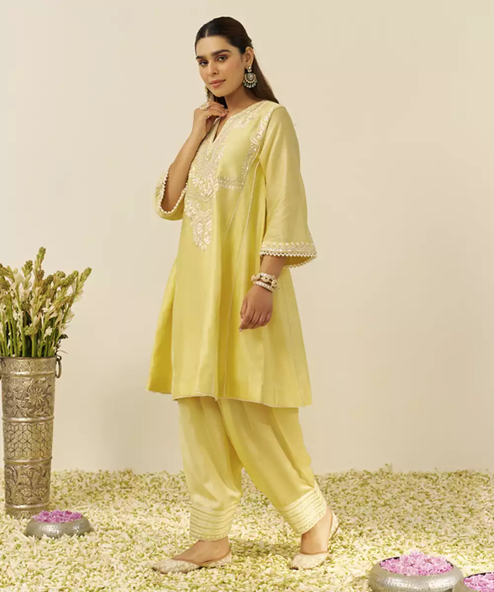 Lemon Yellow Aiza Short Chauga With Salwar And Dupatta Kurta Chanderi Silk; Bottom Bamberg Satin; Dupatta Silk Organza 1 Chauga / 1 Salwar / 1 Dupatta