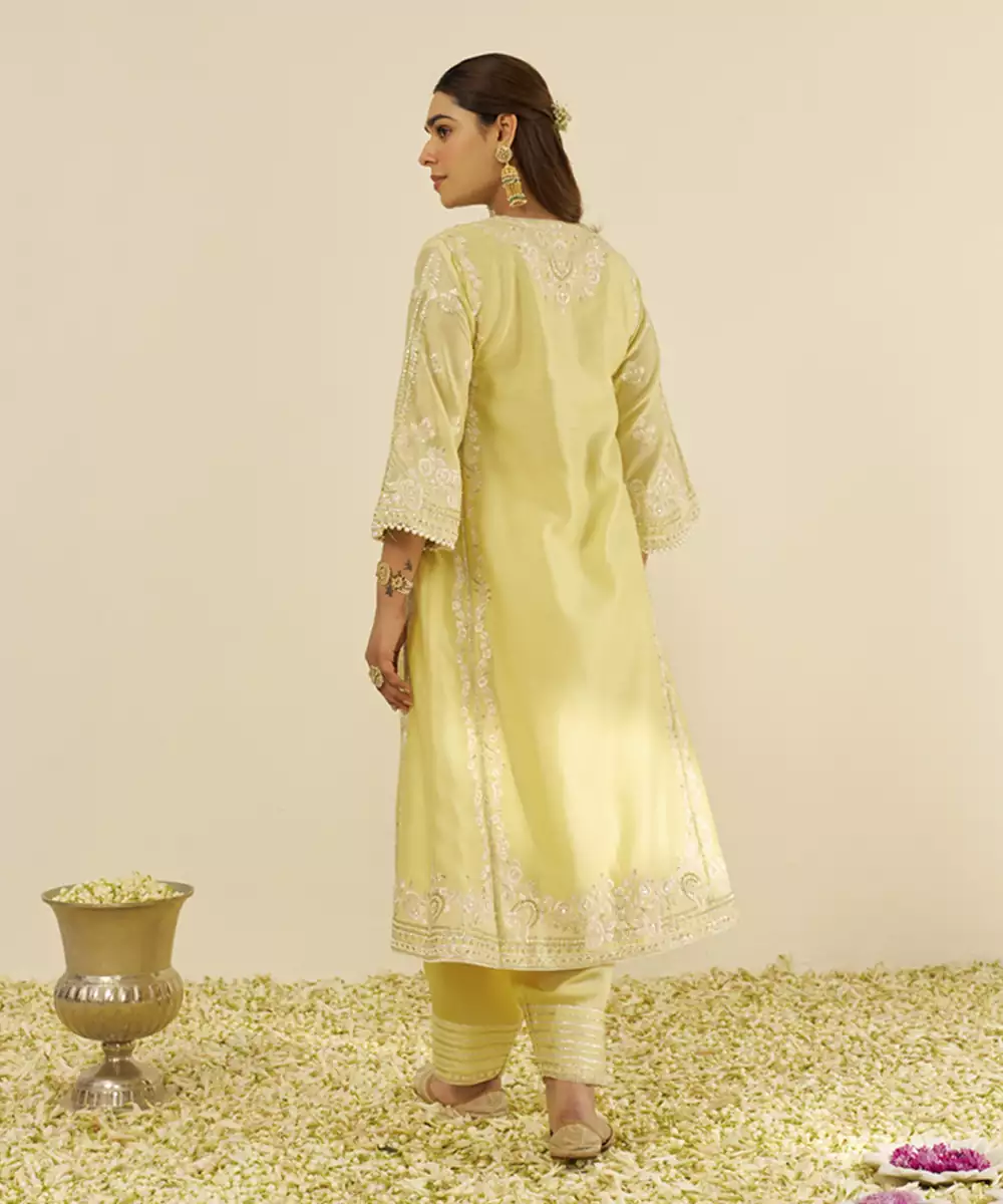 Lemon Yellow Maziya Long Chauga With Salwar And Dupatta Kurta Chanderi Silk; Bottom Bamberg Satin; Dupatta Silk Organza 1 Chauga / 1 Salwar / 1 Dupatta