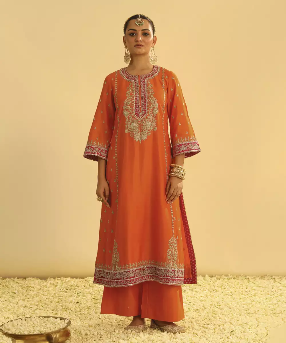 The Mayra Ensemble, Crafted From Luxurious Silk Chanderi, Features Our Signature Heritage Kashmiri Tilla Embroidery. It Is Meticulously Adorned With Appliqué, Gota And Kundan Work. It Features A Zero Neck With Placket, Three Quarter Sleeves And Is Paired With A Straight Palazzo And Dupatta. It Makes Use Of Chanderi Silk Banarsi Fabric For The Final Touch.