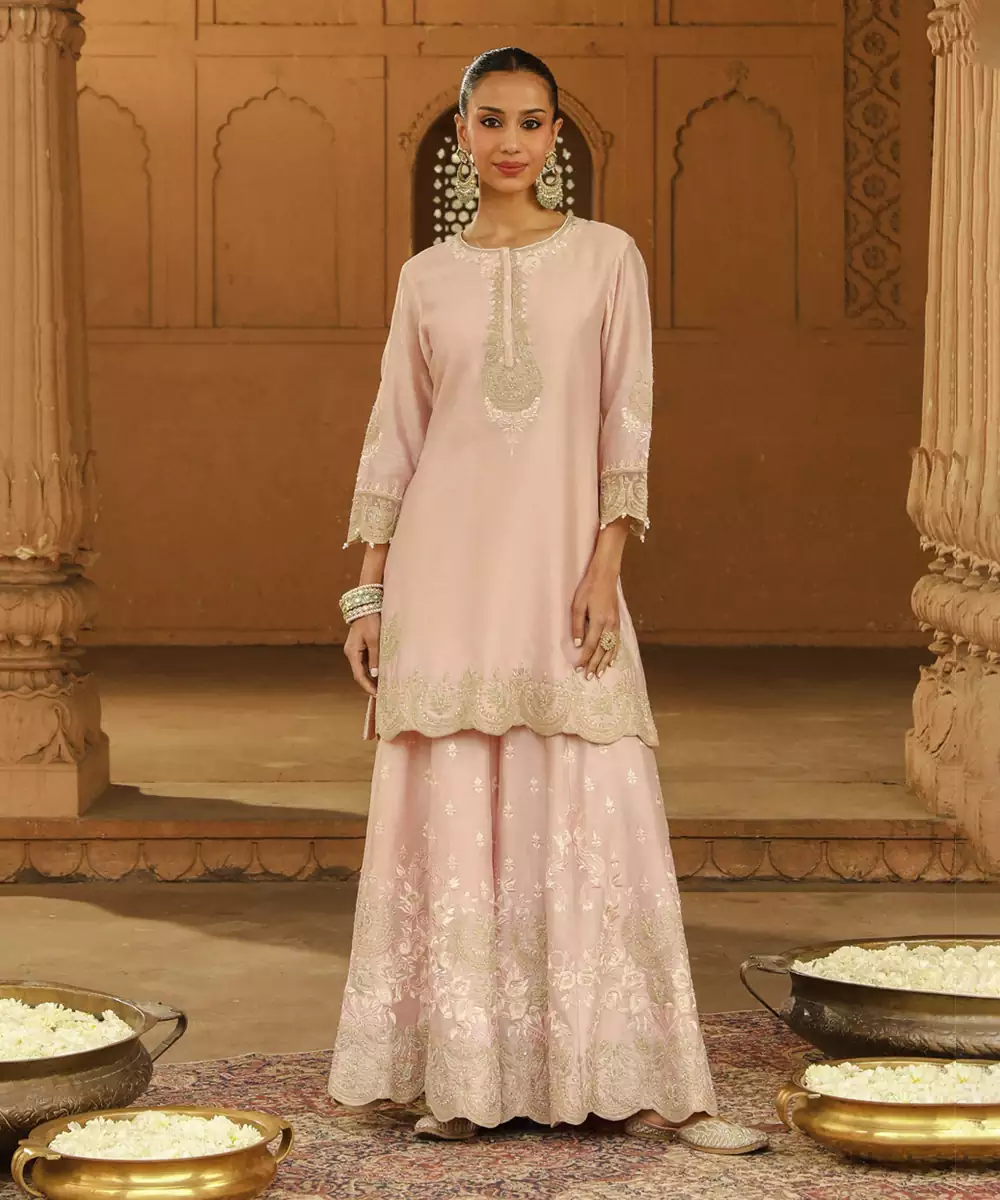 The Short Straight Kurta Set Is Made In Pure Silk Chanderi And Teamed Up With A Silk Organza Dupatta. The Kurta Is Having A Zero Neck With Placket At Front, A Zero Back And Three Quarter Sleeves. The Sharara Is Having A Border With Jaal. The Outfit Is Adorned With Kashmiri Tilla And Parsi Gara Embroidery Highlighted With Basra Moti. The Sleeevs Is Having An Orgazna Detailing With Pearls. The Outfit Is Finished With Scallop Detailing.