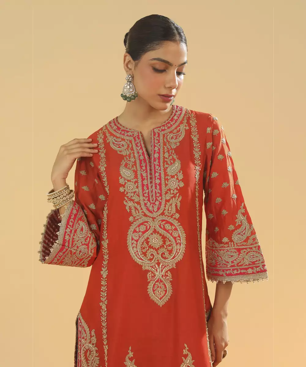 The Long A Line Ensemble Is Made In Pure Silk Chanderi Fabric Teamed Up With A Palazzo And A Silk Organza Dupatta. The Outfit Is Having A Zero Neck With Placket And Three Quarter Bell Sleeves. The Outfit Is Adorned With Exquisite Kirandori With Sitaara And Dabka Zardozi. The Outfit Is Finished With A Contrast Banarsi And Kinari.
