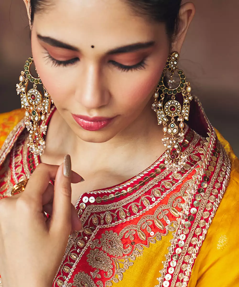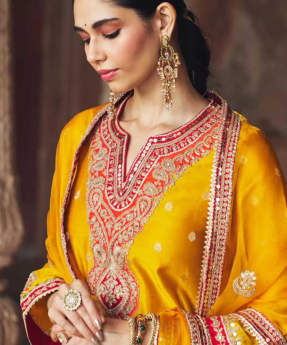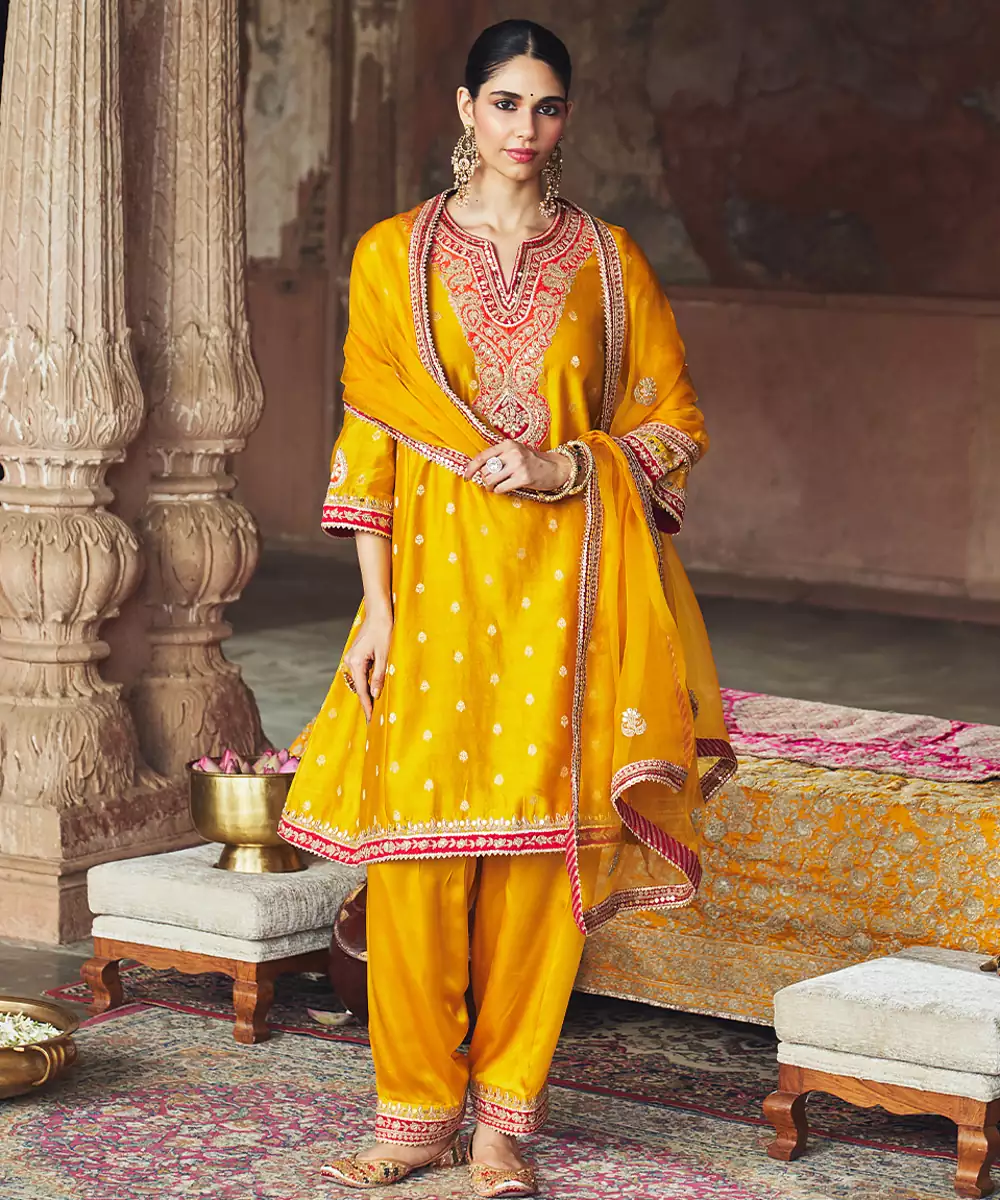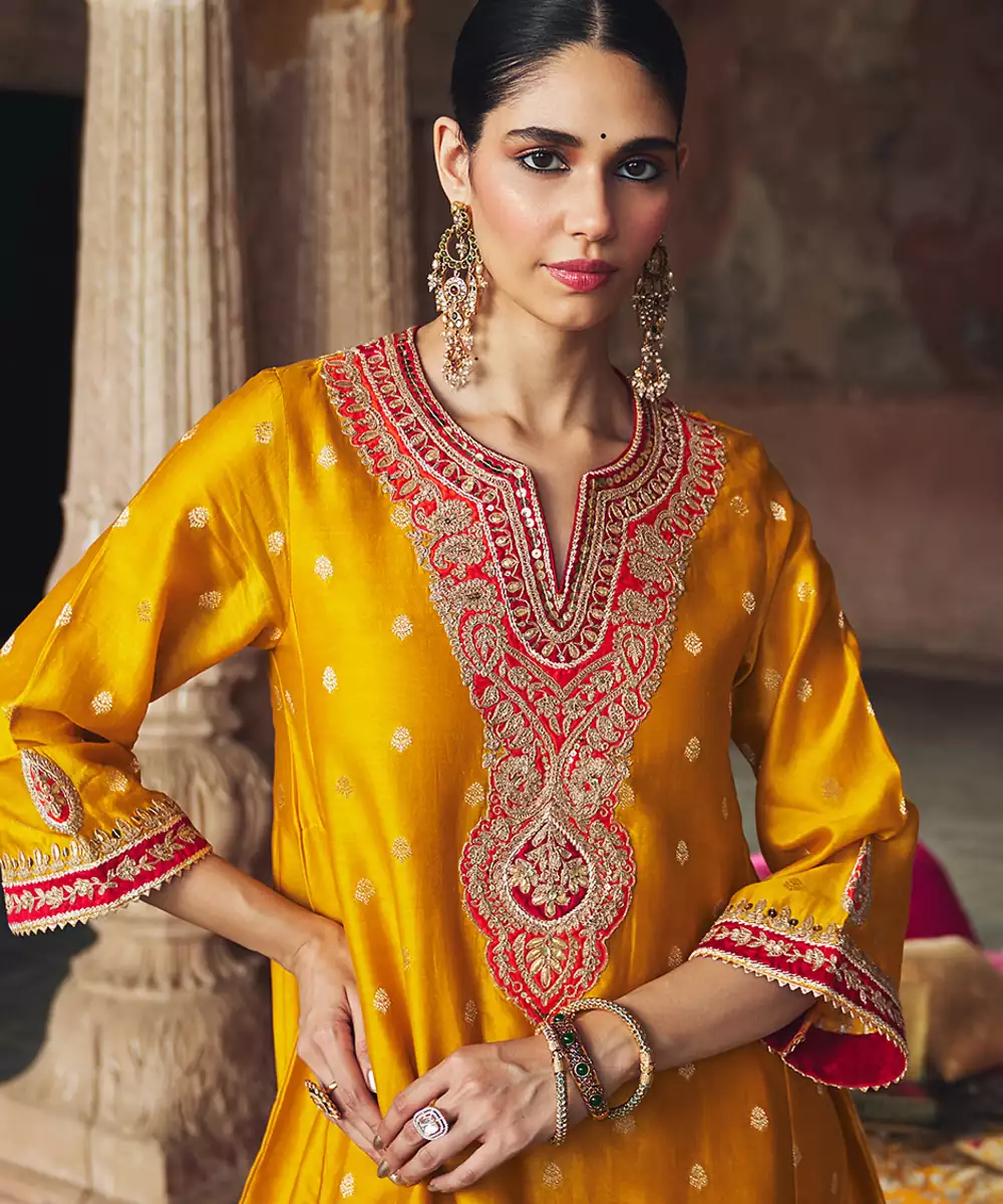 This Elegant Ensemble Is Crafted In Pure Silk Chanderi Banarasi And Paired With A Traditional Dogri Salwar. The Kurta Features A Zero Neckline With A Front Slit And Three Quarter Bell Sleeves. Adorned With Intricate Kashmiri Tilla And Gota Patti Embroidery, Highlighted With Pearls And Sequins, The Outfit Is Beautifully Finished With Delicate Gota Detailing.