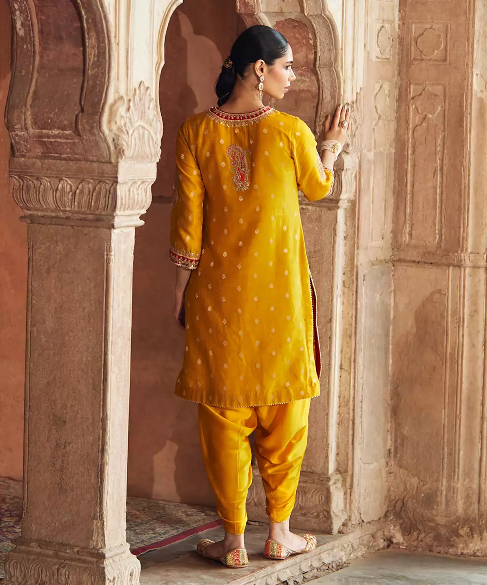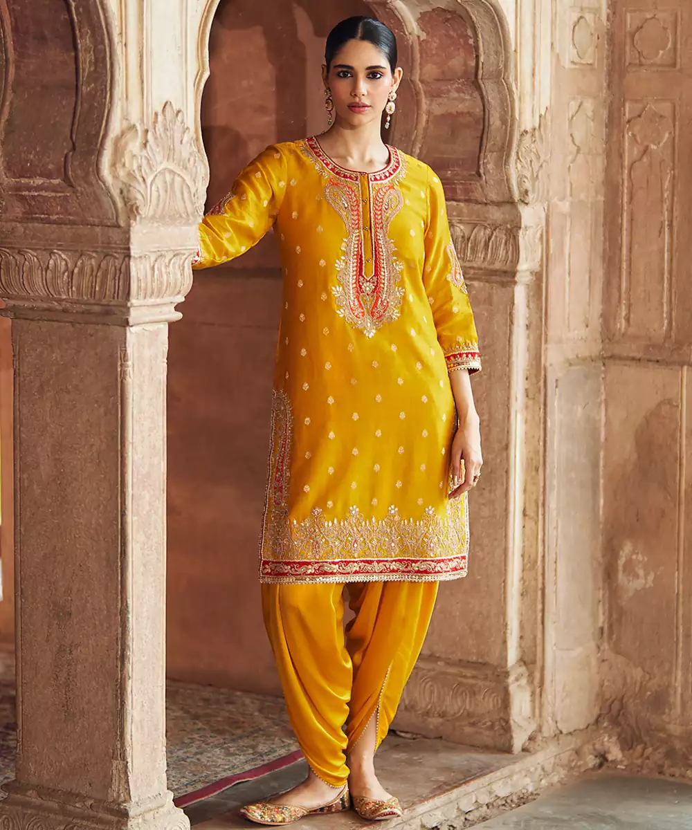 A Short Straight Kurta In Pure Silk Chanderi Banarasi, Paired With A Stylish Dhoti. Featuring A Zero Neckline With Placket And Three Quarter Bell Sleeves, The Outfit Is Adorned With Intricate Kashmiri Tilla And Gota Patti Embroidery, Highlighted With Pearls And Sequins. Finished With Delicate Gota Detailing For An Elegant Touch.