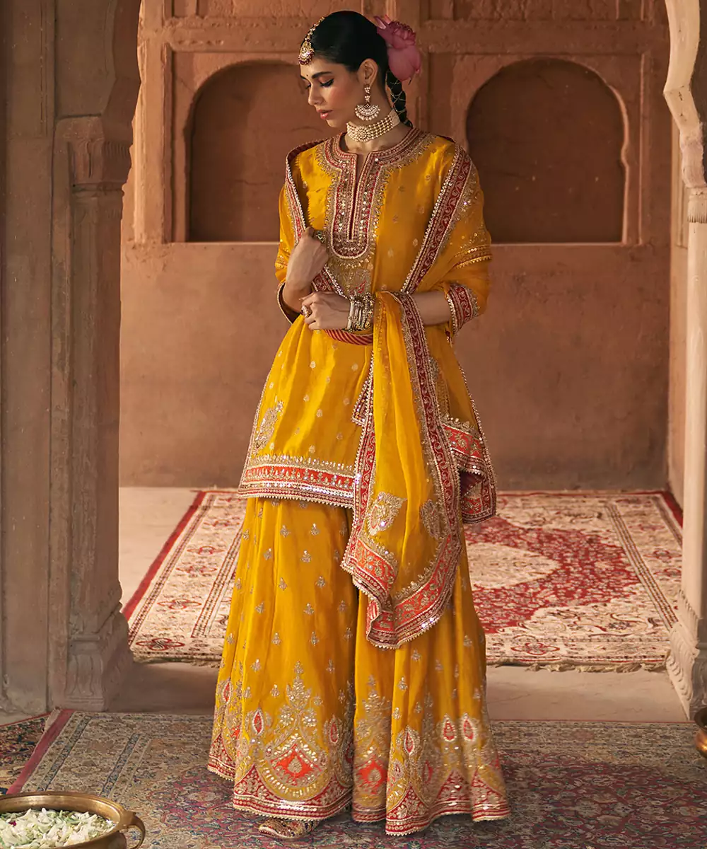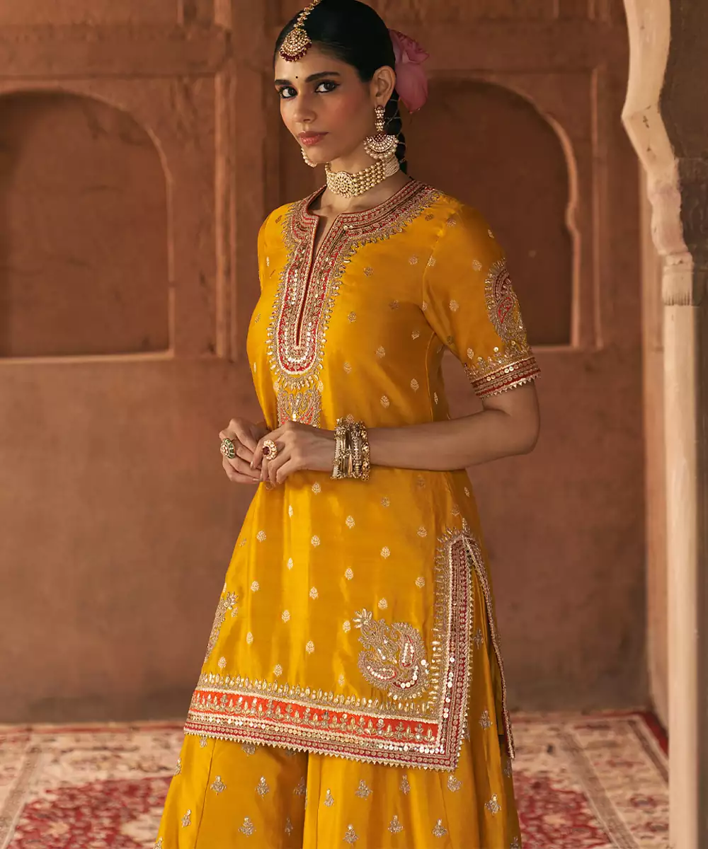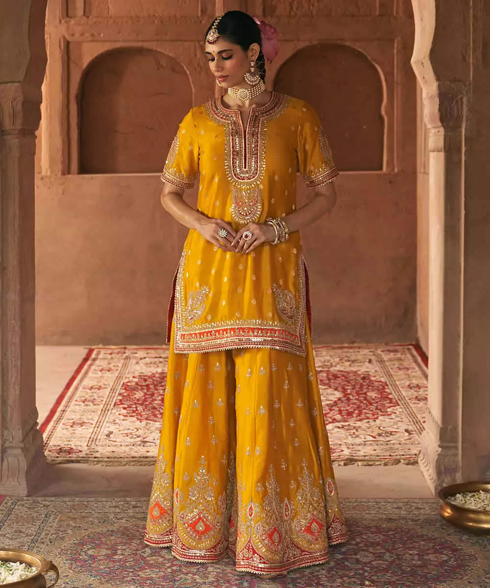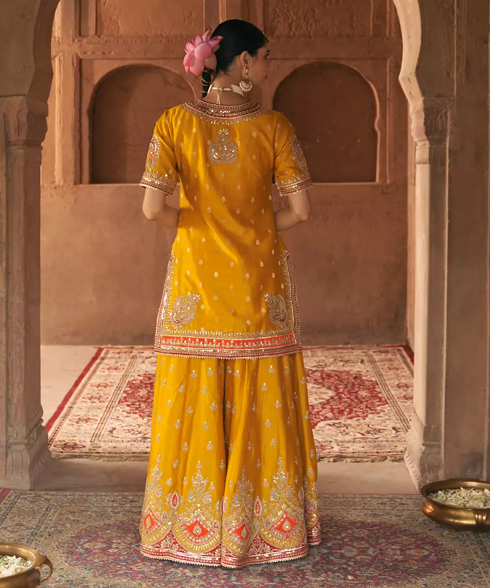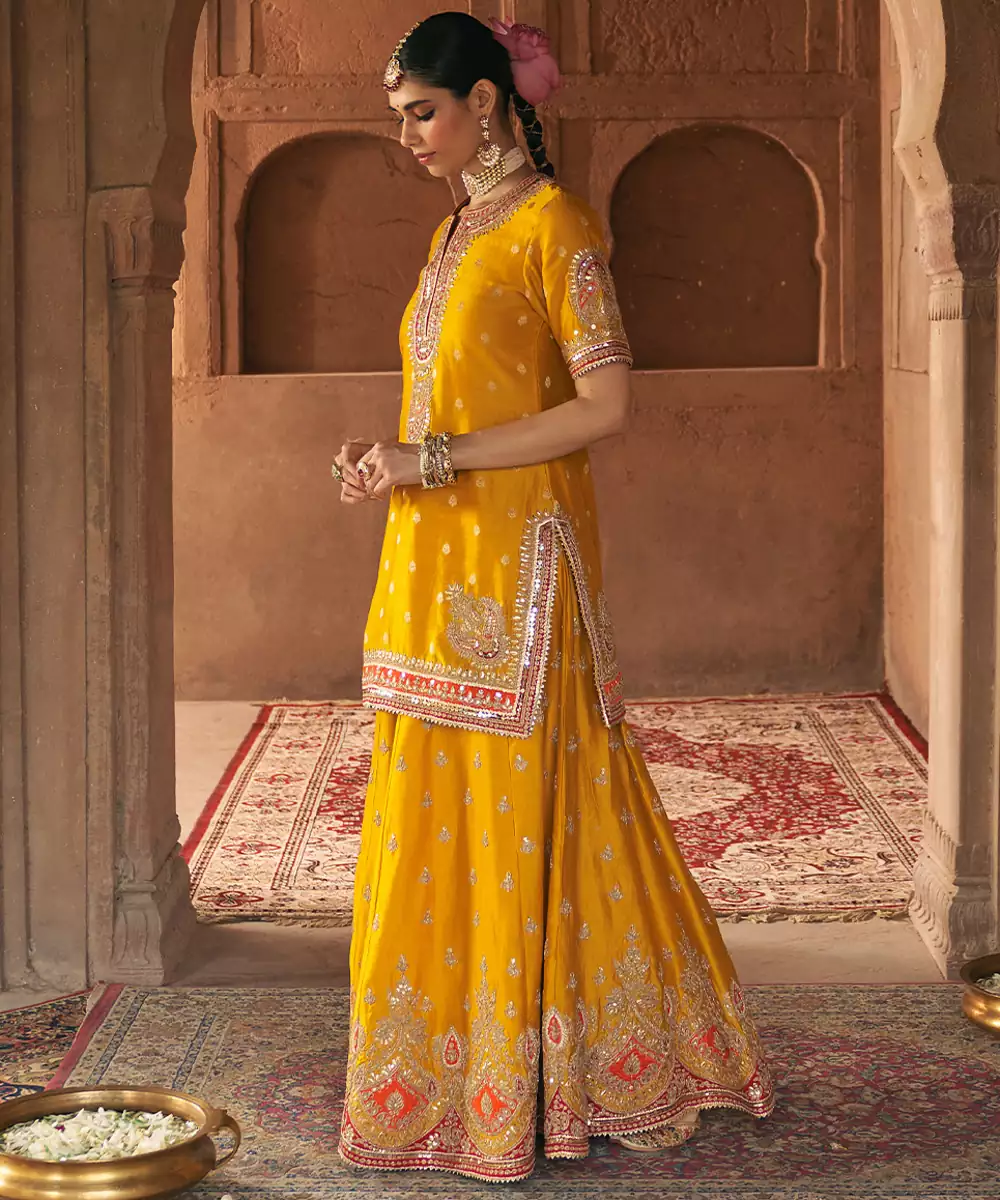 An Elegant Ensemble Featuring A Pure Banarasi Short Kurta With A Zero Neckline And Front Slit, Zero Back, And Elbow Sleeves. It Is Paired With A Sharara Showcasing A Broad Border And Embroidered Bootis, Along With A Beautifully Embroidered Silk Organza Dupatta. Adorned With Intricate Kashmiri Tilla And Gota Patti Embroidery, Highlighted With Pearls And Sequins, The Outfit Is Finished With Delicate Gota Detailing For A Regal Finish.