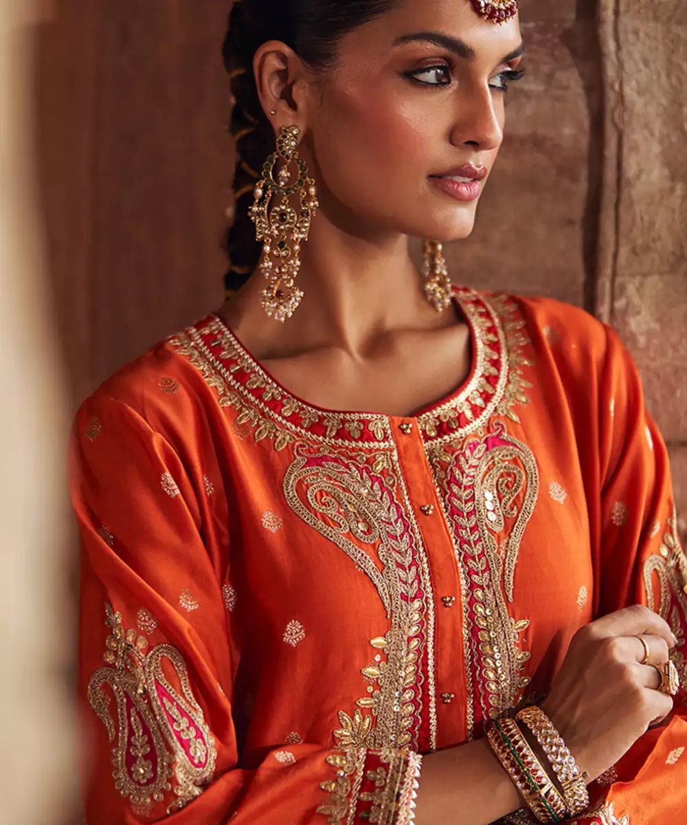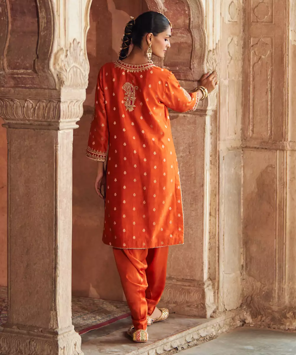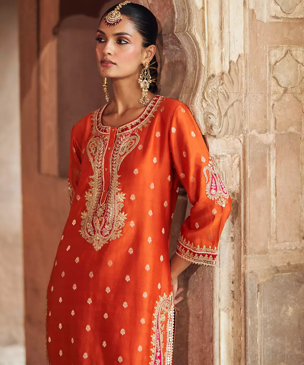 A Short Straight Kurta In Pure Silk Chanderi Banarasi, Paired With A Stylish Dhoti. Featuring A Zero Neckline With Placket And Three Quarter Bell Sleeves, The Outfit Is Adorned With Intricate Kashmiri Tilla And Gota Patti Embroidery, Highlighted With Pearls And Sequins. Finished With Delicate Gota Detailing For An Elegant Touch.