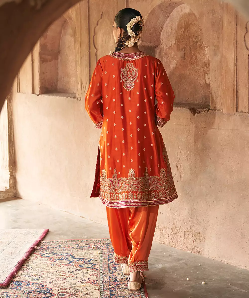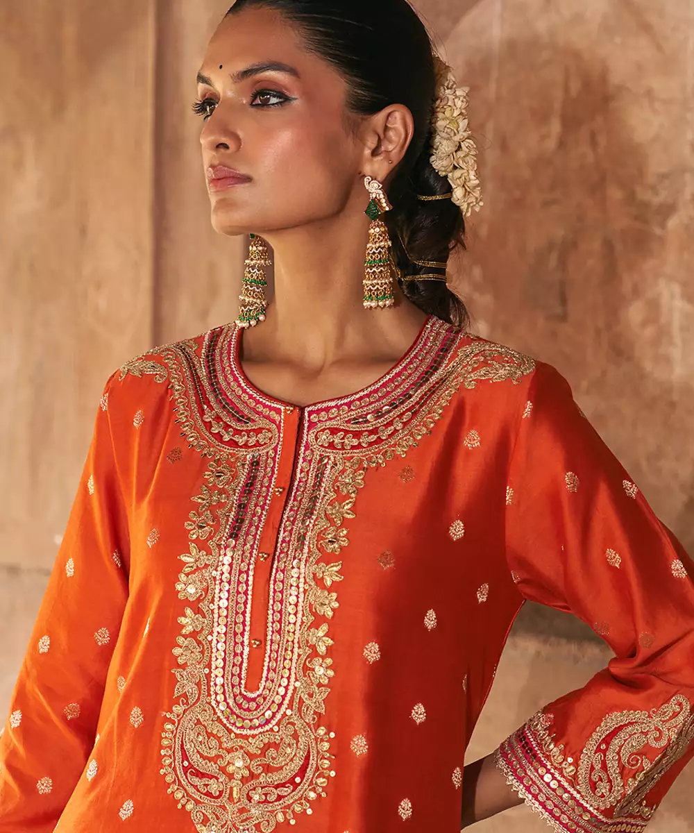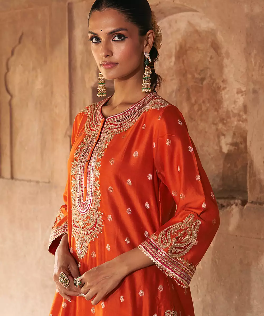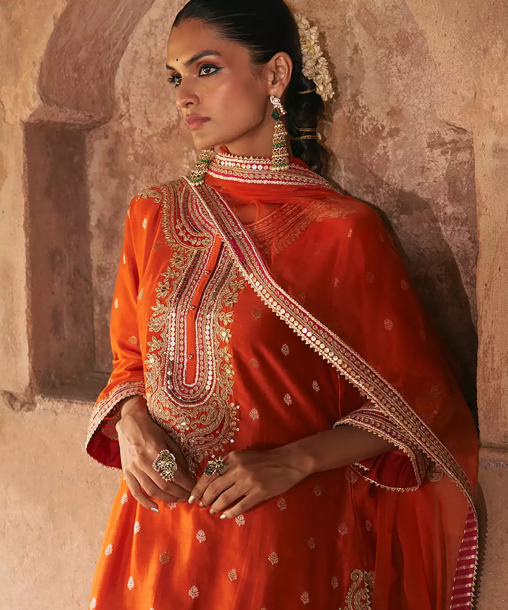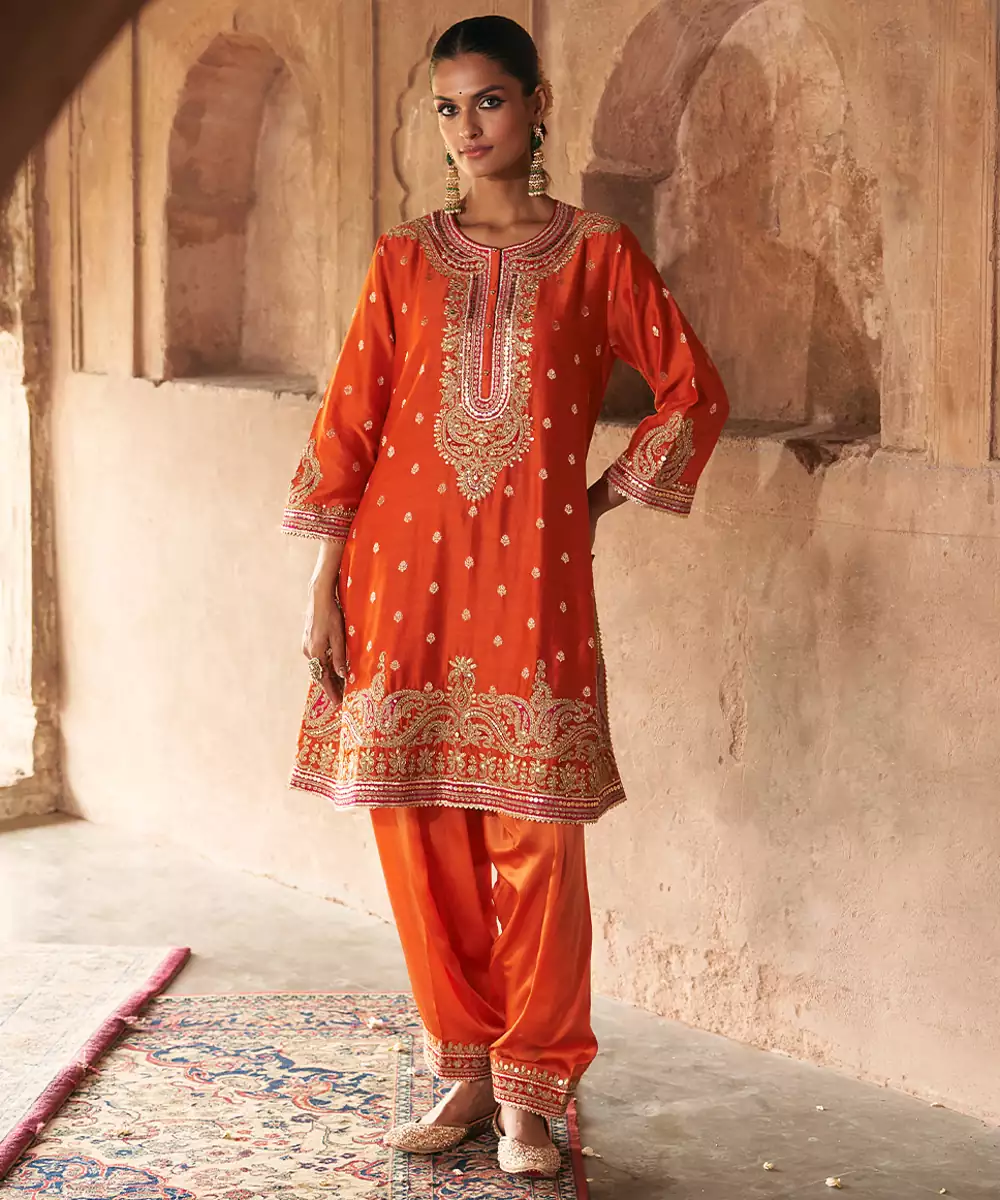 This Elegant Short A Line Kurta Crafted In Pure Silk Banarasi, Paired With A Traditional Dogri Salwar And A Silk Organza Dupatta. The Kurta Features A Zero Neckline With Placket And Elegant Bell Sleeves. The Ensemble Is Adorned With Intricate Kashmiri Tilla And Gota Patti Embroidery, Highlighted With Pearls And Sequins, And Finished With Delicate Gota Detailing.