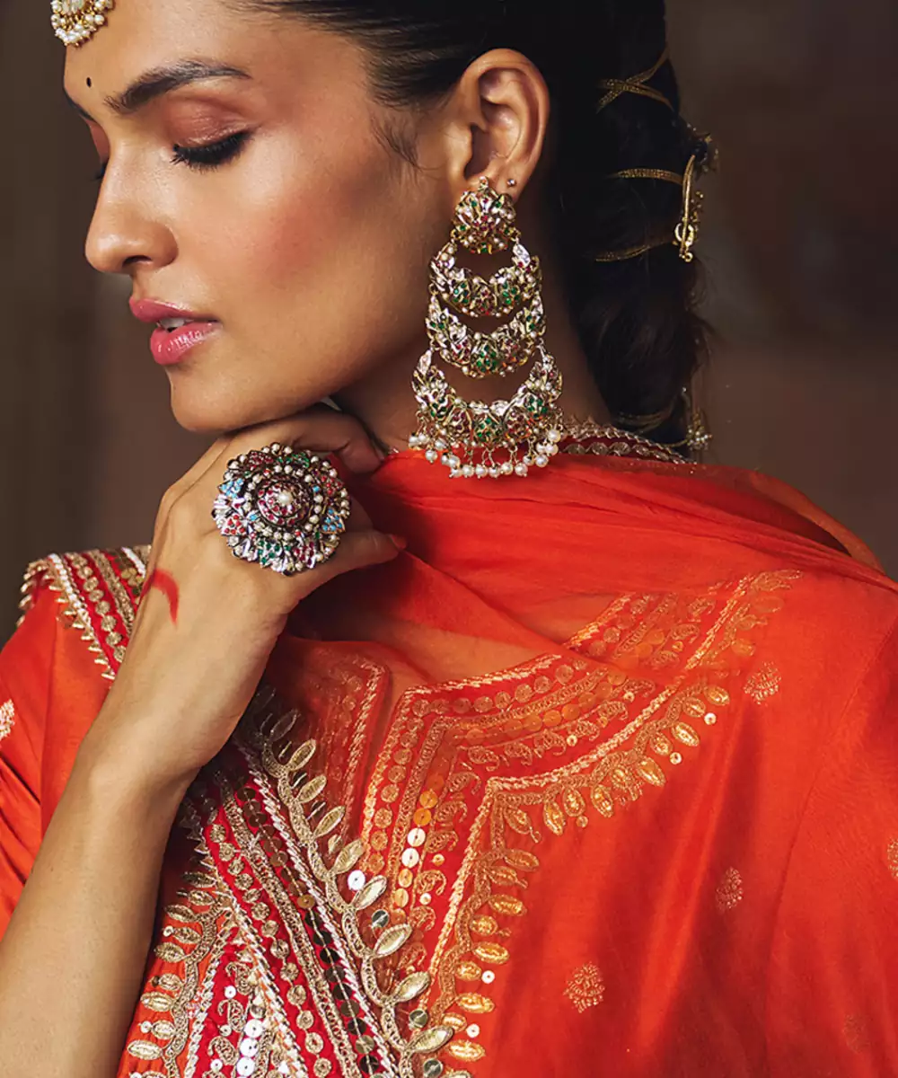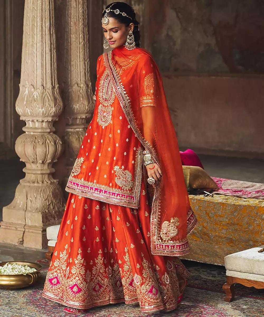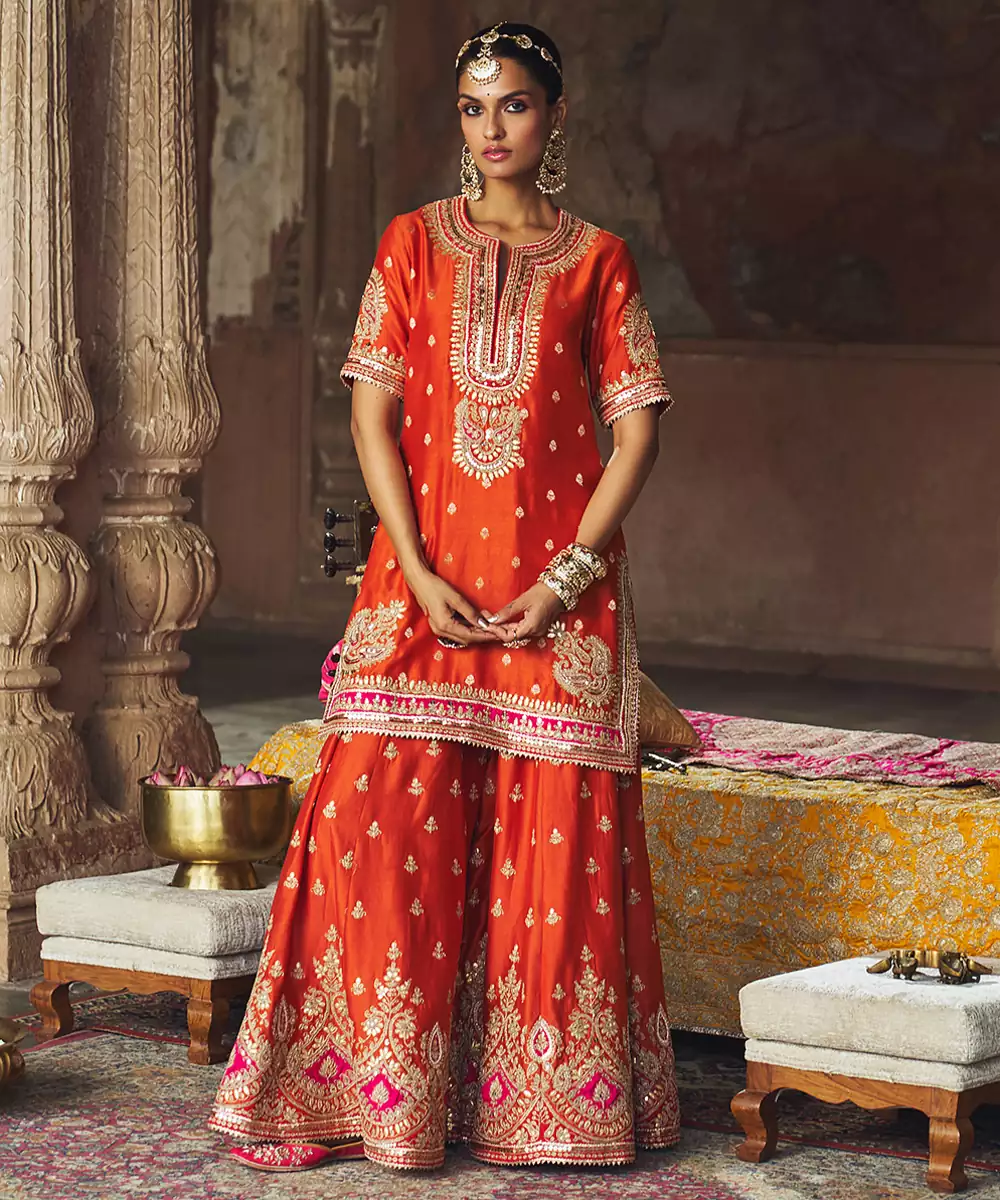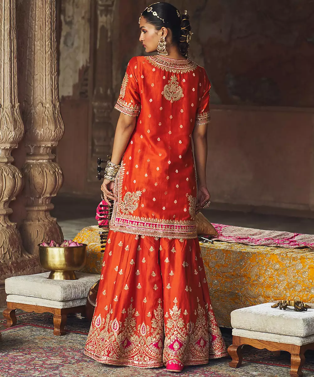 An Elegant Ensemble Featuring A Pure Banarasi Short Kurta With A Zero Neckline And Front Slit, Zero Back, And Elbow Sleeves. It Is Paired With A Sharara Showcasing A Broad Border And Embroidered Bootis, Along With A Beautifully Embroidered Silk Organza Dupatta. Adorned With Intricate Kashmiri Tilla And Gota Patti Embroidery, Highlighted With Pearls And Sequins, The Outfit Is Finished With Delicate Gota Detailing For A Regal Finish.
