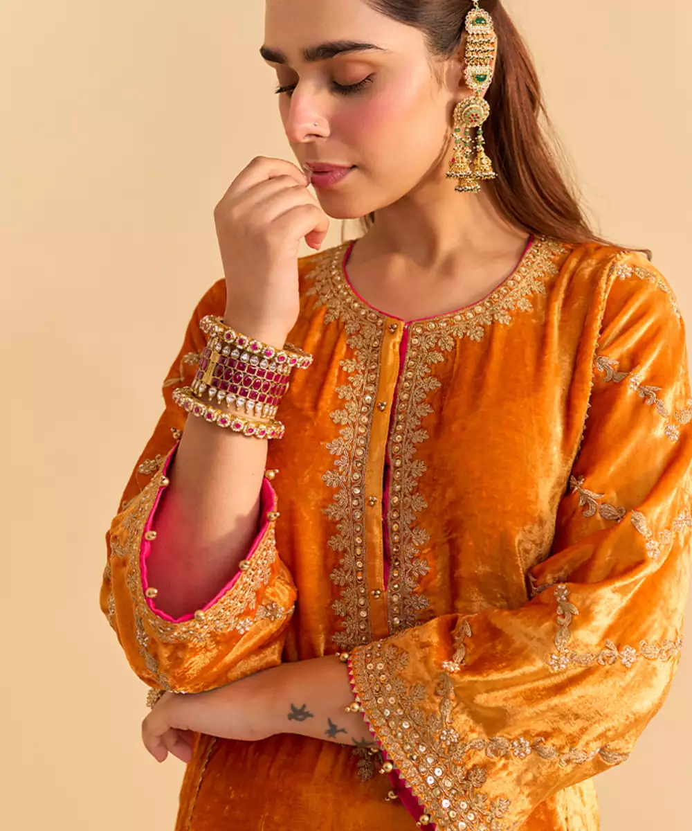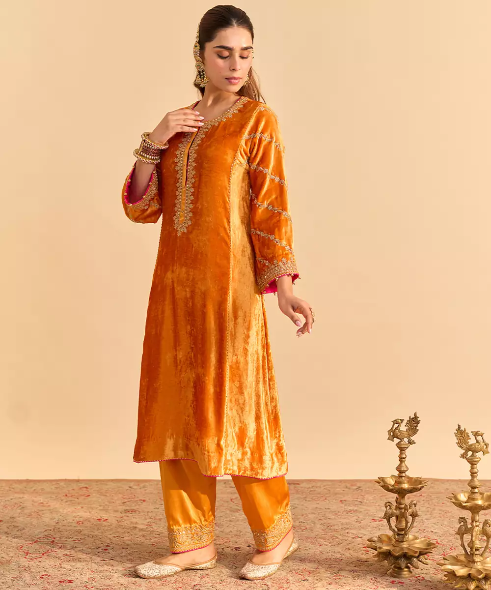 This Orange Embroidered Velvet Kurta Set With Dupatta Exudes Regal Elegance And Festive Charm. Crafted From Rich Velvet Fabric, It Features Intricate Embroidery That Adds A Luxurious, Refined Touch. Paired With A Matching Dupatta, It Offers A Graceful Silhouette, Premium Comfort, And Timeless Ethnic Appeal For Special Occasions.