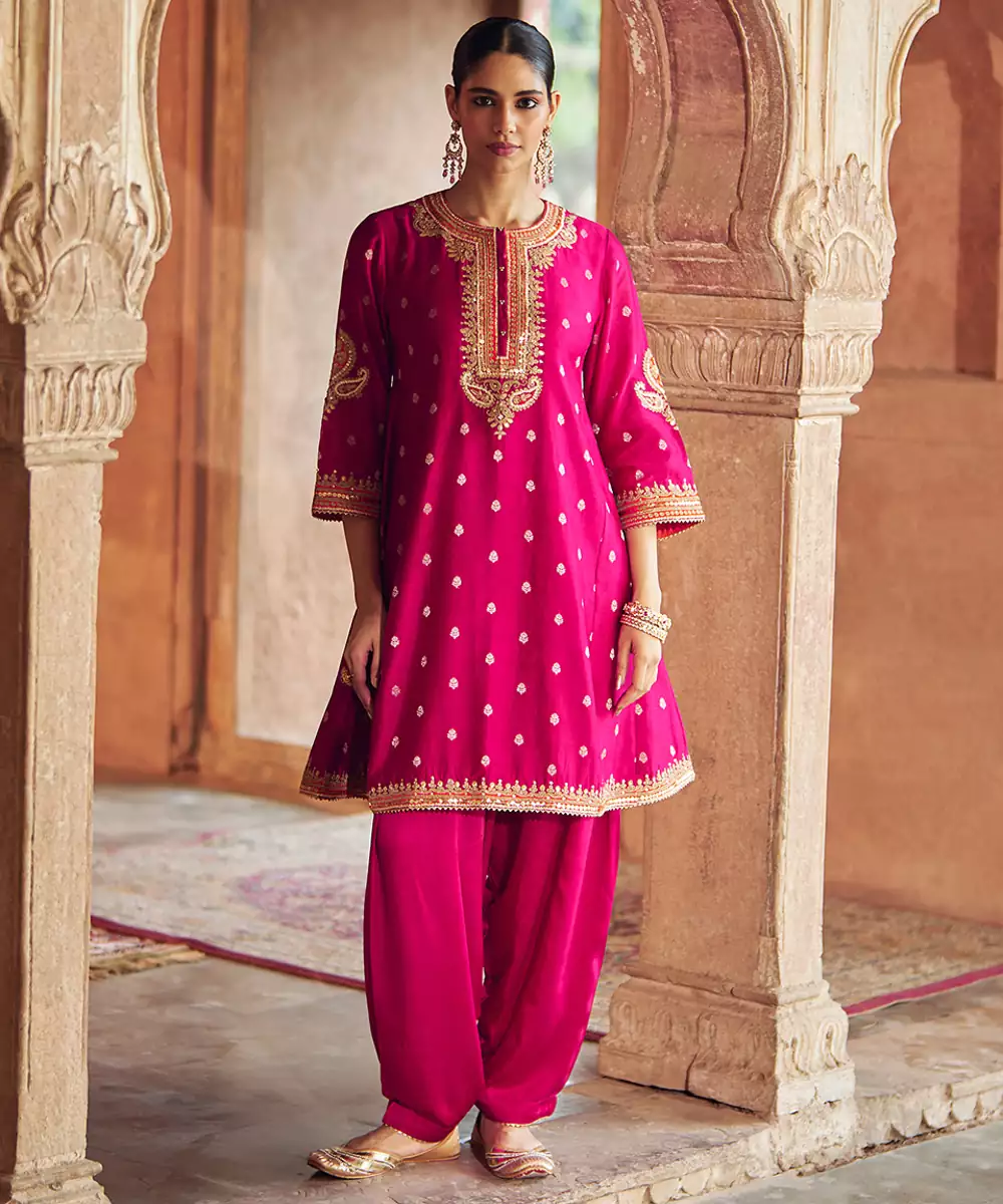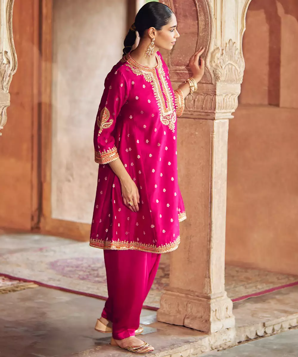 A Refined Ensemble Crafted In Pure Silk Chanderi Banarasi, Paired With A Traditional Dogri Salwar. The Kurta Features A Zero Neckline With Placket And Three Quarter Bell Sleeves. Intricately Adorned With Kashmiri Tilla And Gota Patti Embroidery, Highlighted With Pearls And Sequins, The Outfit Is Finished With Delicate Gota Detailing For An Elegant Touch.