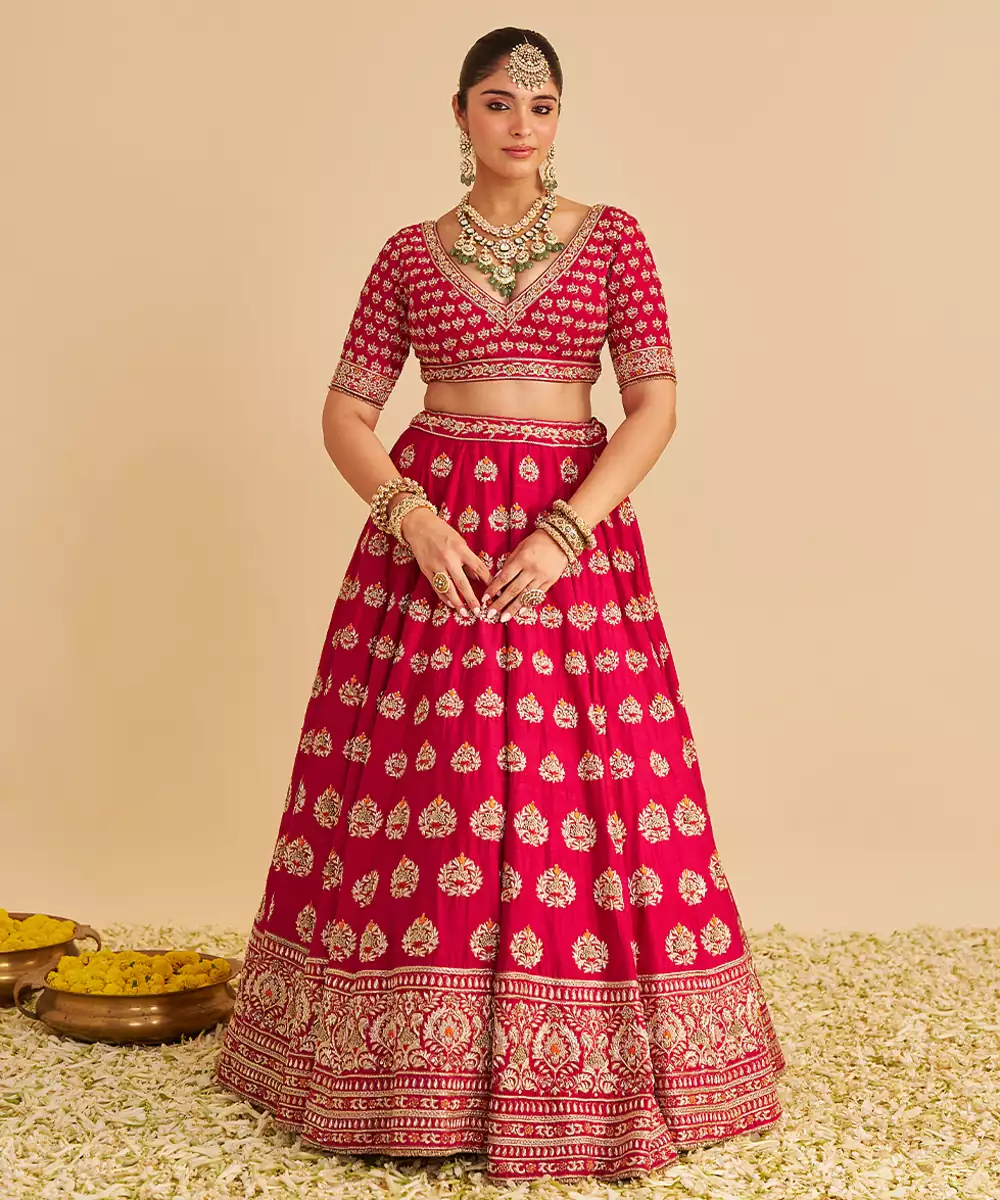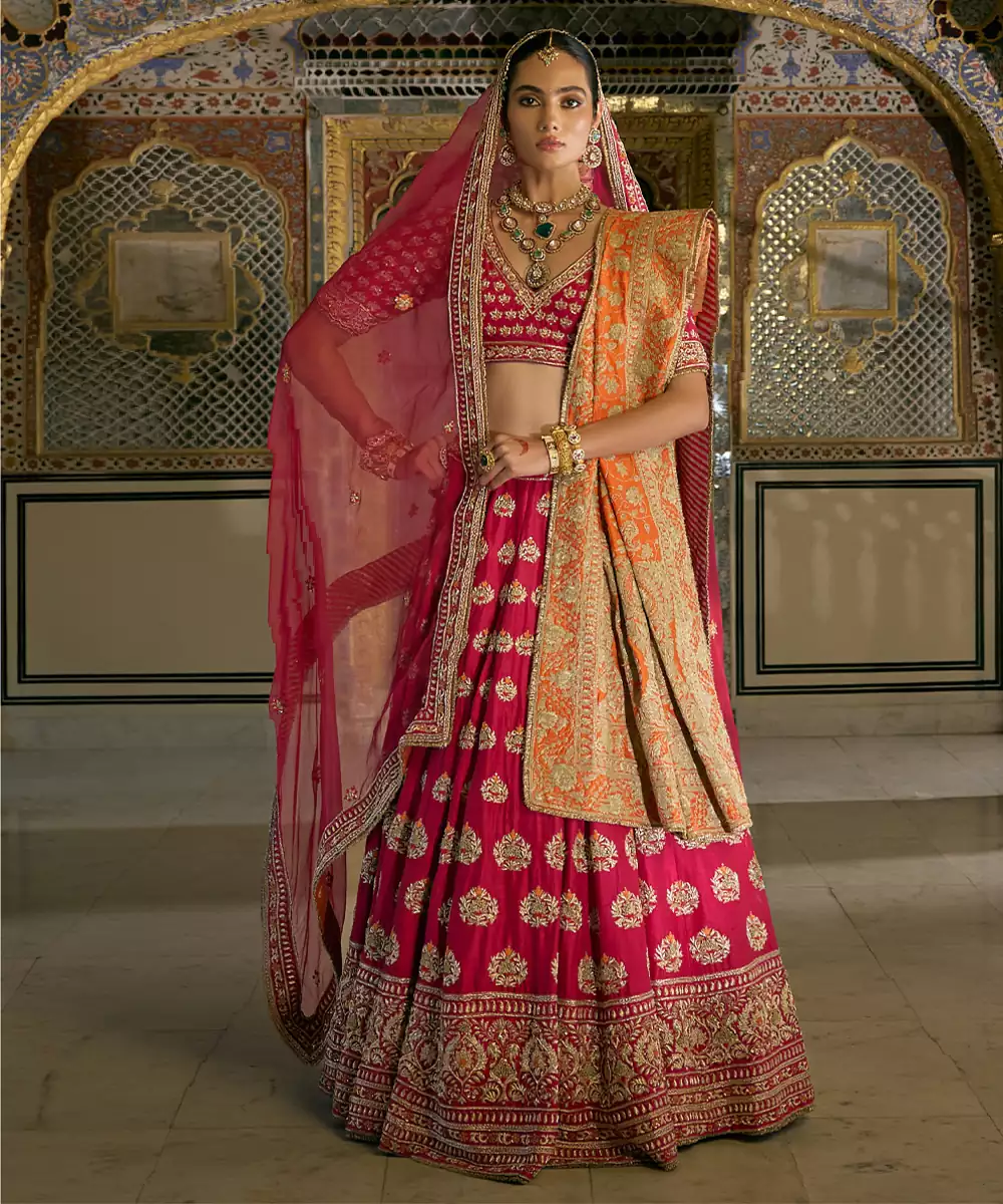 This Pink Embroidered Silk Lehenga Set Exudes Regal Elegance And Festive Grandeur. Crafted From Luxurious Silk, It Features Intricate Embroidery That Enhances Its Rich Appeal. The Flared Lehenga Paired With A Beautifully Tailored Blouse Creates A Graceful Silhouette, Making It Perfect For Weddings, Celebrations, And Special Occasions With Timeless Sophistication.