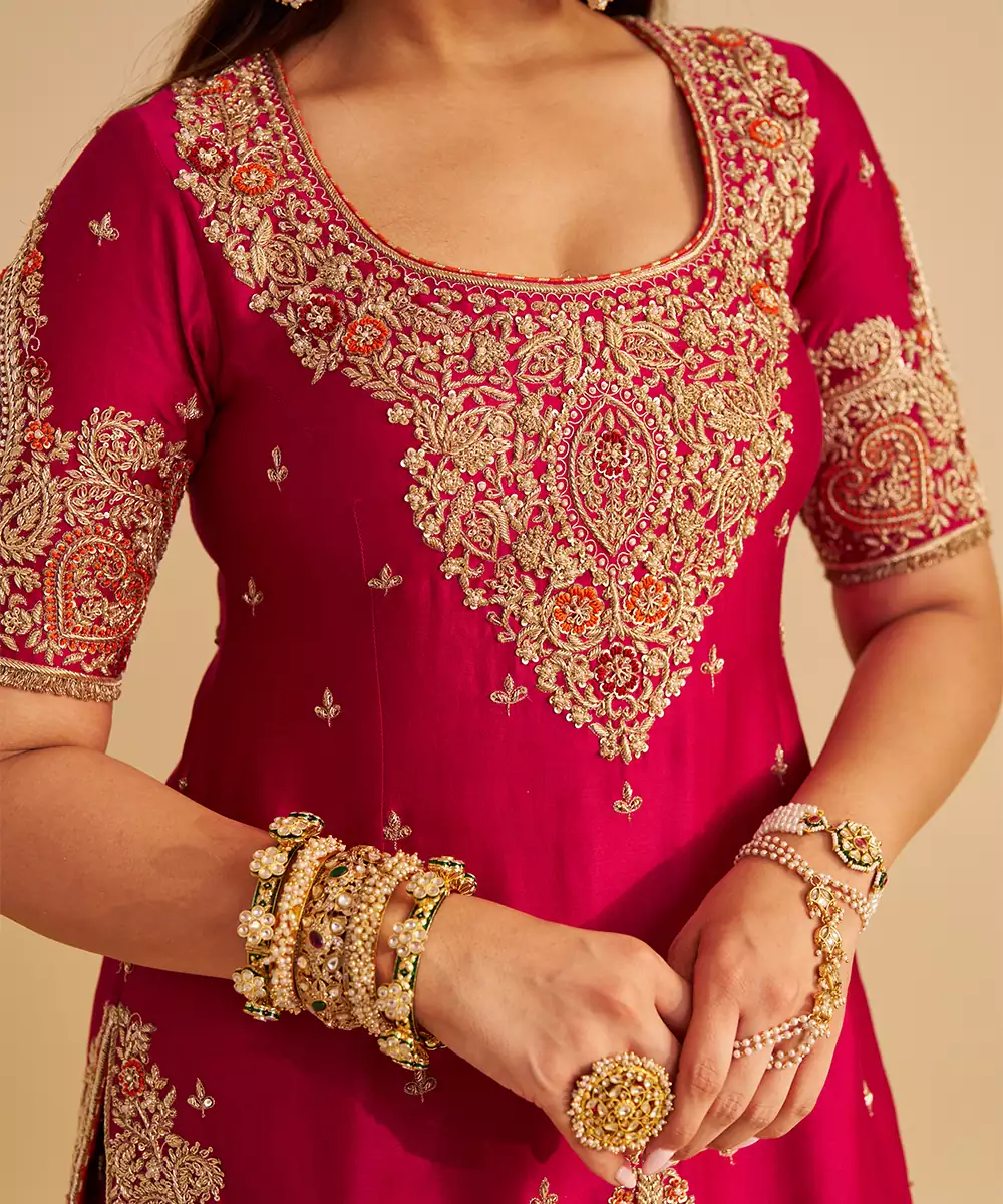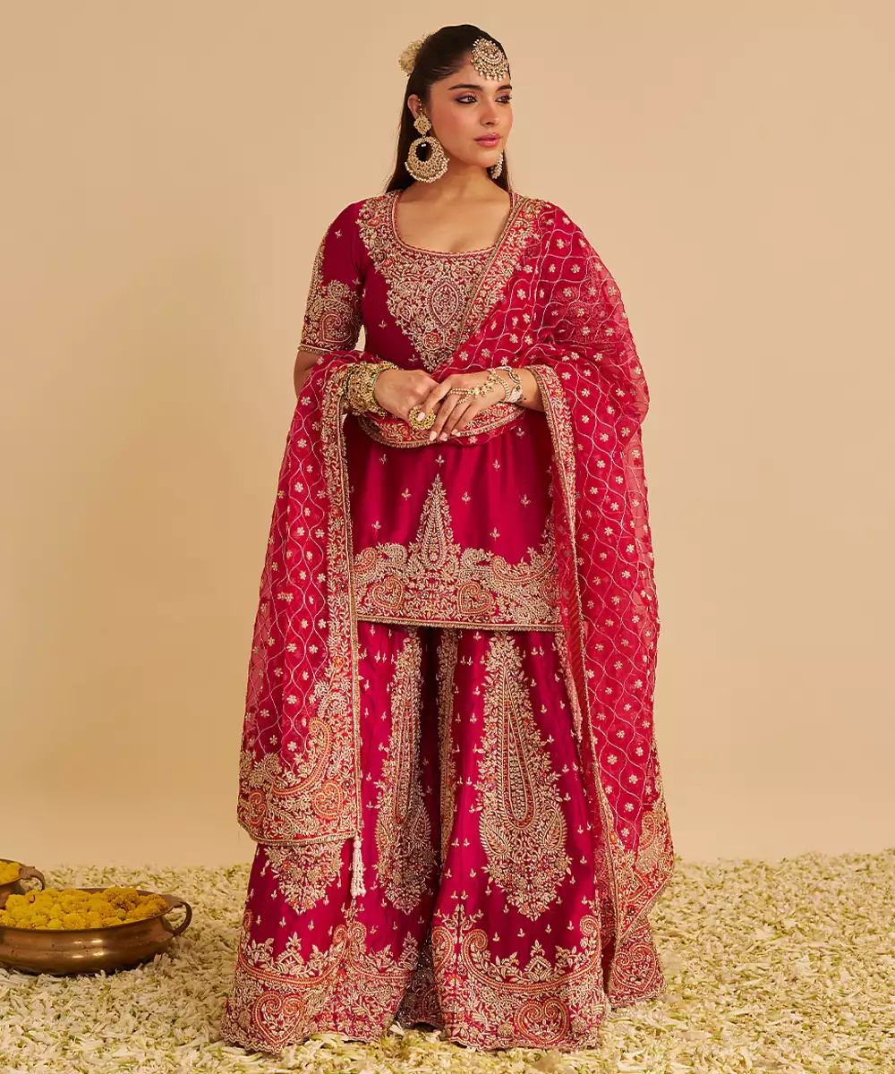 This Pink Embroidered Silk Sharara Set Exudes Festive Elegance And Graceful Charm. Crafted From Luxurious Silk, It Features Intricate Embroidery That Enhances Its Refined Appeal. The Flowing Sharara Paired With A Beautifully Tailored Top Creates A Regal Silhouette, Making It Perfect For Weddings, Celebrations, Or Special Occasions With Timeless Sophistication.