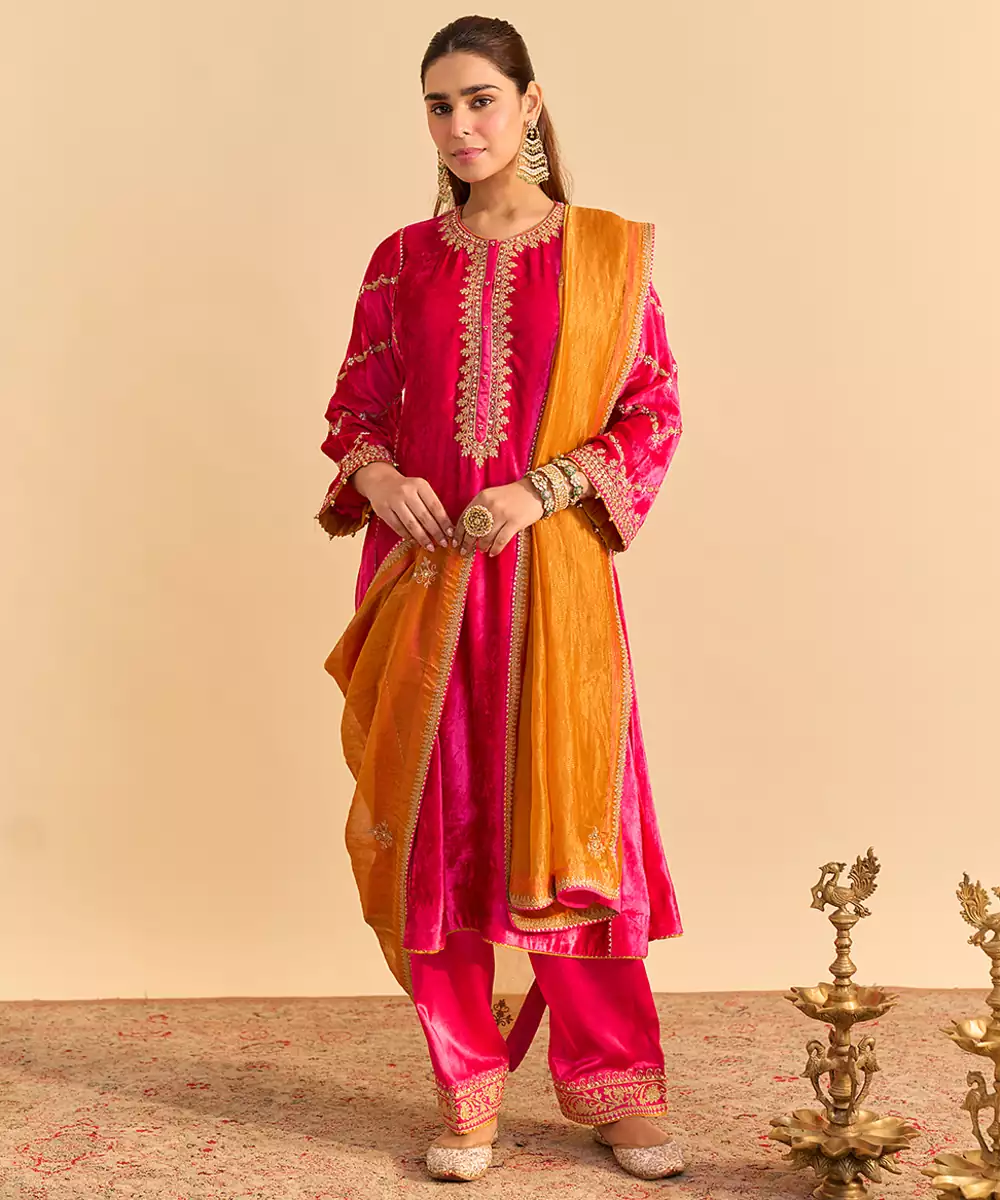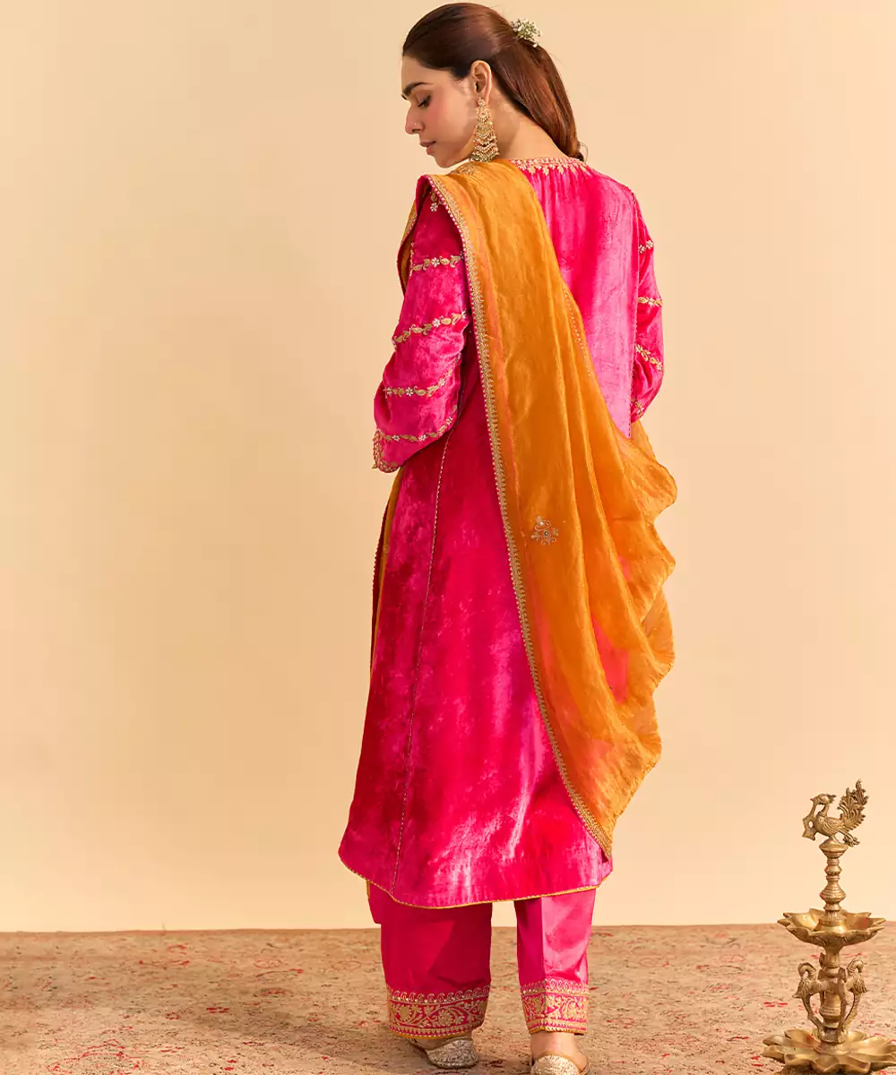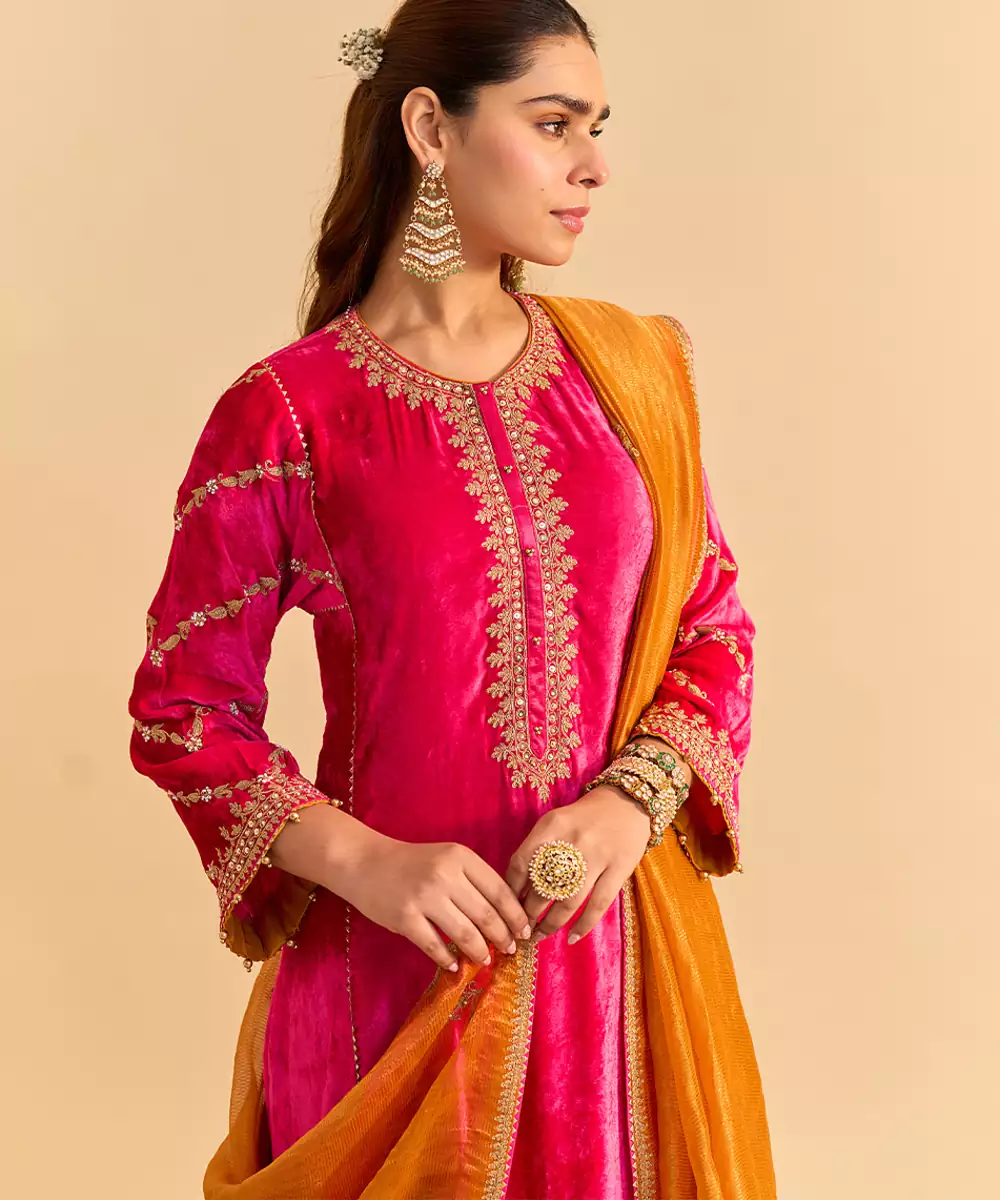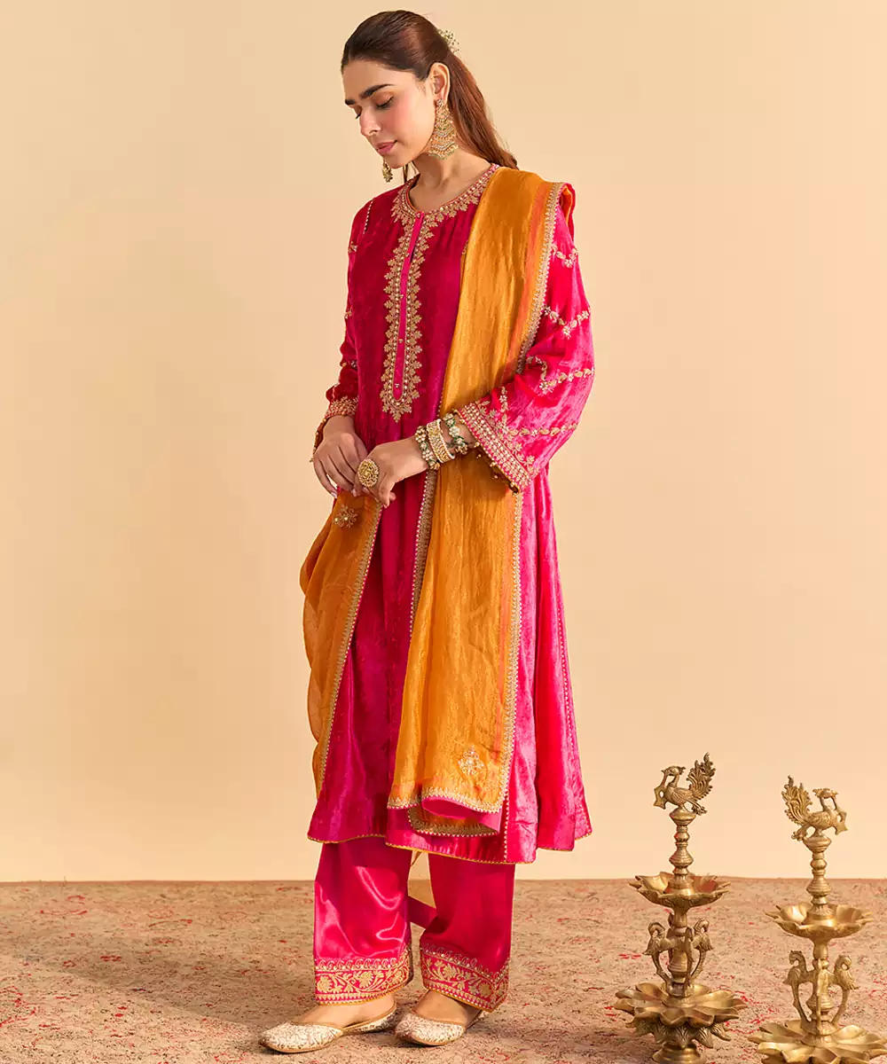 This Pink Embroidered Velvet Kurta Set With Dupatta Exudes Regal Elegance And Festive Charm. Crafted From Rich Velvet Fabric, It Features Intricate Embroidery That Adds A Luxurious, Refined Touch. Paired With A Matching Dupatta, It Offers A Graceful Silhouette, Premium Comfort, And Timeless Ethnic Appeal For Special Occasions.