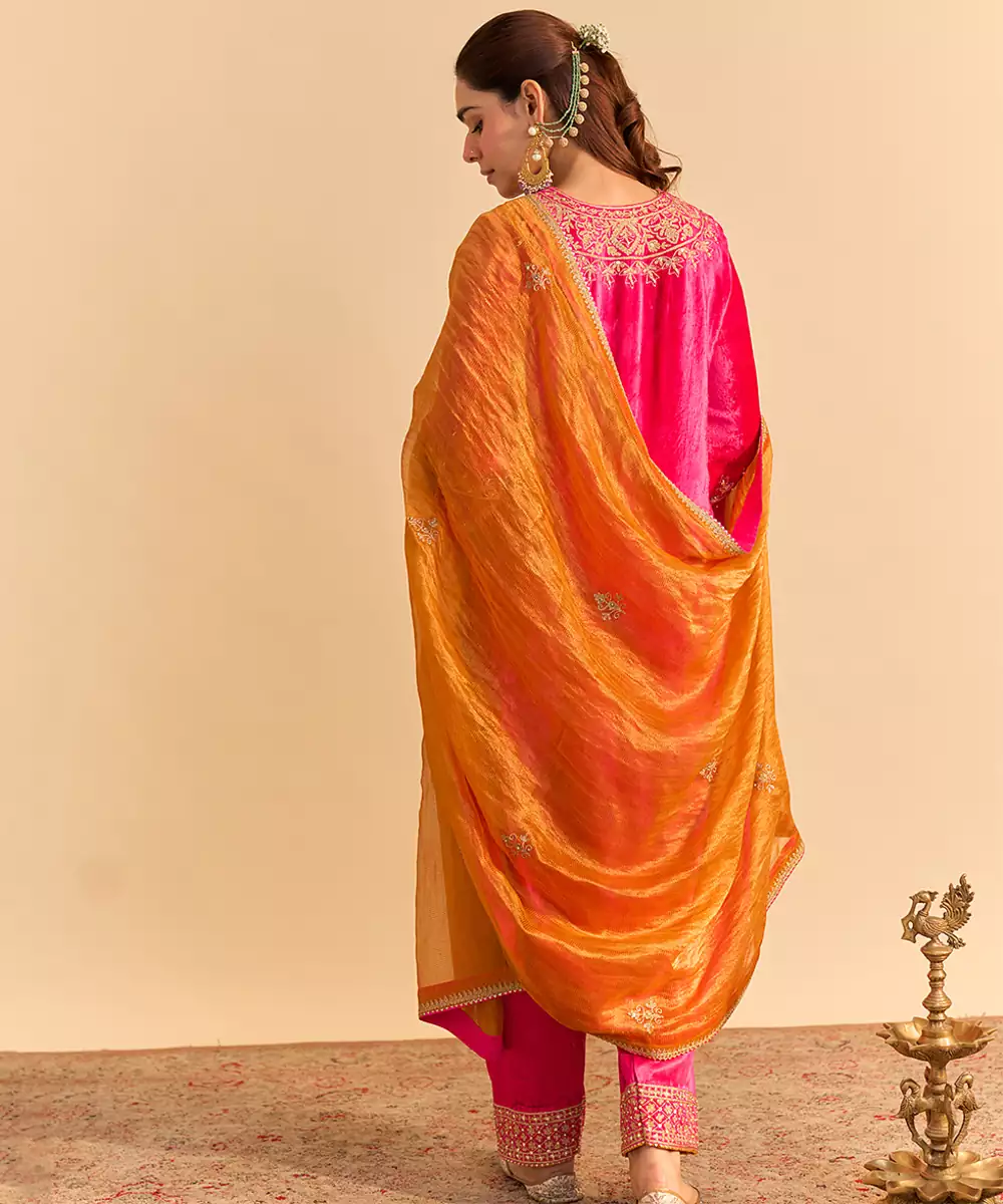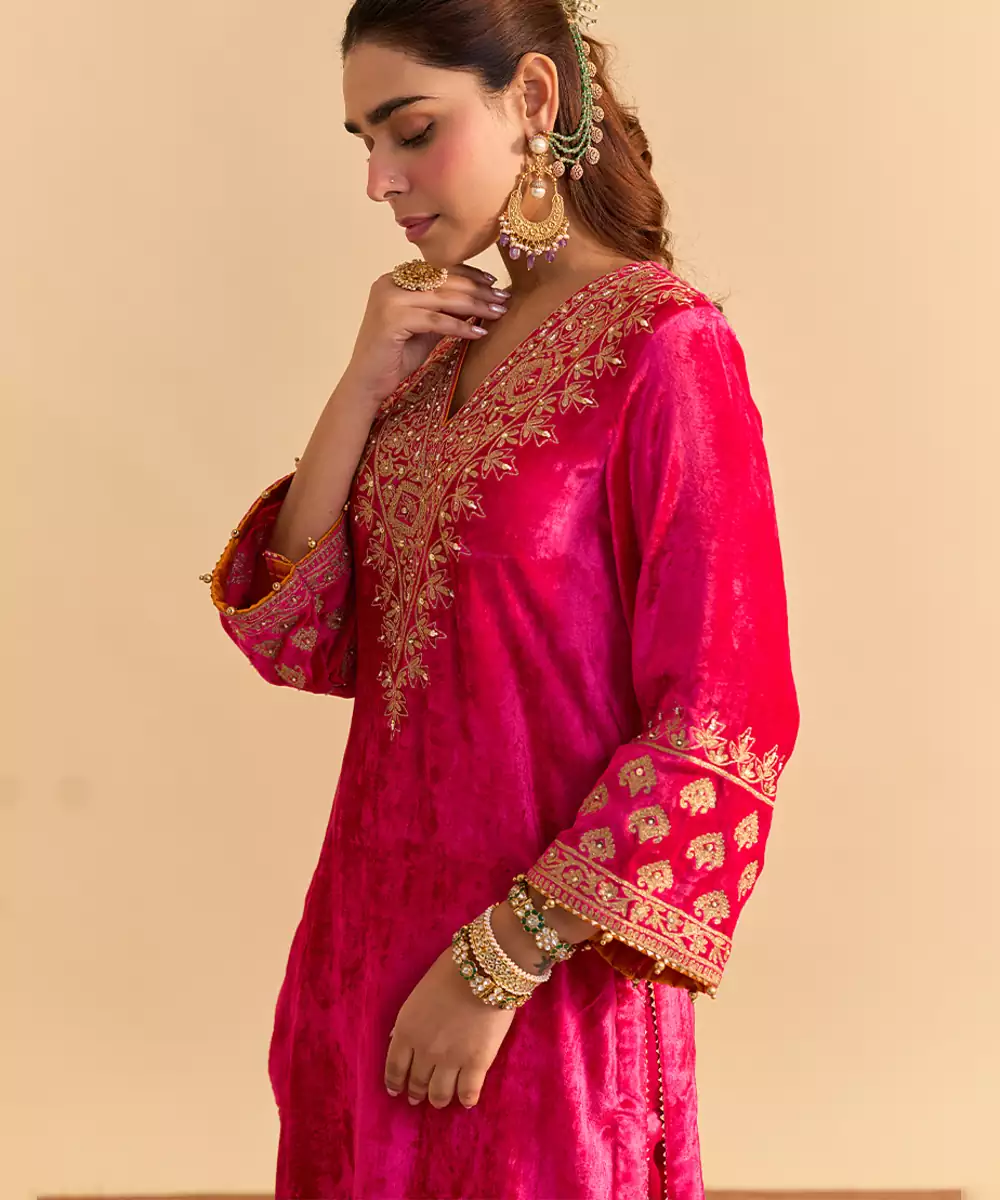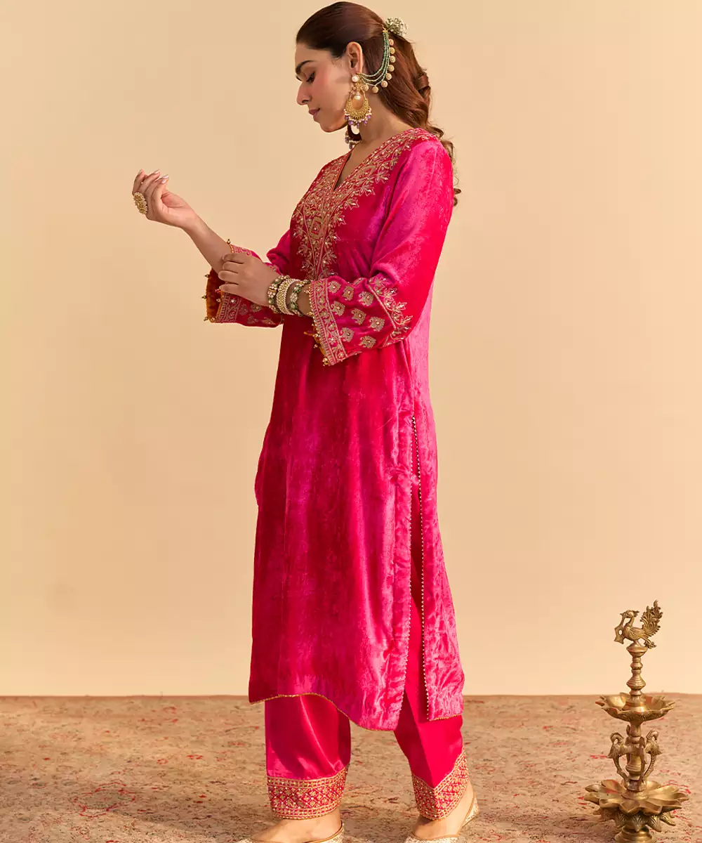 This Pink Embroidered Velvet Kurta Set With Dupatta Exudes Regal Elegance And Festive Charm. Crafted From Rich Velvet Fabric, It Features Intricate Embroidery That Adds A Luxurious, Refined Touch. Paired With A Matching Dupatta, It Offers A Graceful Silhouette, Premium Comfort, And Timeless Ethnic Appeal For Special Occasions.