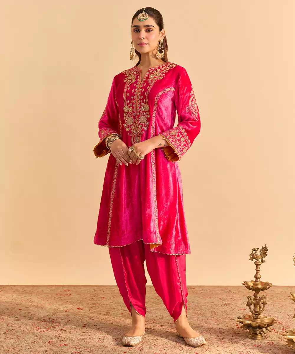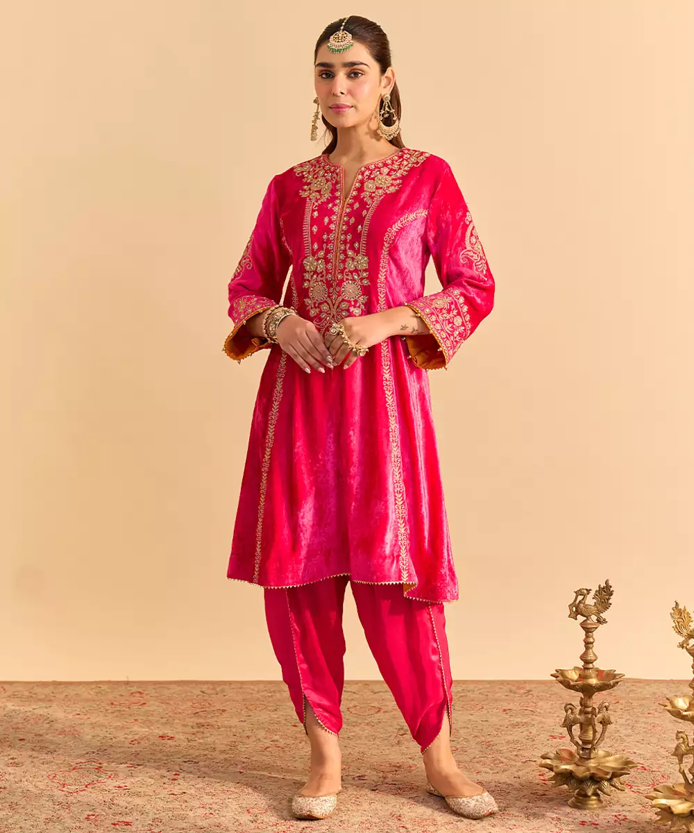 This Pink Embroidered Velvet Kurta Set Exudes Regal Elegance And Festive Charm. Crafted From Rich Velvet Fabric, It Features Intricate Embroidery That Adds A Luxurious, Refined Touch. Perfect For Weddings And Celebrations, It Offers A Graceful Silhouette, Premium Comfort, And Timeless Ethnic Appeal.