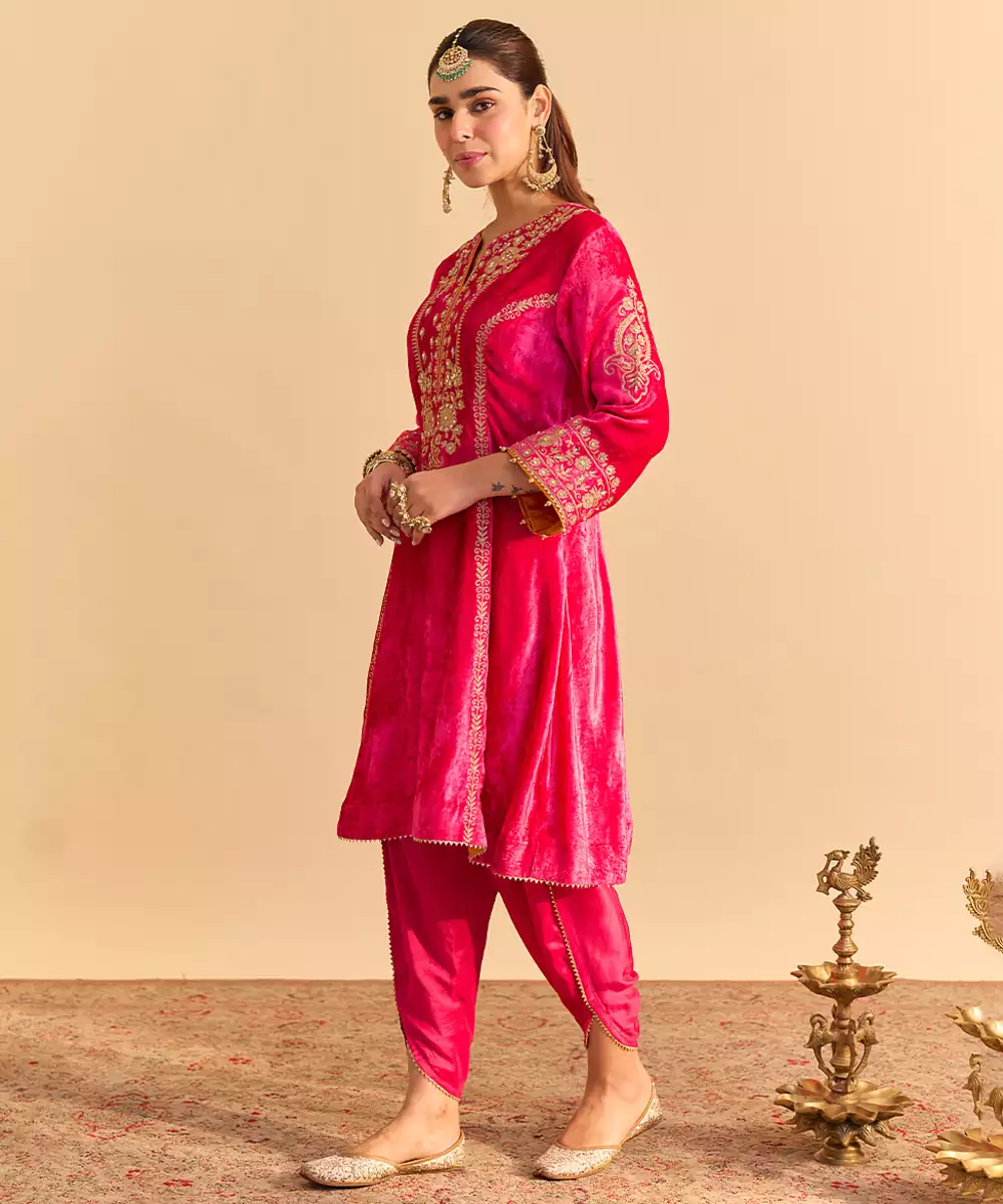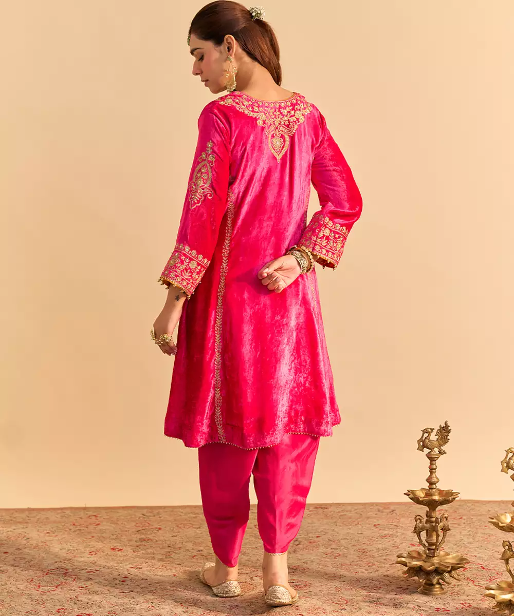 Pink Embroidered Velvet Kurta Set