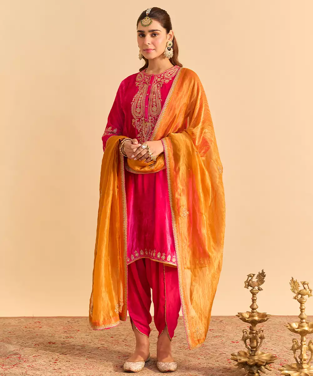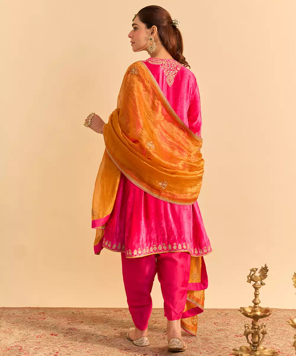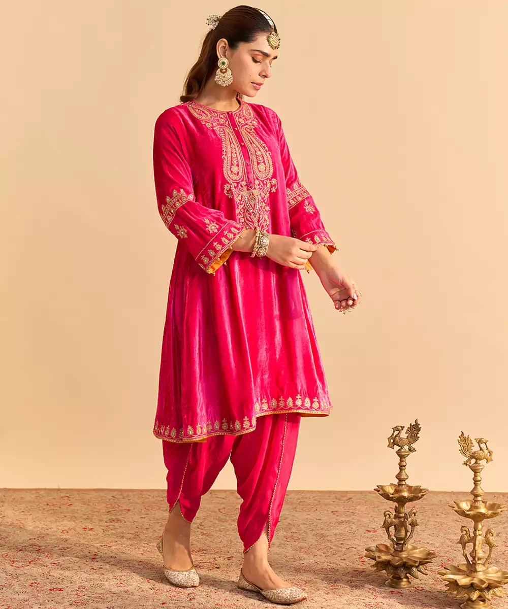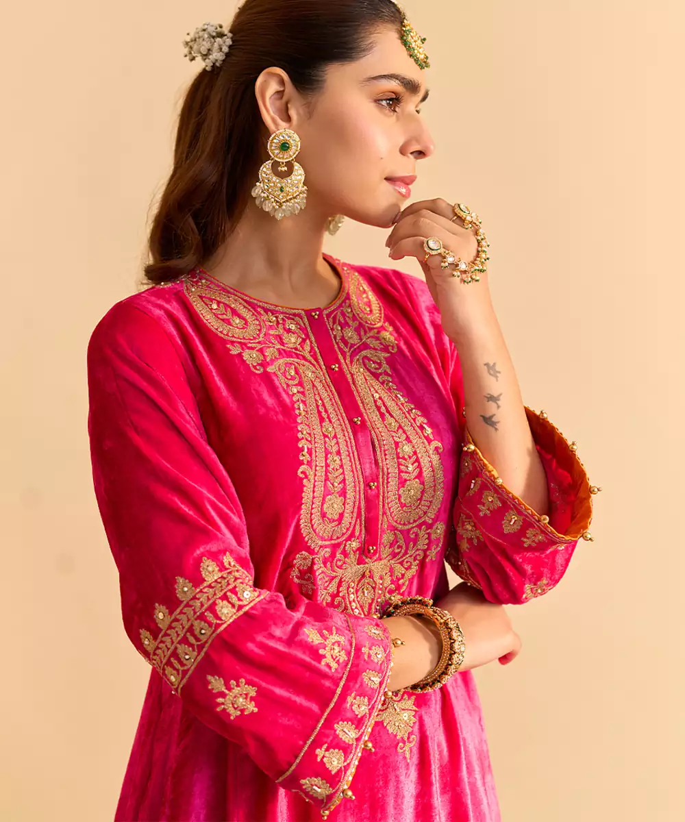 This Pink Embroidered Velvet Kurta Set Exudes Regal Elegance And Festive Charm. Crafted From Rich Velvet Fabric, It Features Intricate Embroidery That Adds A Luxurious, Refined Touch. Perfect For Weddings And Celebrations, It Offers A Graceful Silhouette, Premium Comfort, And Timeless Ethnic Appeal.