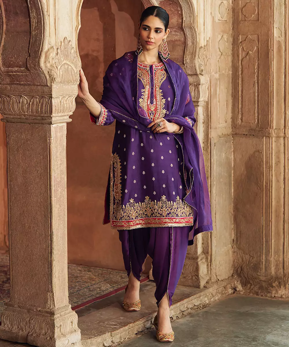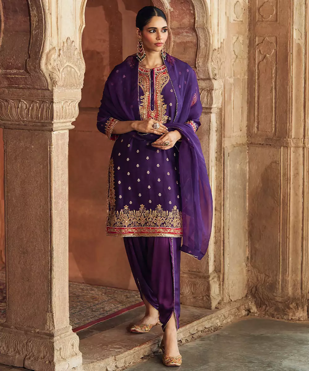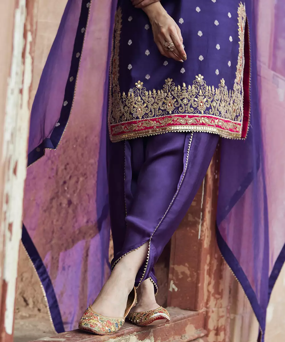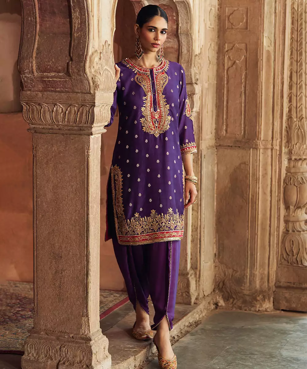 A Short Straight Kurta In Pure Silk Chanderi Banarasi, Paired With A Stylish Dhoti. Featuring A Zero Neckline With Placket And Three Quarter Bell Sleeves, The Outfit Is Adorned With Intricate Kashmiri Tilla And Gota Patti Embroidery, Highlighted With Pearls And Sequins. Finished With Delicate Gota Detailing For An Elegant Touch.
