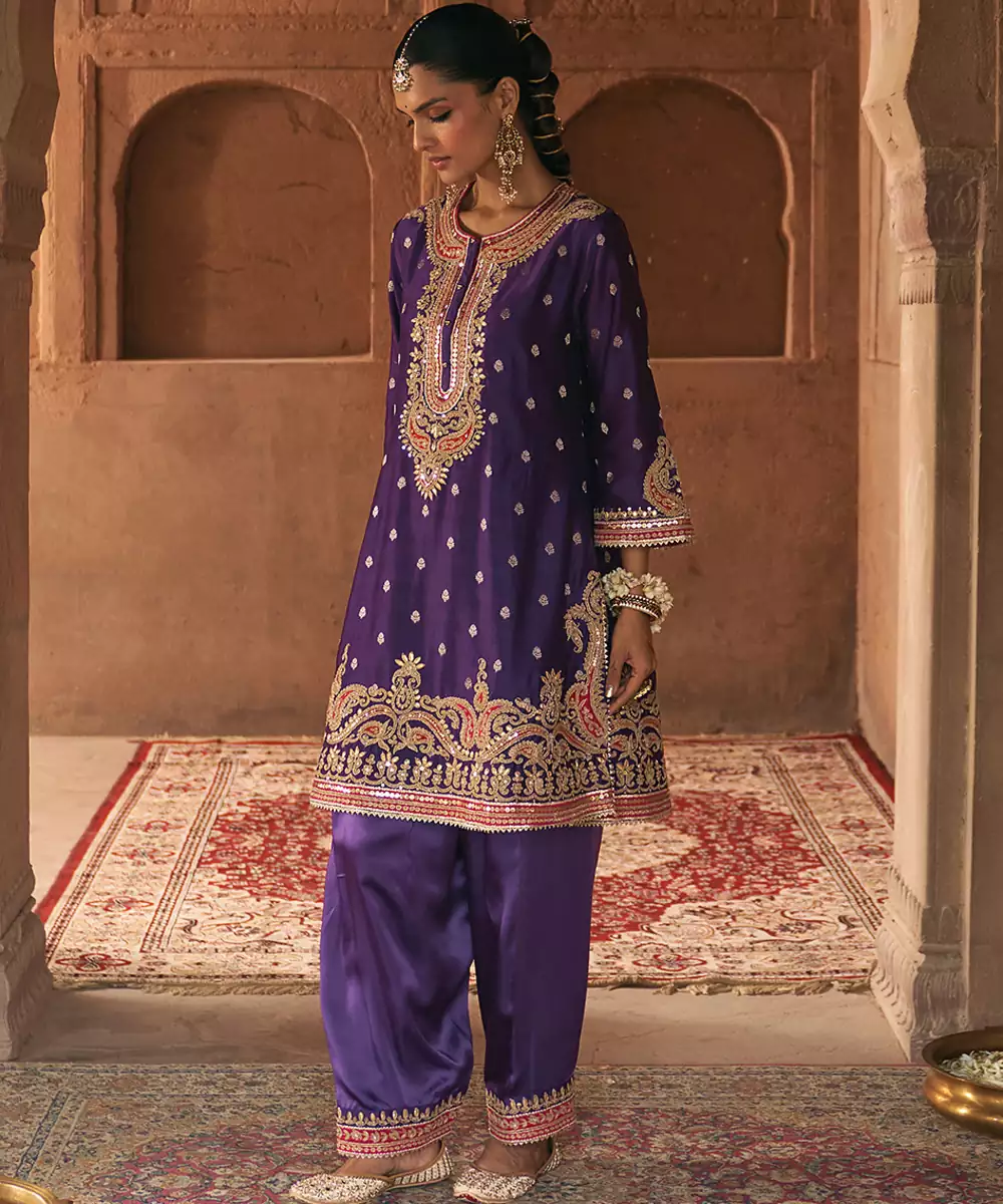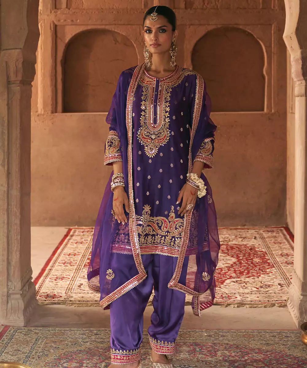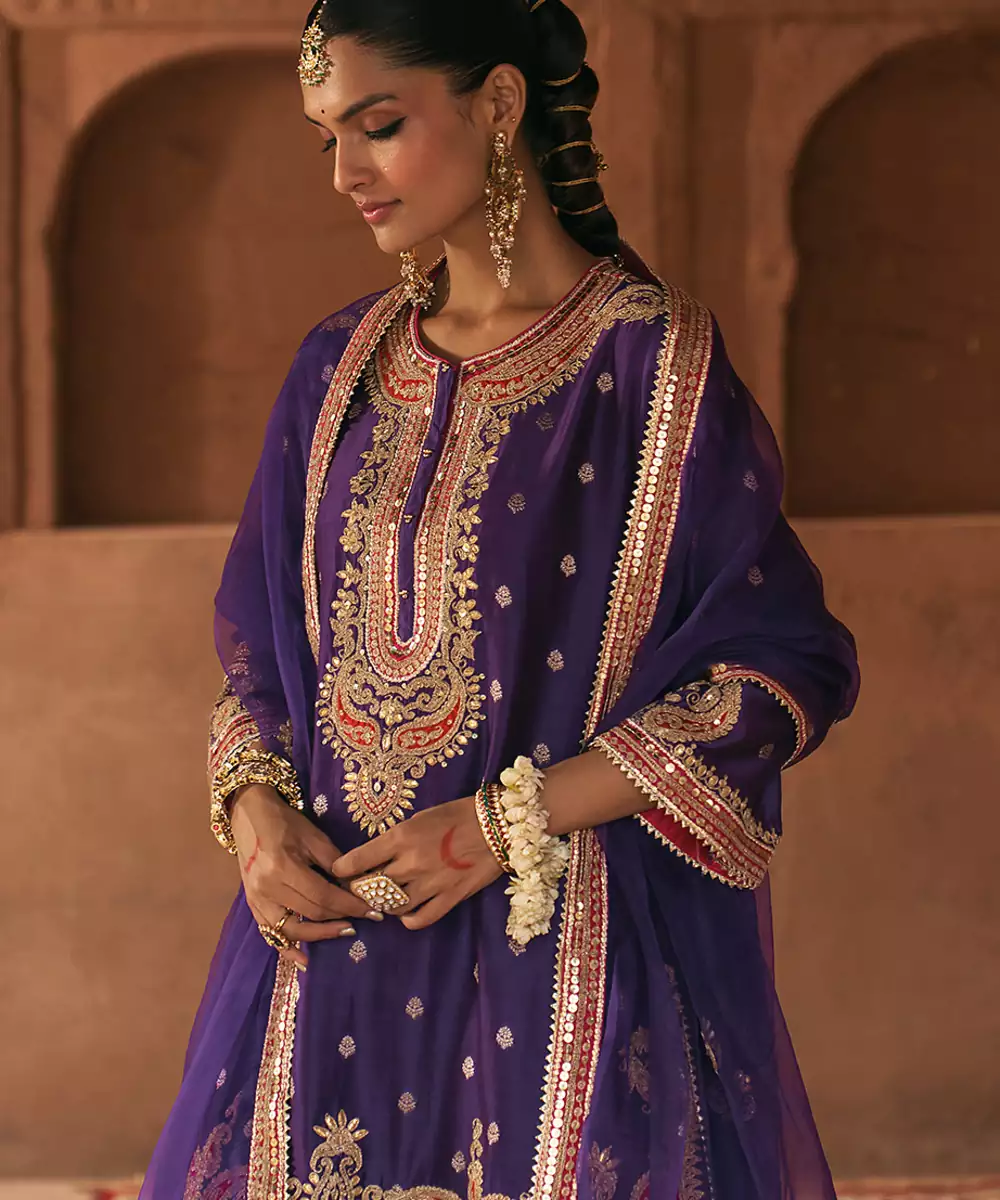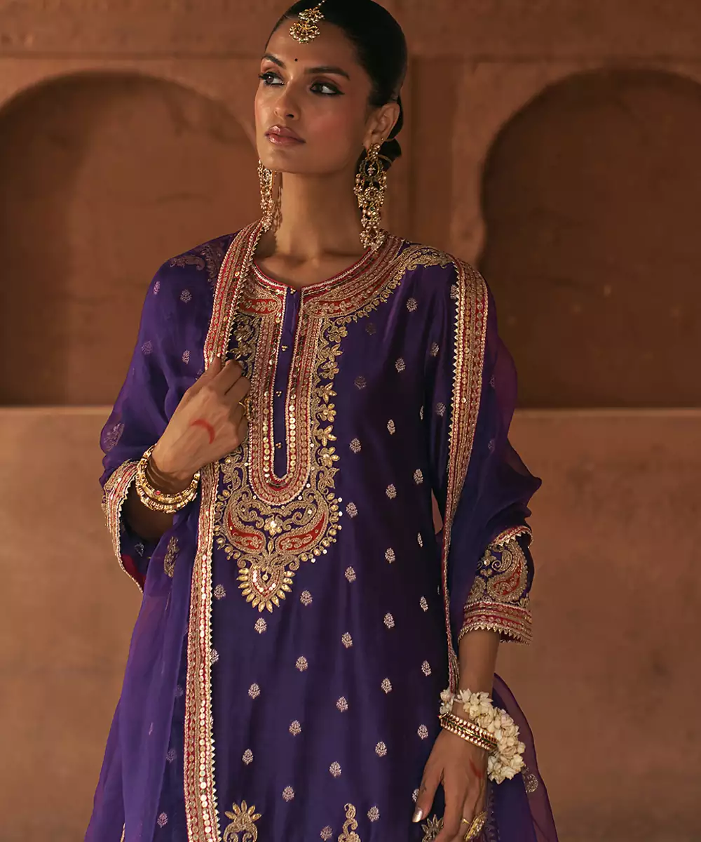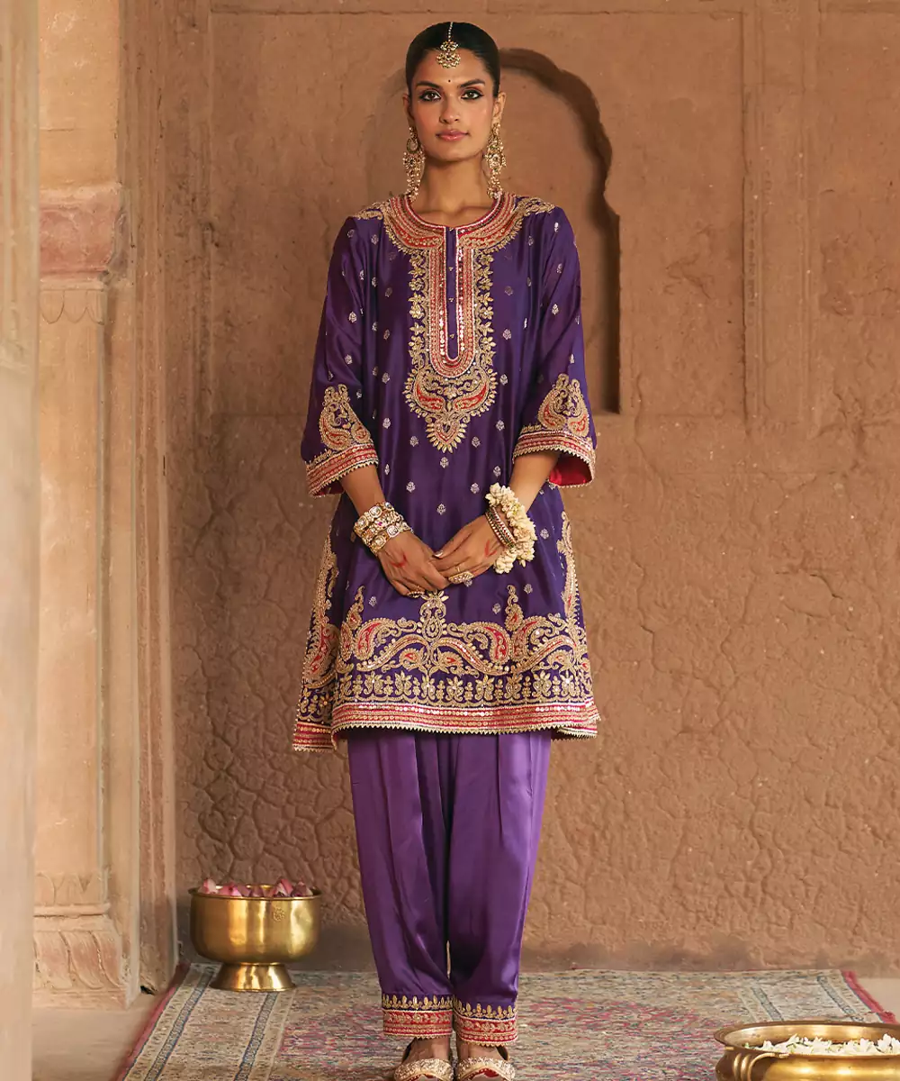 This Elegant Short A Line Kurta Crafted In Pure Silk Banarasi, Paired With A Traditional Dogri Salwar And A Silk Organza Dupatta. The Kurta Features A Zero Neckline With Placket And Elegant Bell Sleeves. The Ensemble Is Adorned With Intricate Kashmiri Tilla And Gota Patti Embroidery, Highlighted With Pearls And Sequins, And Finished With Delicate Gota Detailing.