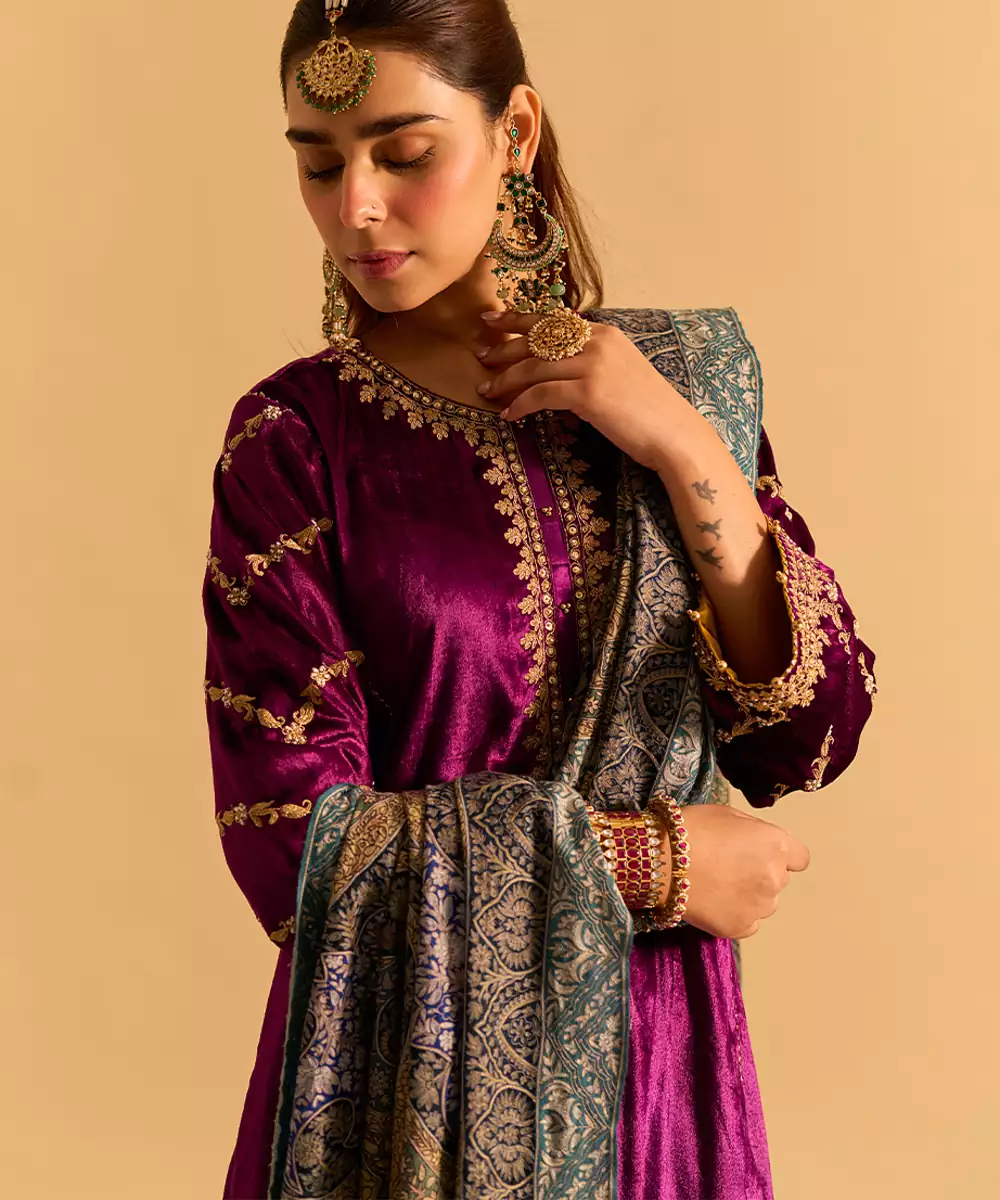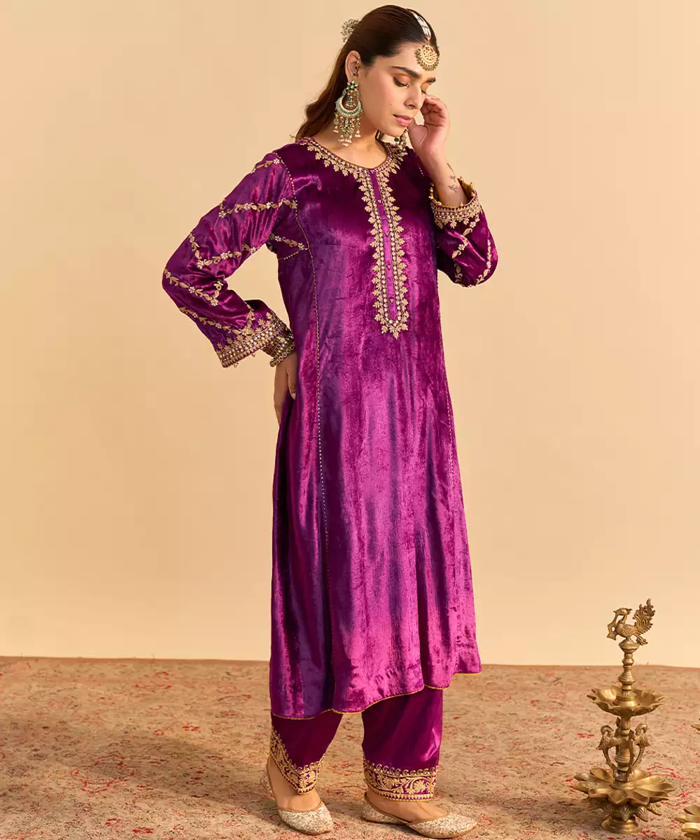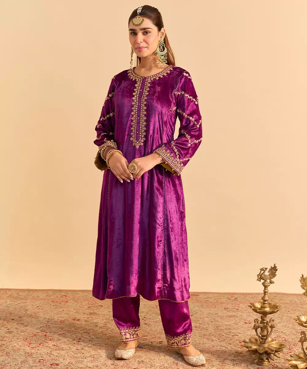 This Purple Embroidered Velvet Kurta Set With Dupatta Exudes Regal Elegance And Festive Charm. Crafted From Rich Velvet Fabric, It Features Intricate Embroidery That Adds A Luxurious, Refined Touch. Paired With A Matching Dupatta, It Offers A Graceful Silhouette, Premium Comfort, And Timeless Ethnic Appeal For Special Occasions.