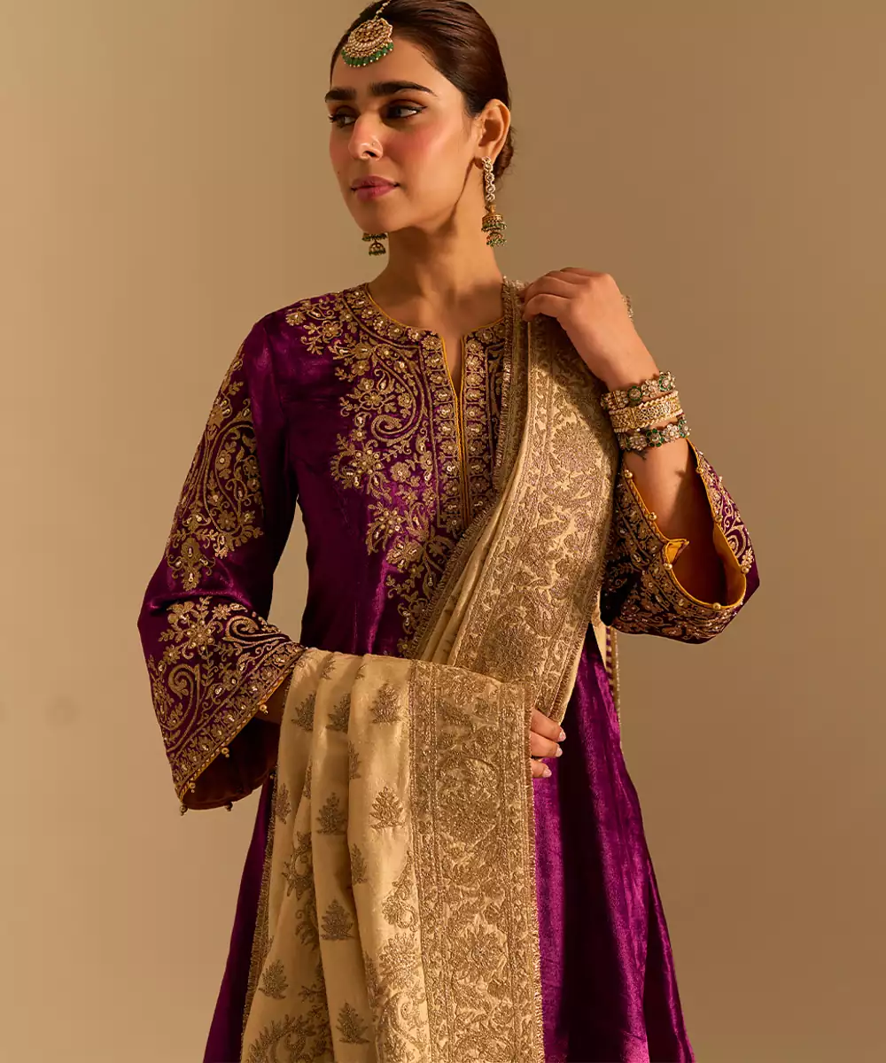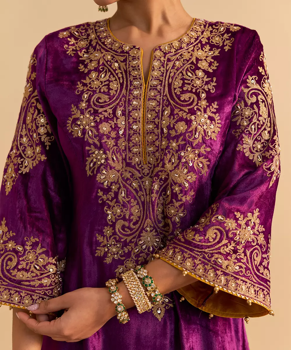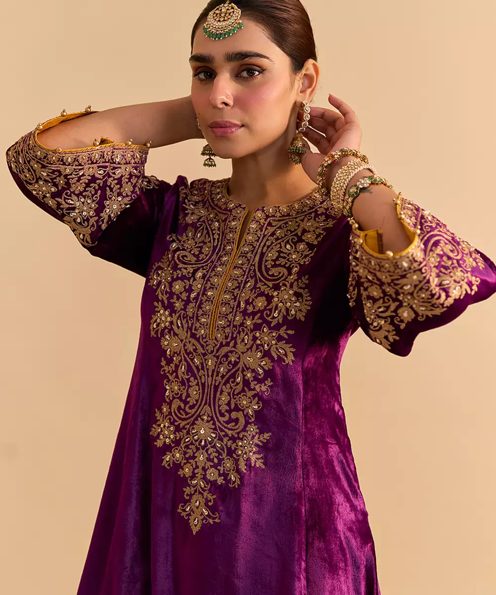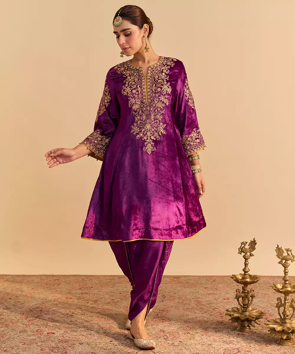 This Purple Embroidered Velvet Kurta Set With Dupatta Exudes Regal Elegance And Festive Charm. Crafted From Rich Velvet Fabric, It Features Intricate Embroidery That Adds A Luxurious, Refined Touch. Paired With A Matching Dupatta, It Offers A Graceful Silhouette, Premium Comfort, And Timeless Ethnic Appeal For Special Occasions.