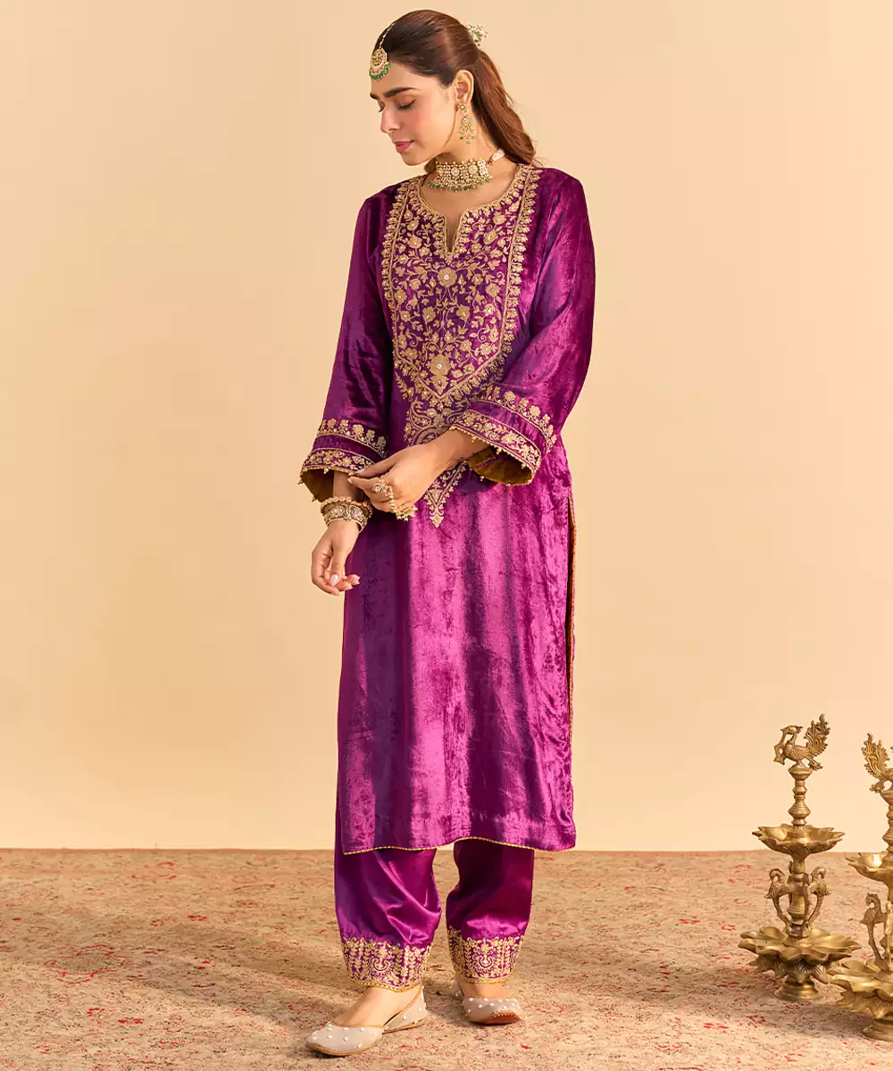 This Purple Embroidered Velvet Kurta Set Exudes Regal Elegance And Festive Charm. Crafted From Rich Velvet Fabric, It Features Intricate Embroidery That Adds A Luxurious, Refined Touch. Perfect For Weddings And Celebrations, It Offers A Graceful Silhouette, Premium Comfort, And Timeless Ethnic Appeal.