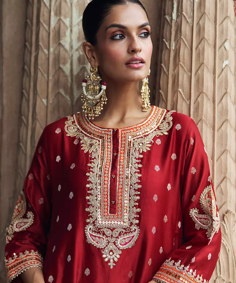 A Refined Ensemble Crafted In Pure Silk Chanderi Banarasi, Paired With A Traditional Dogri Salwar. The Kurta Features A Zero Neckline With Placket And Three Quarter Bell Sleeves. Intricately Adorned With Kashmiri Tilla And Gota Patti Embroidery, Highlighted With Pearls And Sequins, The Outfit Is Finished With Delicate Gota Detailing For An Elegant Touch.