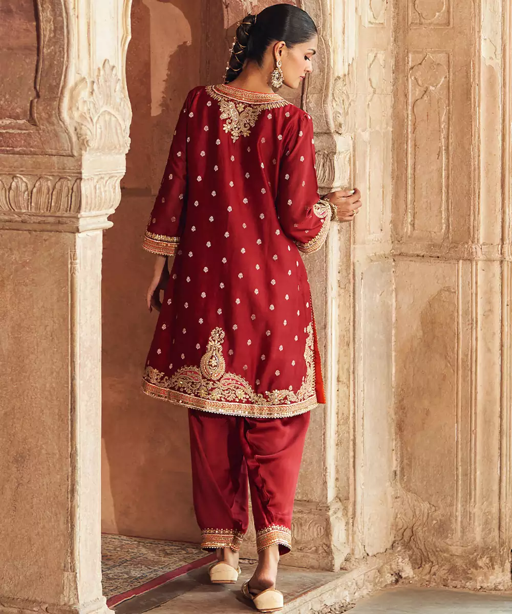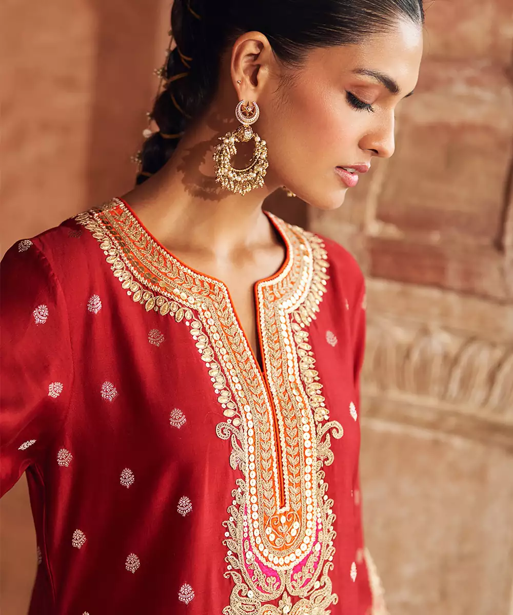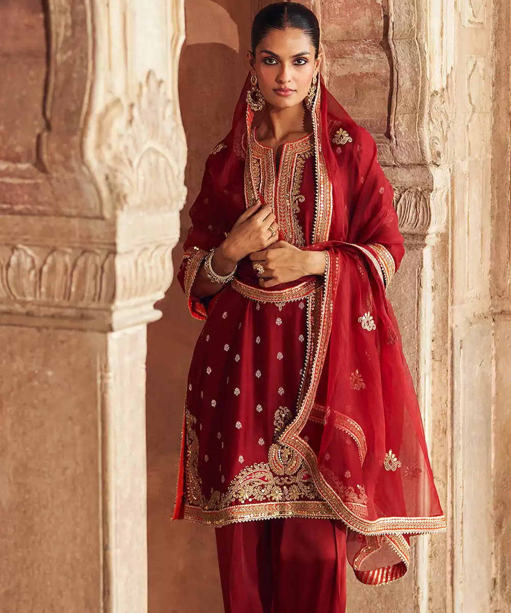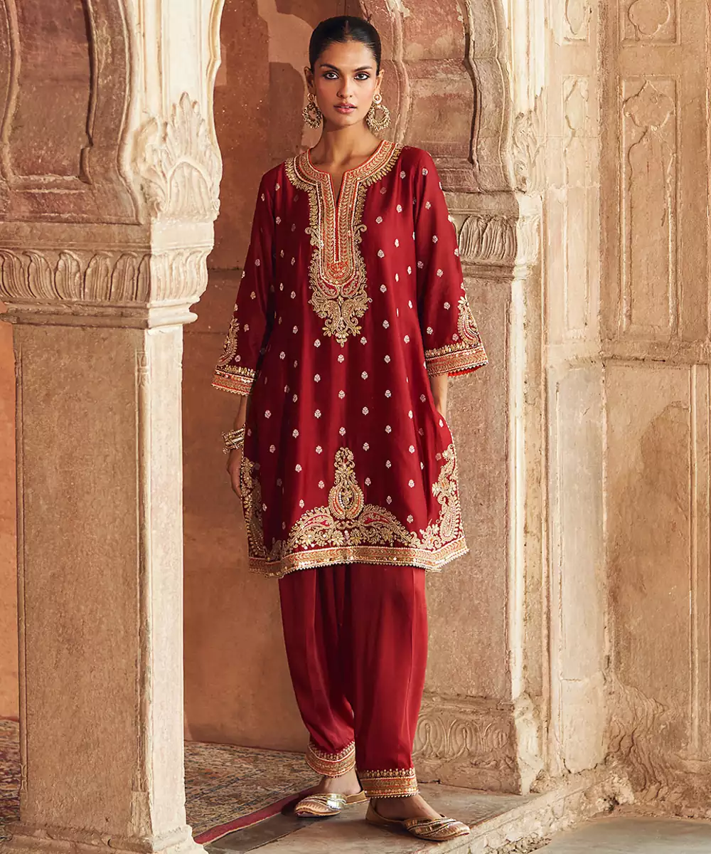 This Elegant Short A Line Kurta Crafted In Pure Silk Banarasi, Paired With A Traditional Dogri Salwar And A Silk Organza Dupatta. The Kurta Features A Zero Neckline With Slit And Elegant Bell Sleeves. The Ensemble Is Adorned With Intricate Kashmiri Tilla And Gota Patti Embroidery, Highlighted With Pearls And Sequins, And Finished With Delicate Gota Detailing.