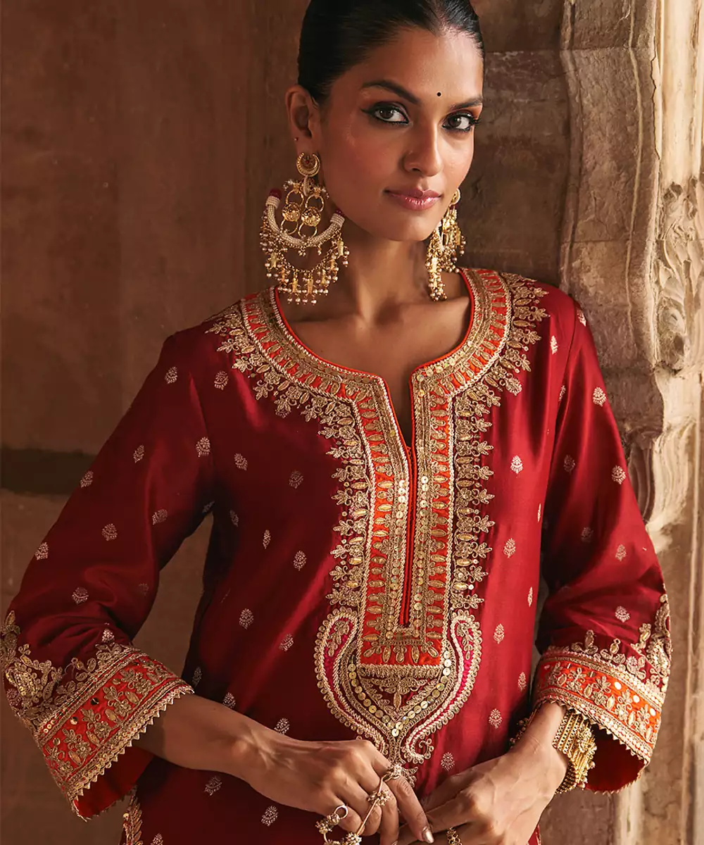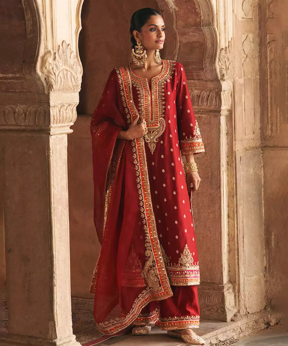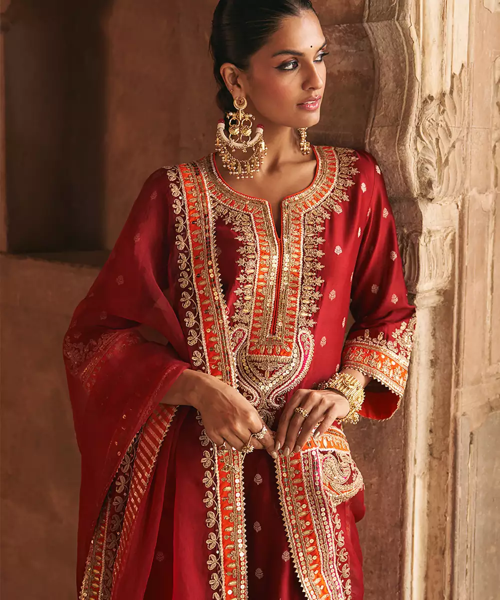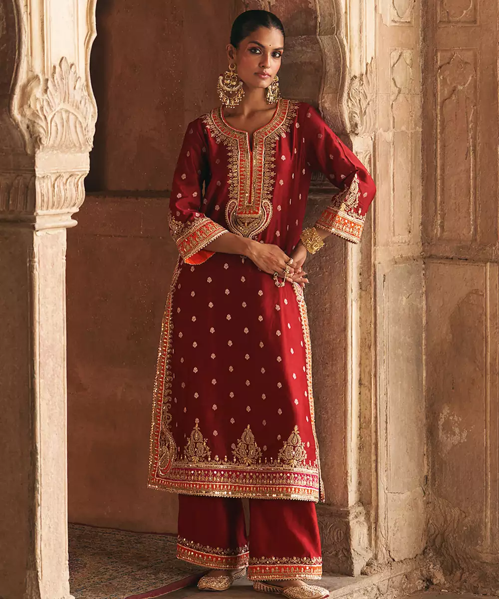 A Graceful Long A Line Kurta Paired With Palazzos And A Silk Organza Dupatta. The Kurta Features A Zero Neckline With Placket And Three Quarter Sleeves. Adorned With Intricate Kashmiri Tilla And Gota Patti Embroidery, Highlighted With Pearls And Sequins, The Ensemble Is Beautifully Finished With Delicate Gota Detailing.