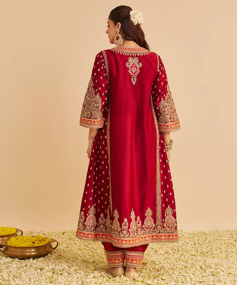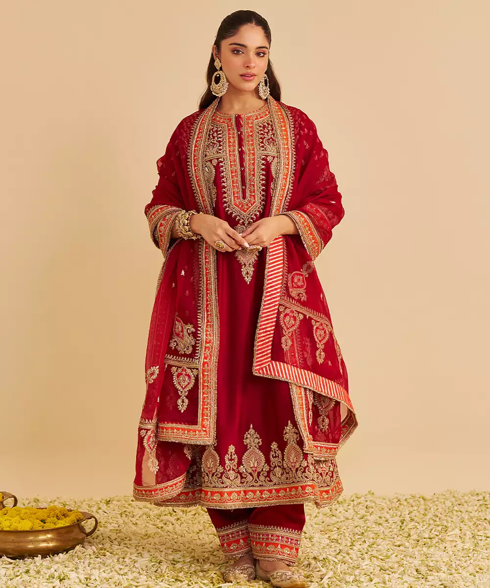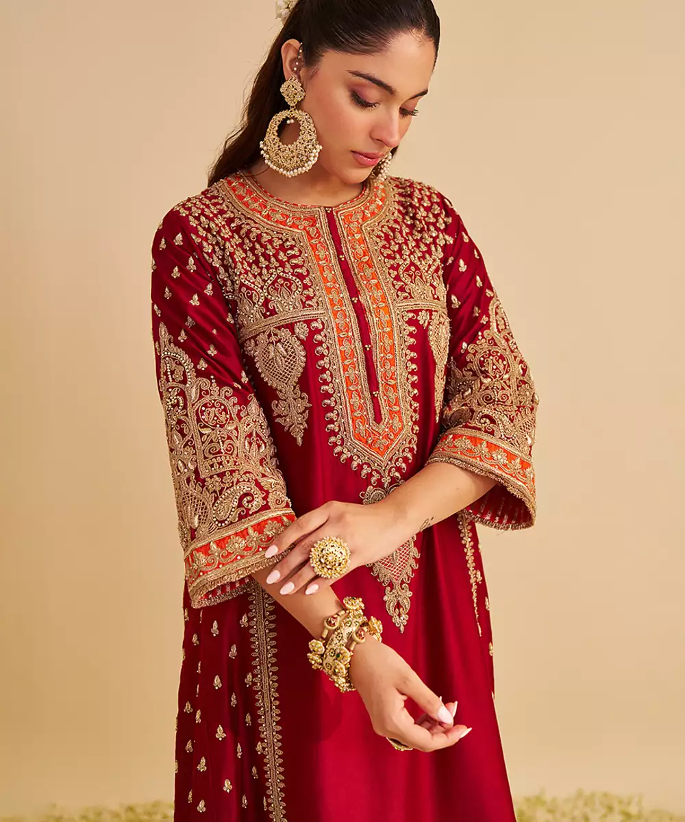 This Red Embroidered Silk Kurta Set With Dupatta Exudes Elegance And Festive Sophistication. Crafted From Luxurious Silk, It Features Intricate Embroidery That Enhances Its Refined Appeal. The Gracefully Tailored Kurta Paired With Coordinated Bottoms And A Matching Dupatta Creates A Regal Silhouette, Perfect For Weddings, Celebrations, Or Special Occasions.