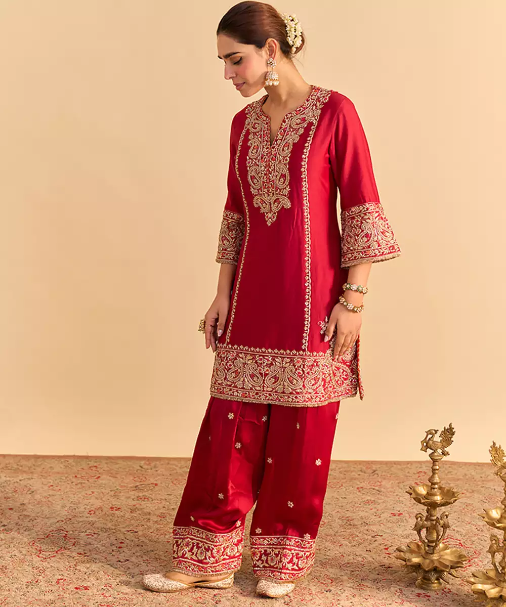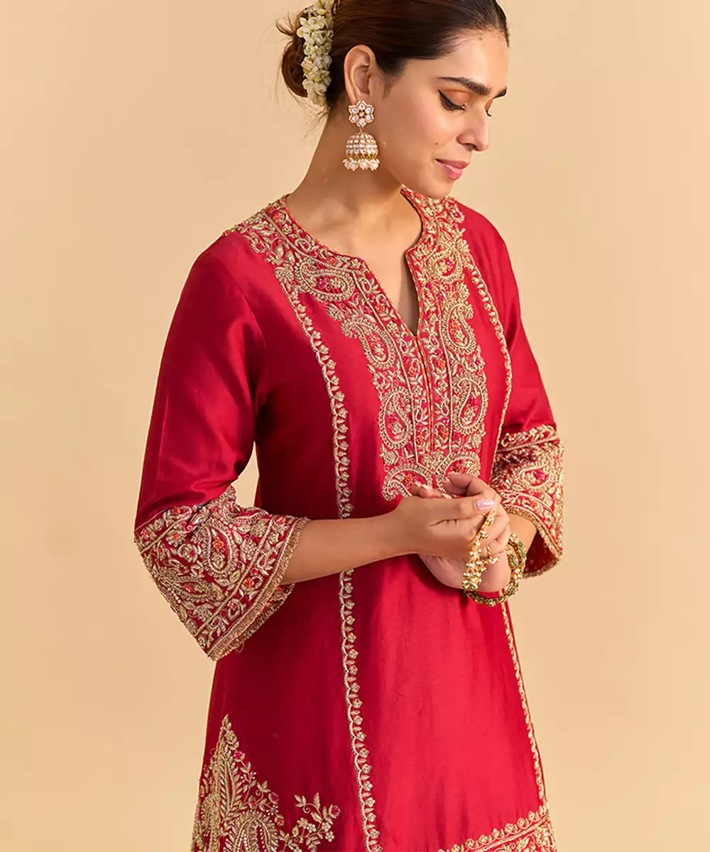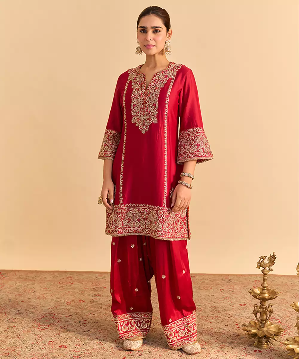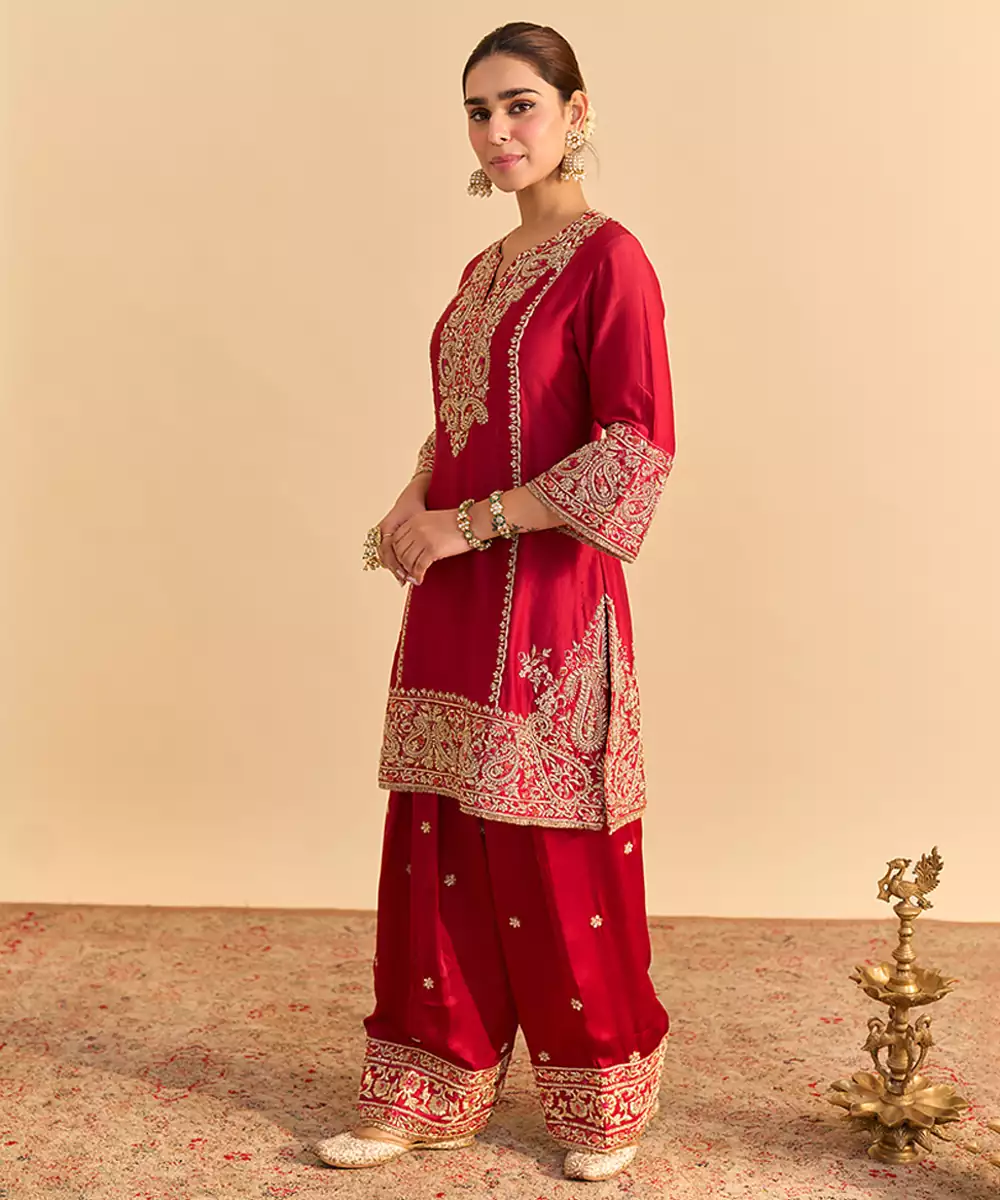 This Red Embroidered Silk Kurta Set With Dupatta Exudes Regal Elegance And Festive Charm. Crafted From Luxurious Silk Fabric, It Features Intricate Embroidery That Adds A Rich, Refined Touch. Paired With A Matching Dupatta, It Offers A Graceful Silhouette, Premium Comfort, And Timeless Ethnic Appeal For Celebrations.