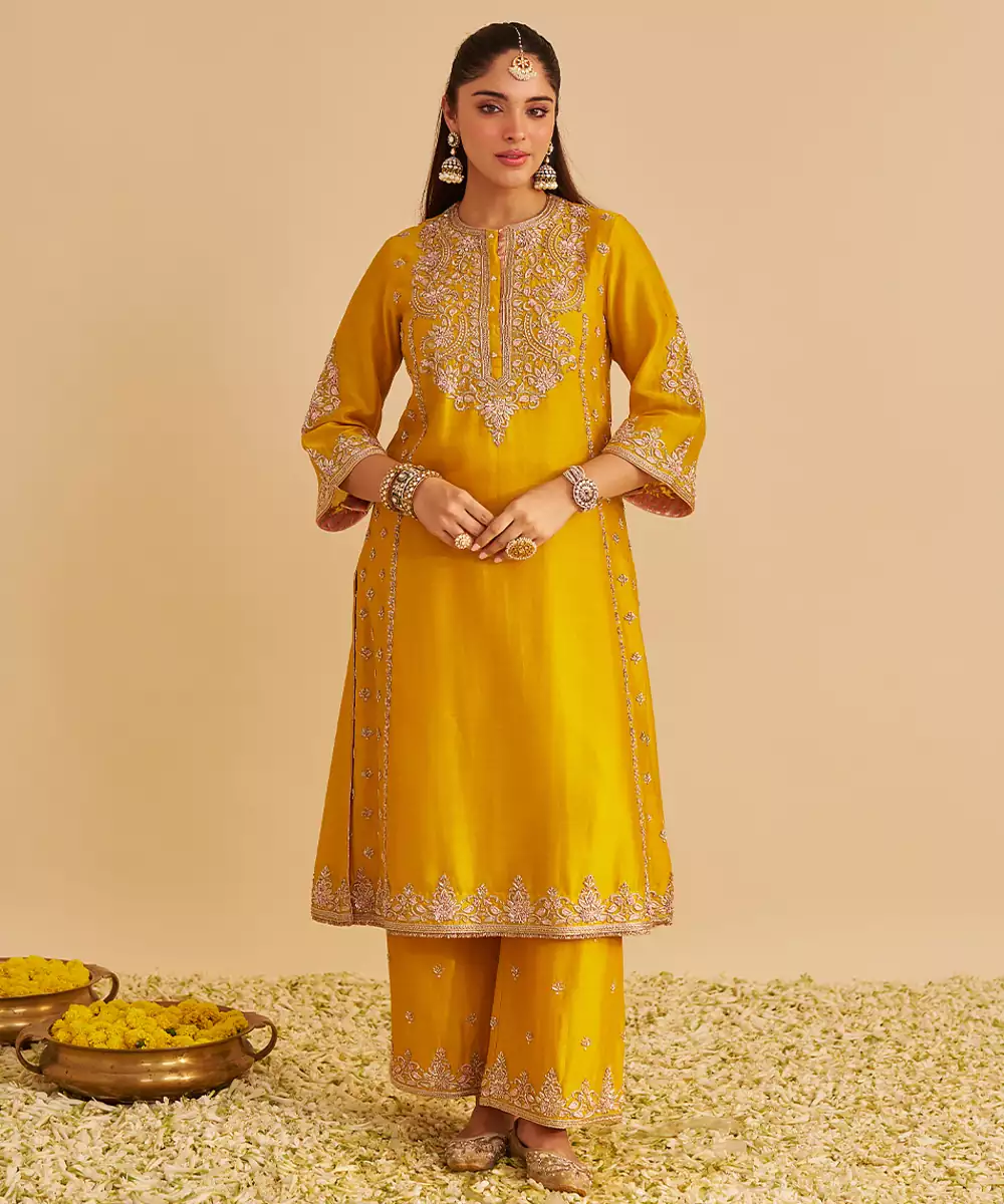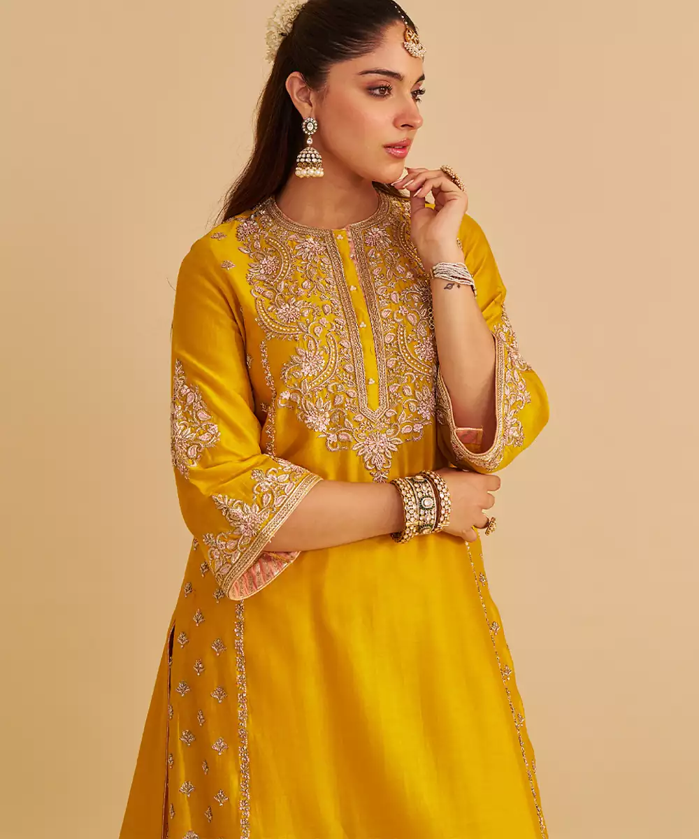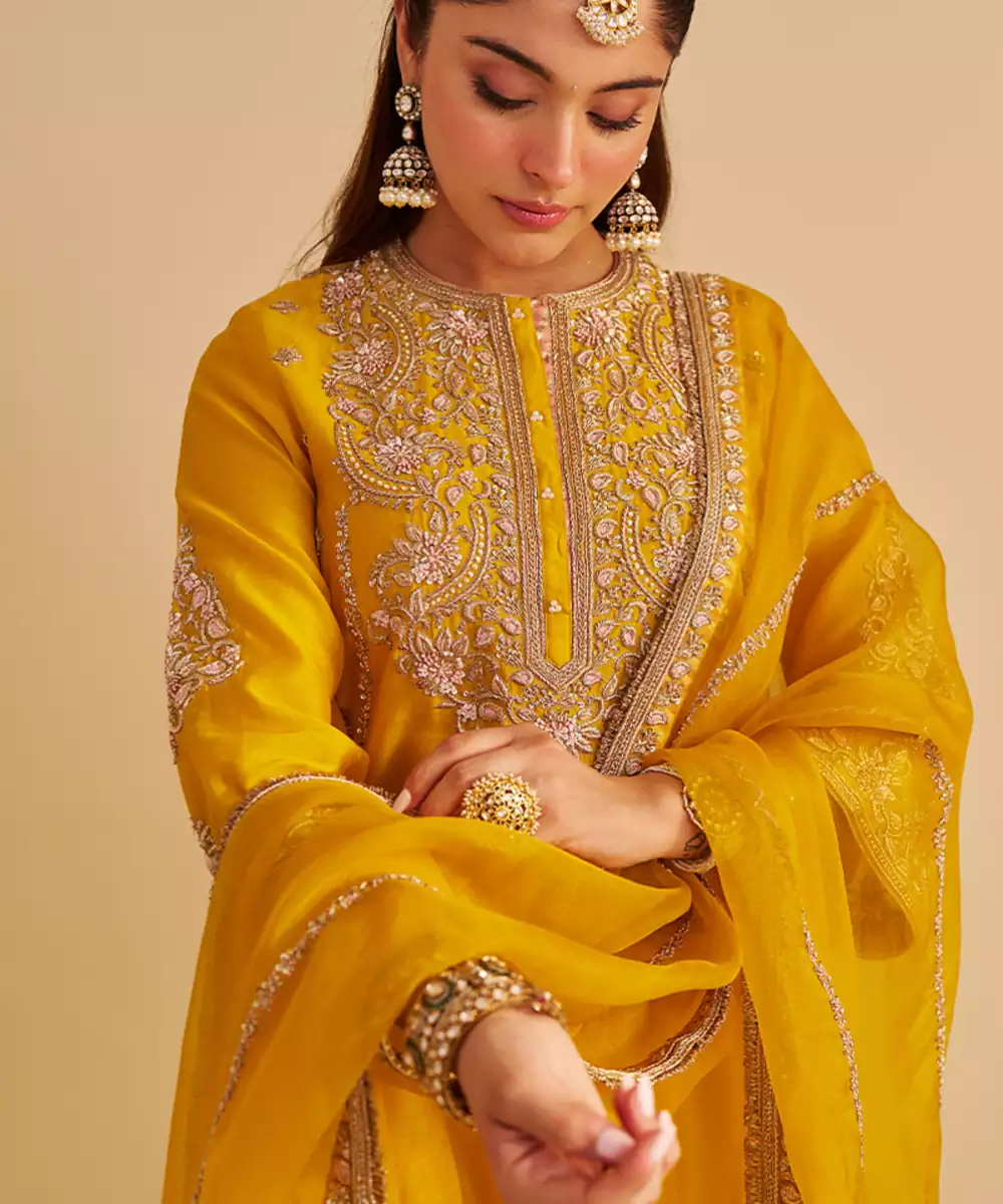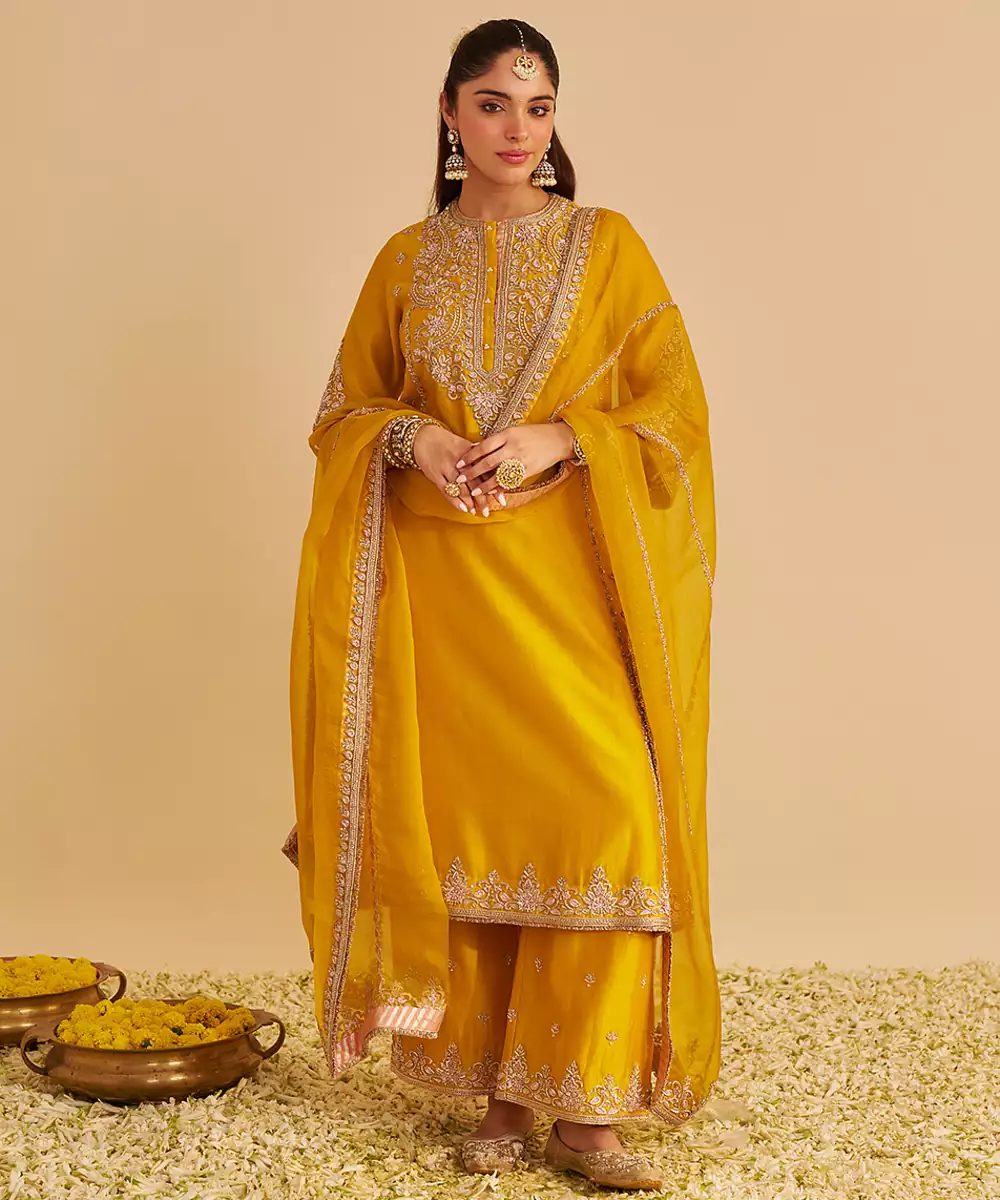 This Yellow Embroidered Silk Kurta Set With Dupatta Exudes Elegance And Festive Sophistication. Crafted From Luxurious Silk, It Features Intricate Embroidery That Enhances Its Refined Appeal. The Gracefully Tailored Kurta Paired With Coordinated Bottoms And A Matching Dupatta Creates A Regal Silhouette, Perfect For Weddings, Celebrations, Or Special Occasions.