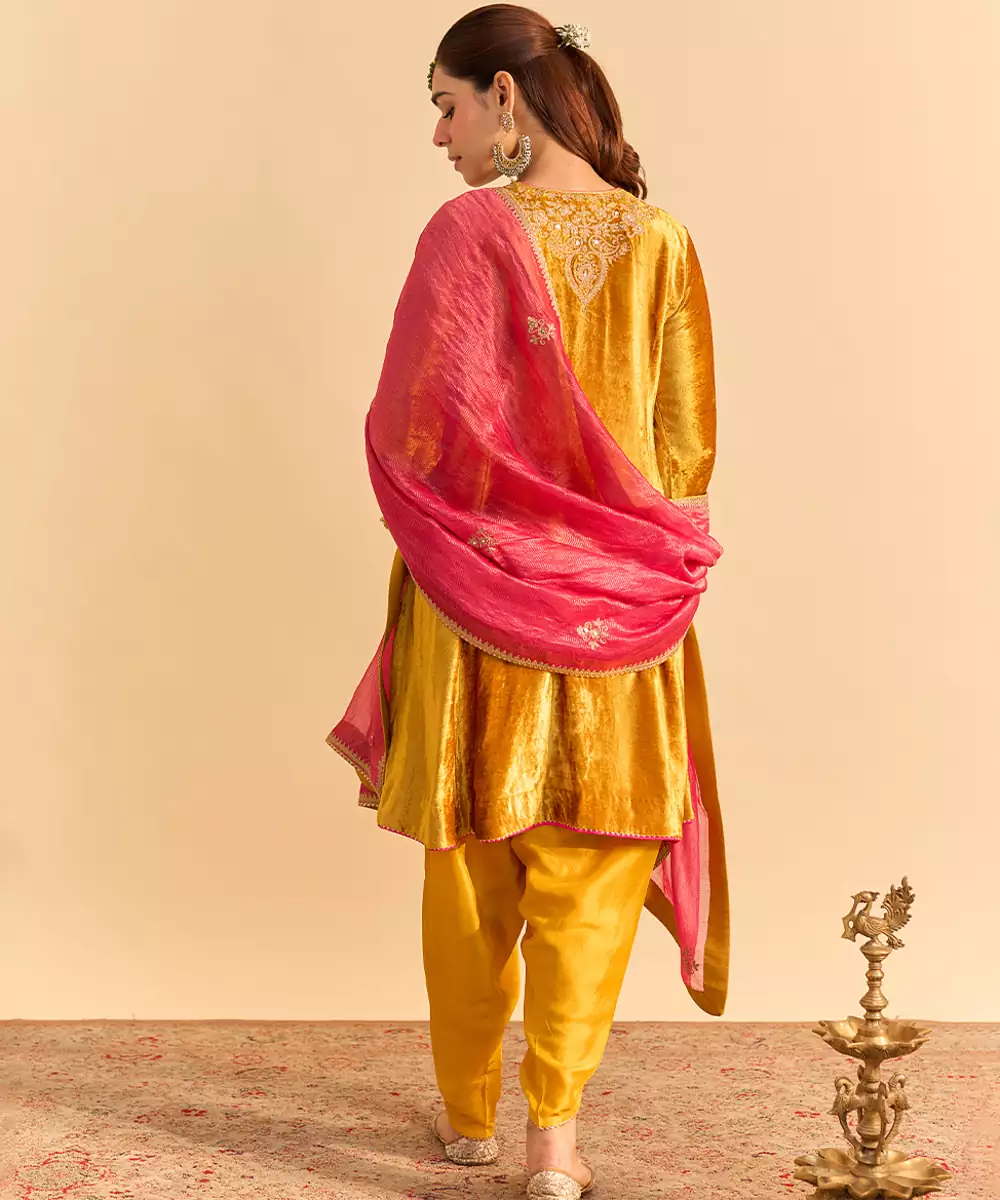 Yellow Embroidered Velvet Kurta Set With Dupatta