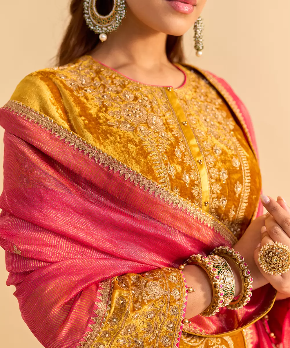 This Yellow Embroidered Velvet Kurta Set With Dupatta Exudes Regal Elegance And Festive Charm. Crafted From Rich Velvet Fabric, It Features Intricate Embroidery That Adds A Luxurious, Refined Touch. Paired With A Matching Dupatta, It Offers A Graceful Silhouette, Premium Comfort, And Timeless Ethnic Appeal For Special Occasions.