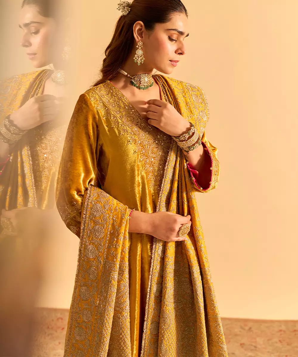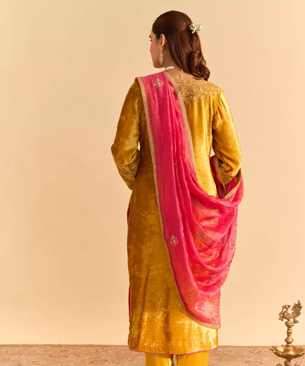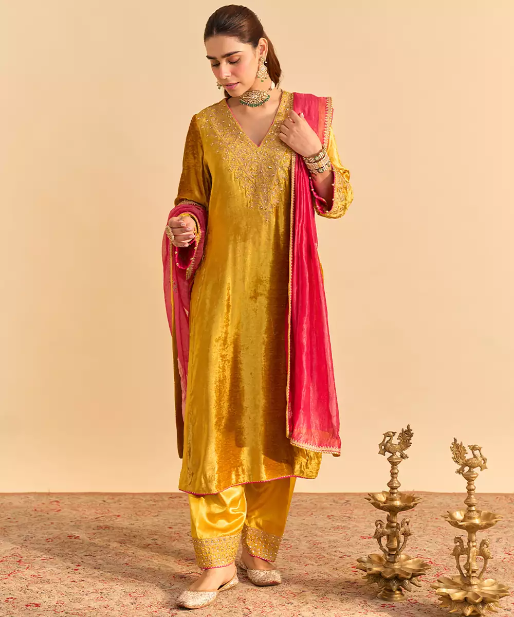 This Yellow Embroidered Velvet Kurta Set With Dupatta Exudes Regal Elegance And Festive Charm. Crafted From Rich Velvet Fabric, It Features Intricate Embroidery That Adds A Luxurious, Refined Touch. Paired With A Matching Dupatta, It Offers A Graceful Silhouette, Premium Comfort, And Timeless Ethnic Appeal For Special Occasions.
