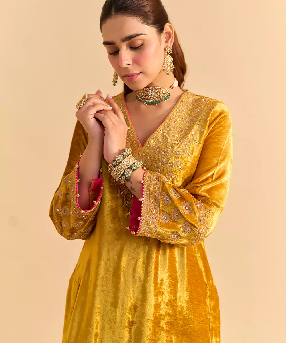 This Yellow Embroidered Velvet Kurta Set Exudes Regal Elegance And Festive Charm. Crafted From Rich Velvet Fabric, It Features Intricate Embroidery That Adds A Luxurious, Refined Touch. Perfect For Weddings And Celebrations, It Offers A Graceful Silhouette, Premium Comfort, And Timeless Ethnic Appeal.