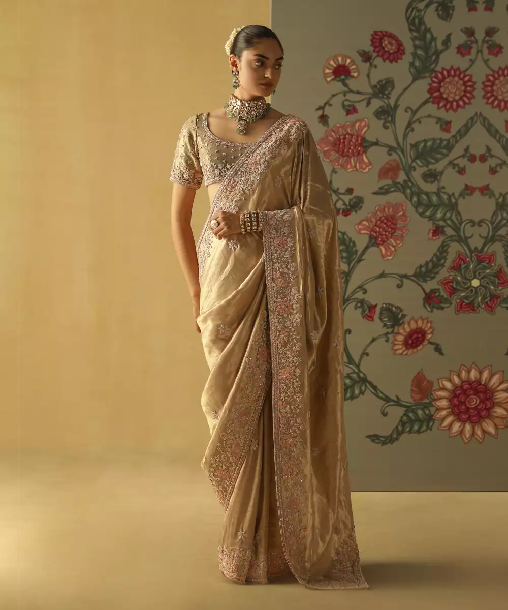 Our Zeenat Saree Is Crafted From Luxurious Silk Brocade Threads, Adorned With Detailed Dabka Zardozi Embroidery. It Comes With A Matching Silk Brocade Blouse, Also Intricately Embroidered.
