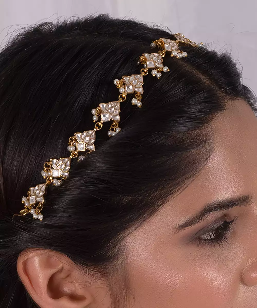 Shlok Jewels Designs This Old World Charm Headgear With Kundan Jadau And Pearl Detailing, Crafted In Gold Plating. Style It With A Cape And Pant Set For The Occasion.