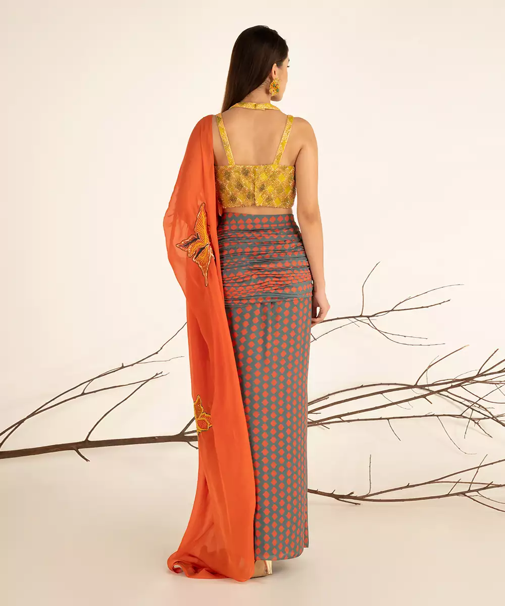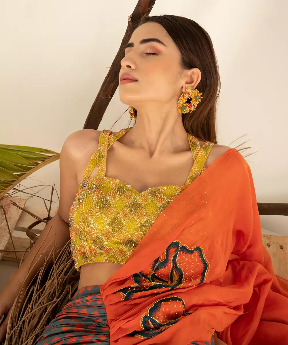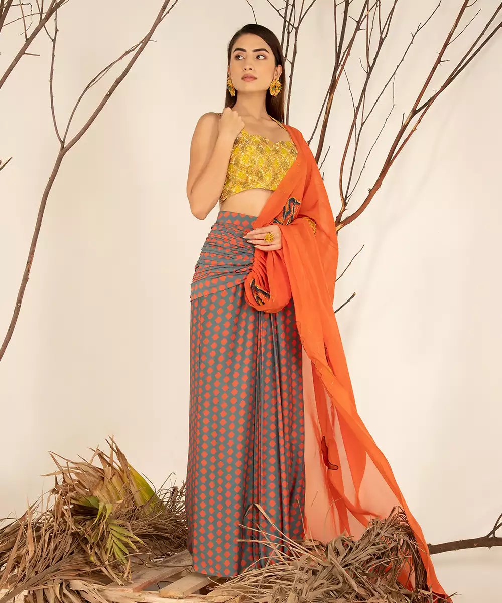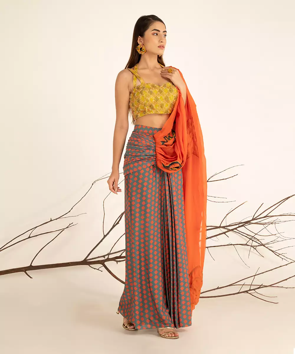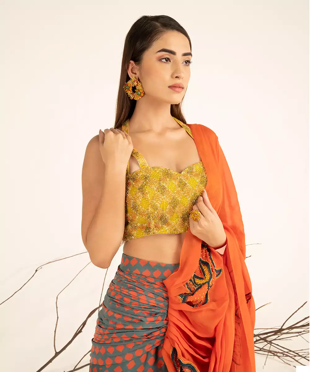 Hand Embroidery (Sequence, Tubelights, Beads, Thread, Cutdana), Rain Drop Geometry Print, Turf Green, Shocking Orange And Blazing Yellow, 2 Piece Set, Sweetheart Neckline, Hook Eye And Zip Closure