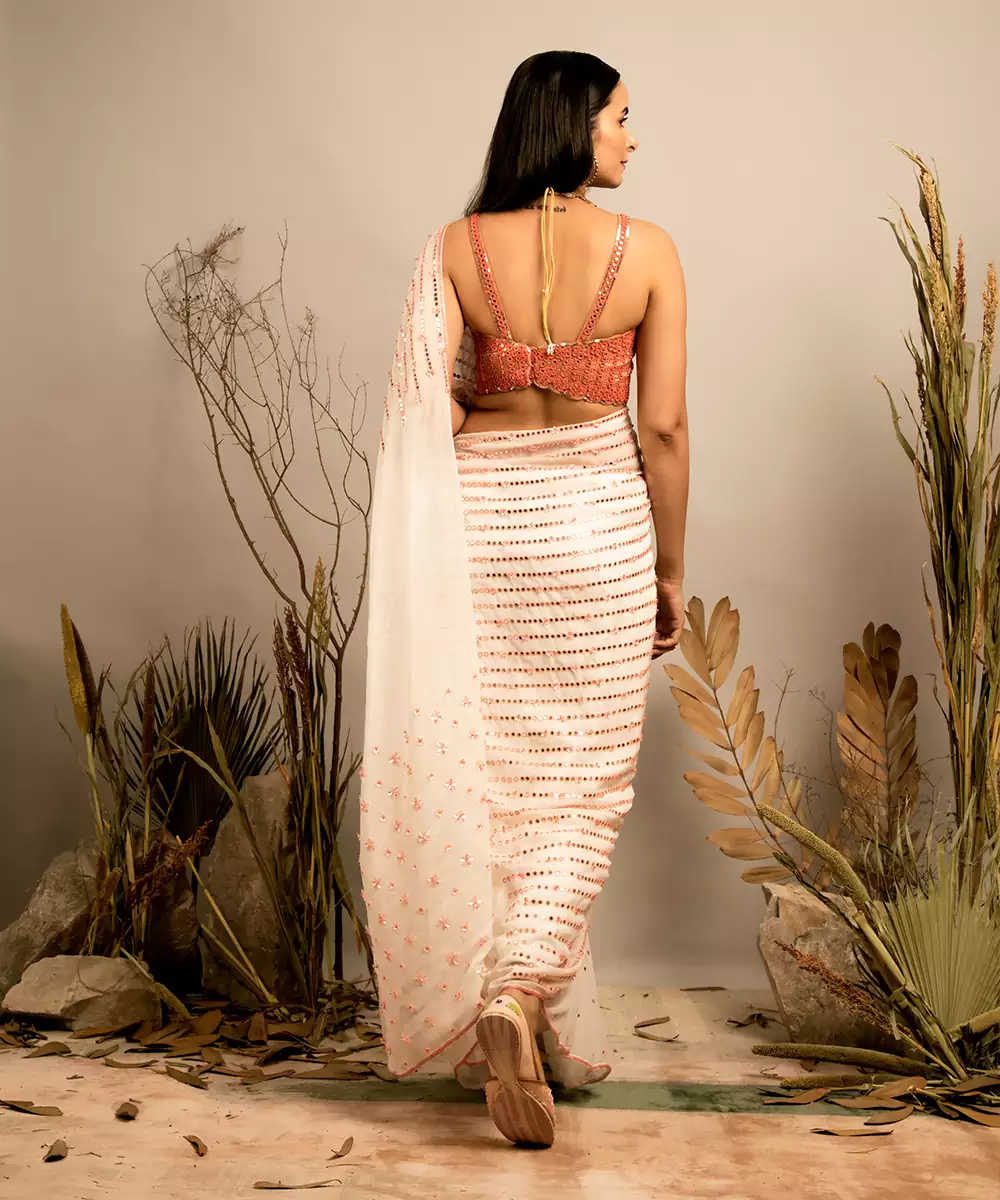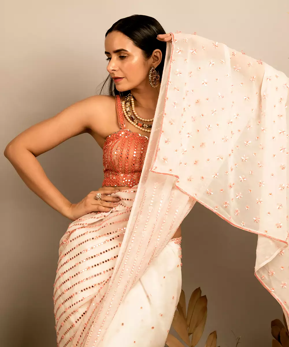 Hand Embroidery(Mirror, Cutdana, Thread, Beads, Sequence, Flowers), Cantaloupe And White, 2 Pieces Set, Sweetheart, Zip And Hook Eye Closure.