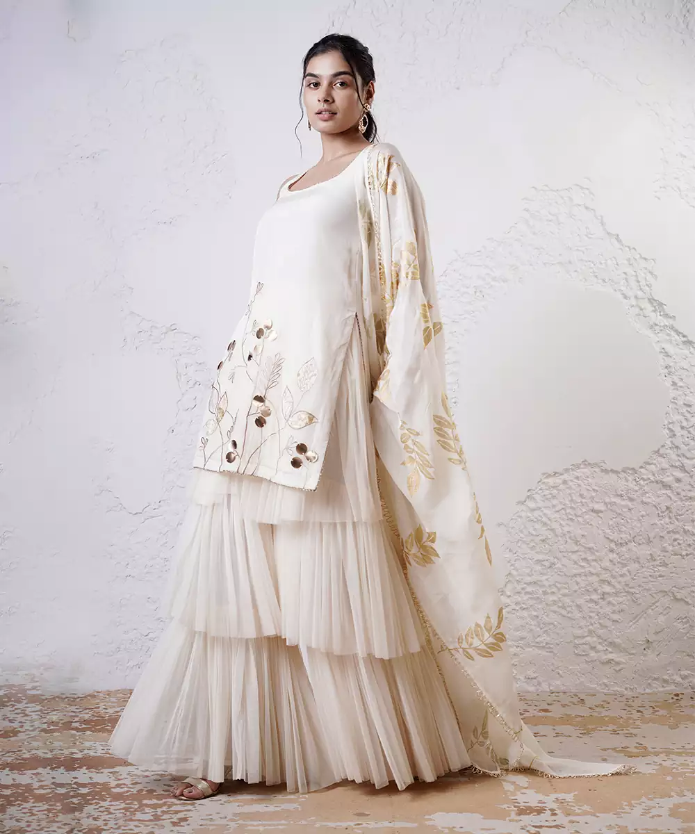 Foil Printed Kurta With Straigh Pants And Dupatta Colour: Ivory Fabric: Organza Components: 3 (Kurta,Pant,Dupatta) Work: Printed