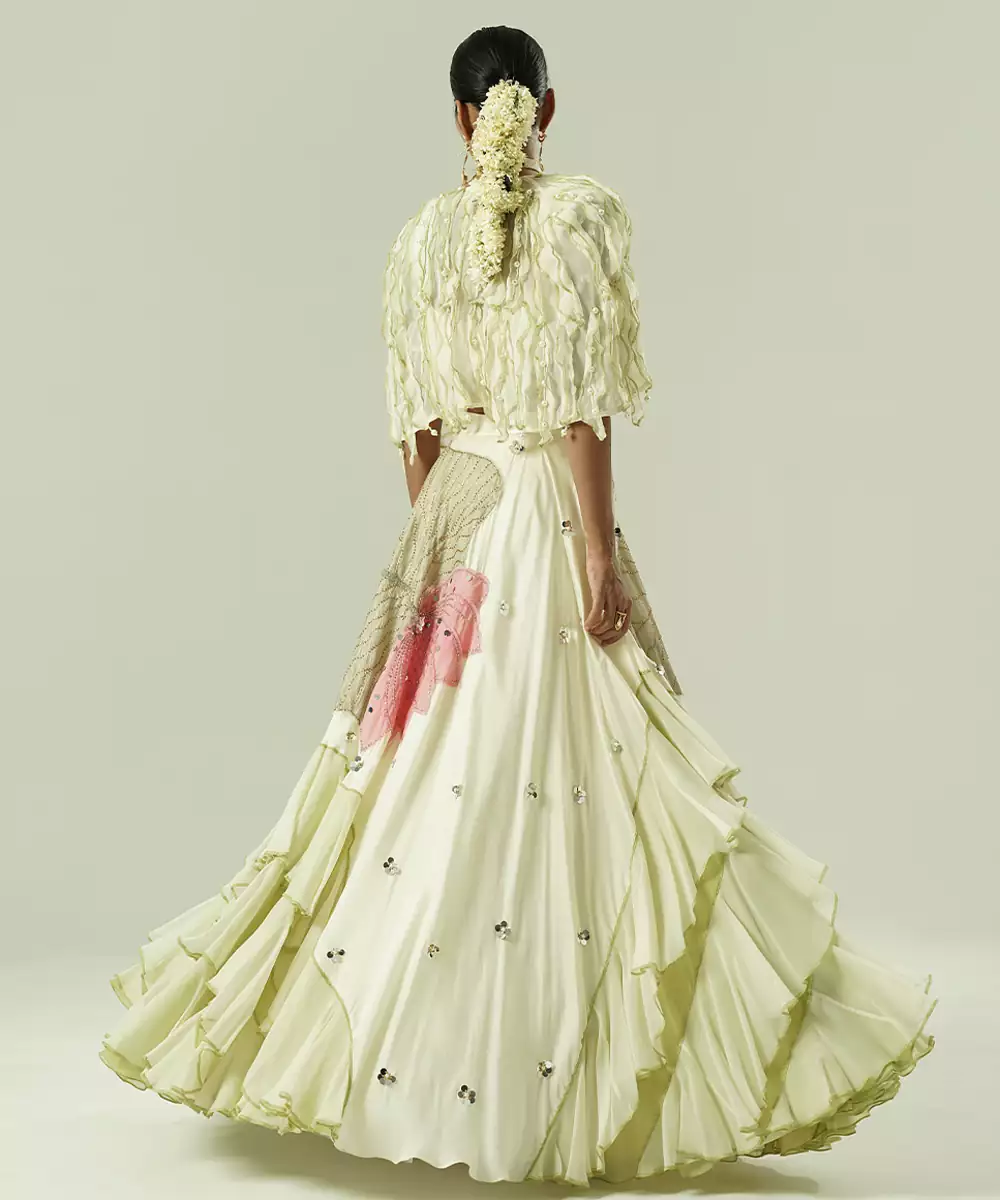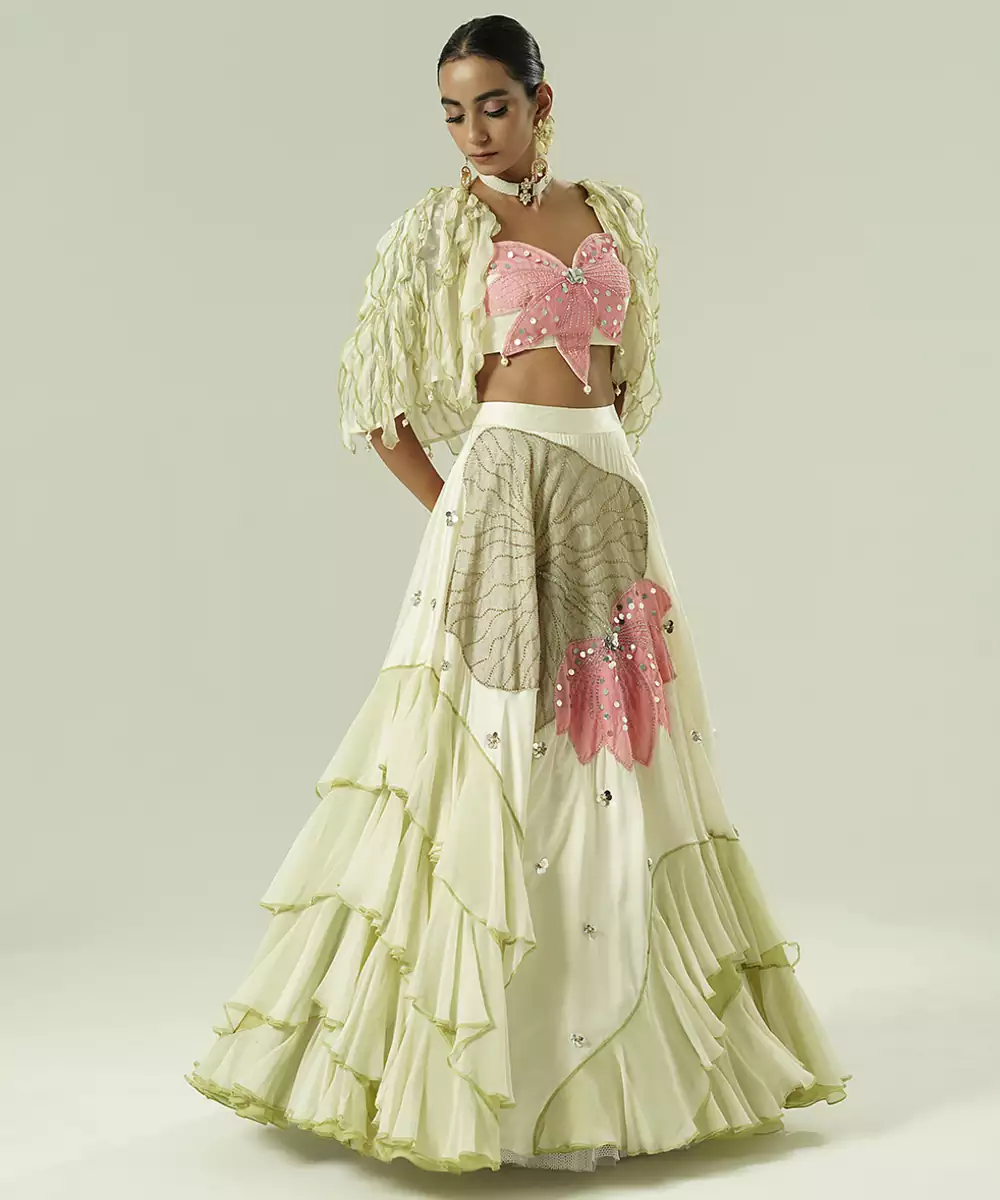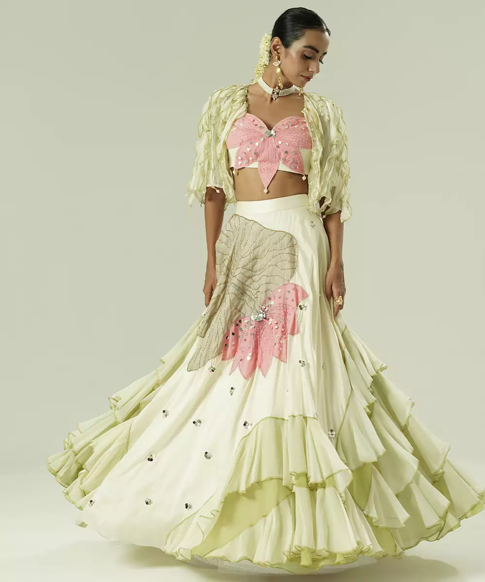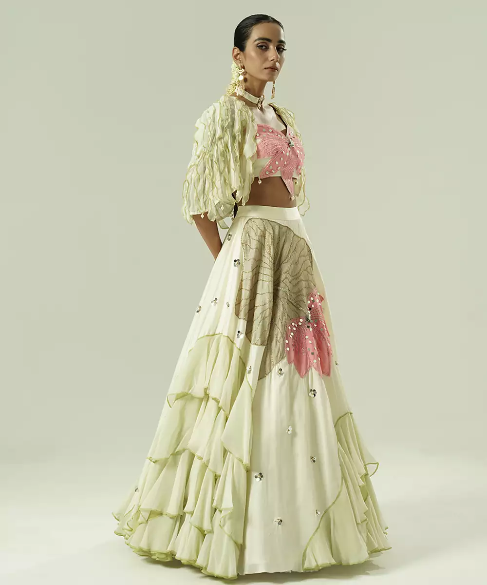 Components: 1 Blouse / 1 Lehenga / 1 Cape
