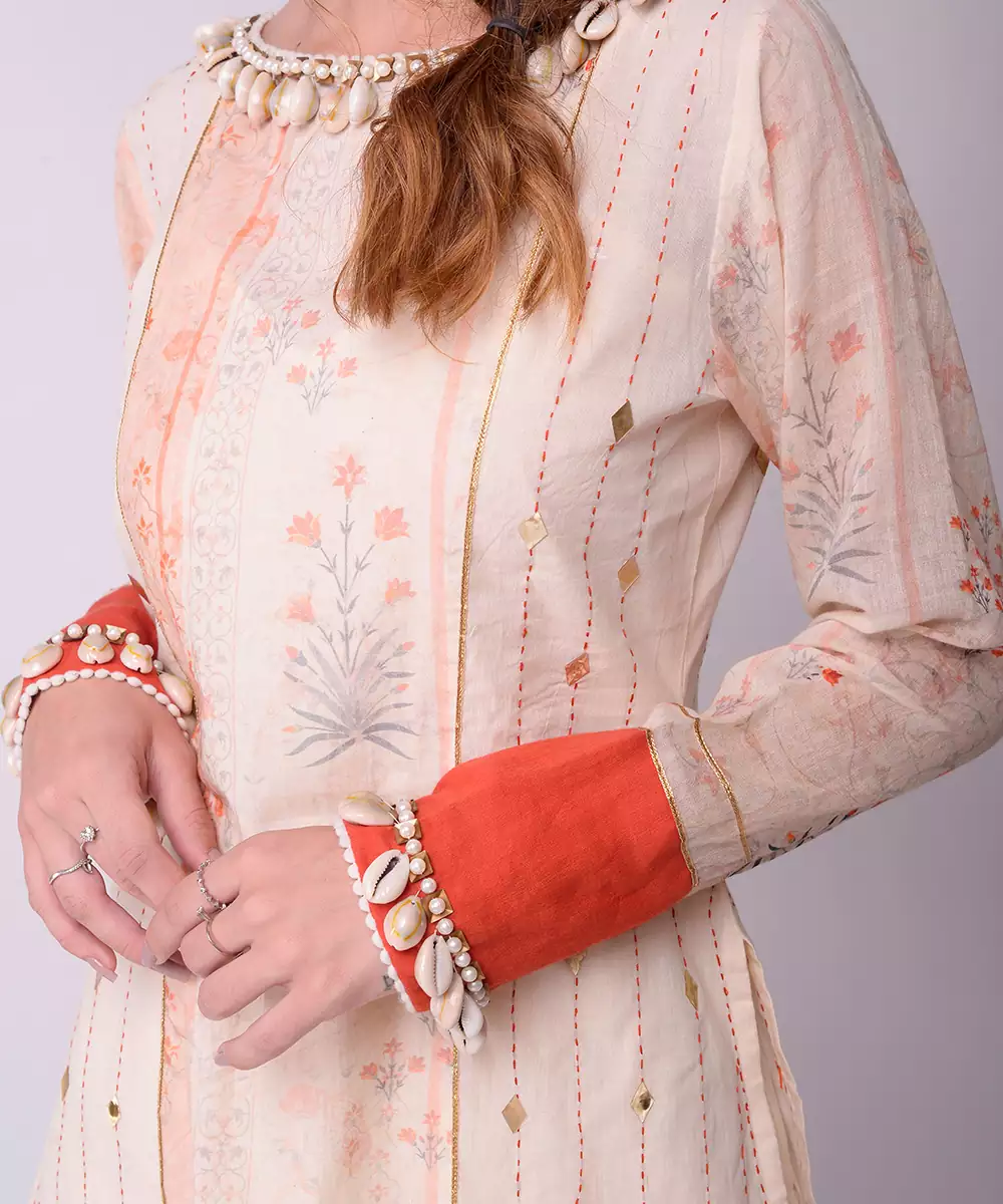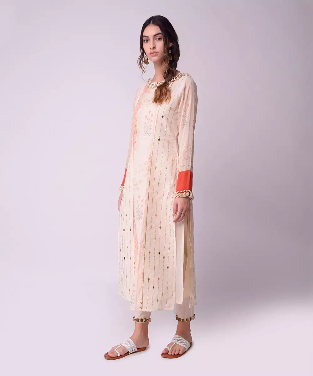 Printed Panel Straight Kurta With Cropped Pants And Dupatta. Kantha Details With Mirror, Embroidered Neck And Sleeves Hem, Boat Neck.
